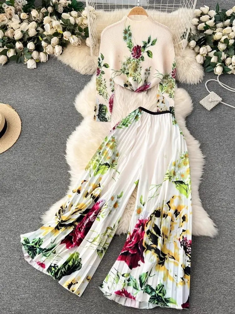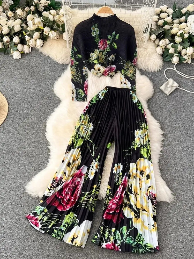 2024 Fashion Miyake Pleated Hot Two Piece Set Gradient Flower Printing High Neck Stretch Top And Wide Leg Pants Trouser Suits