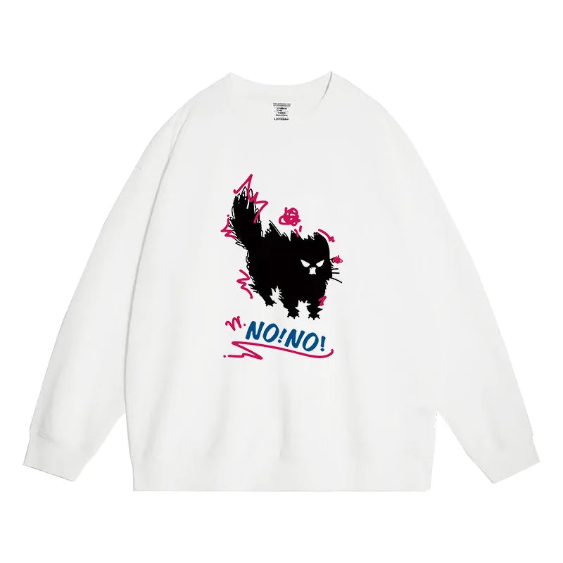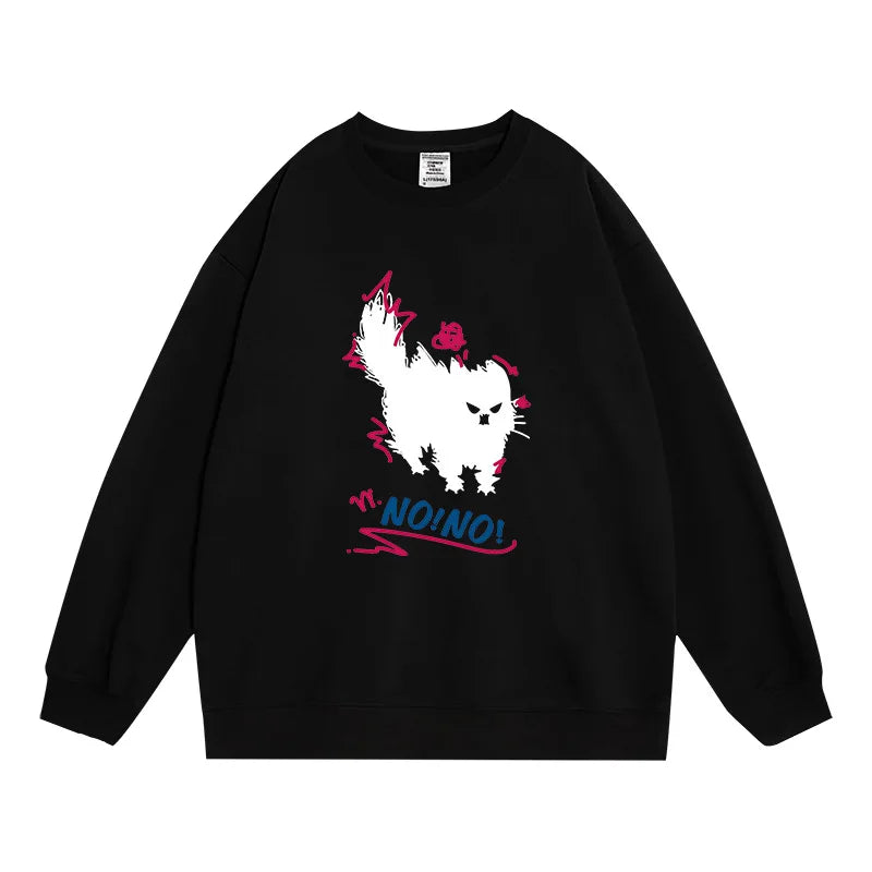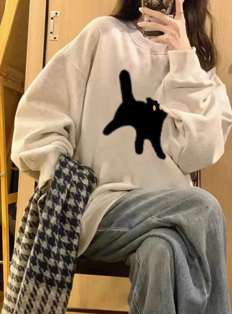 2024 Spring Autumn Unisex Cartoon Cat Printed Pullover Round Neck Long Sleeved baggey Pullovers Casual Cute Couple Street Top