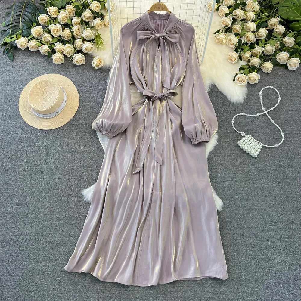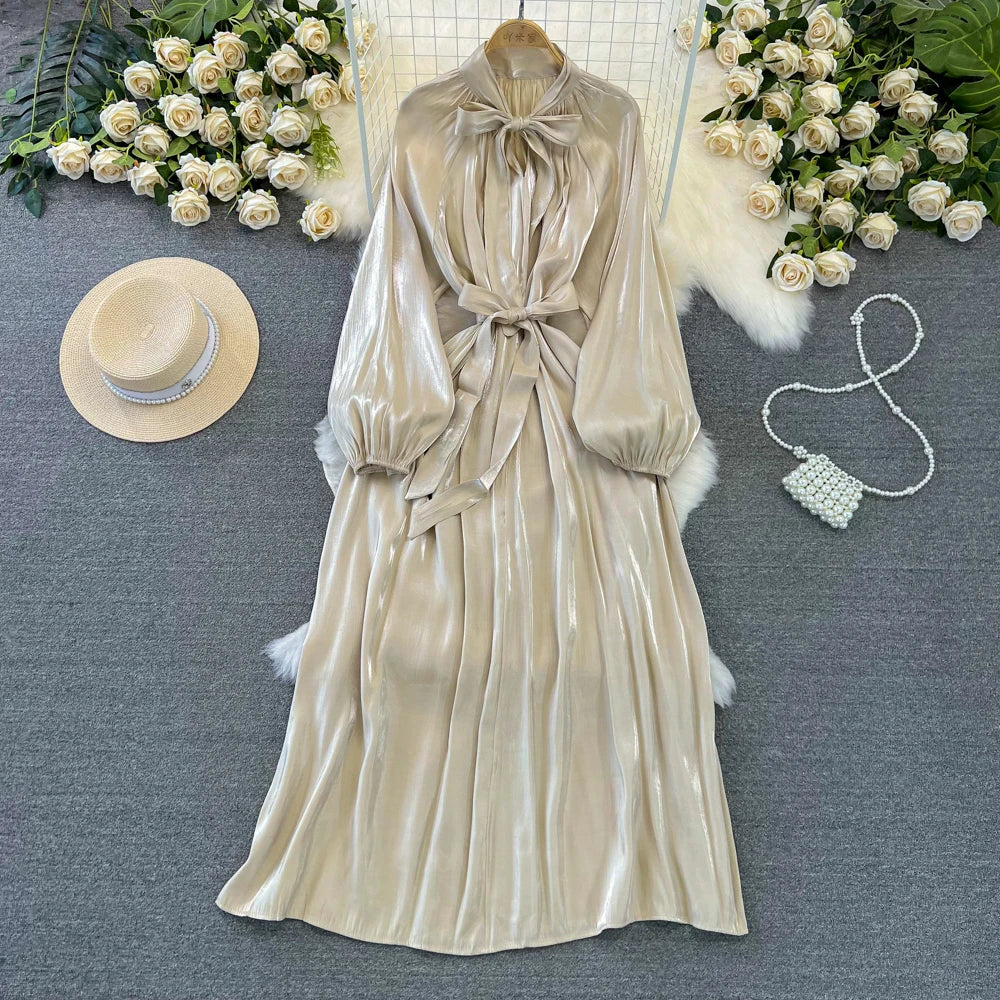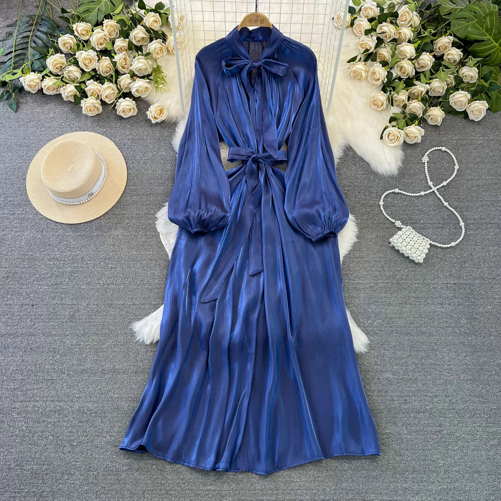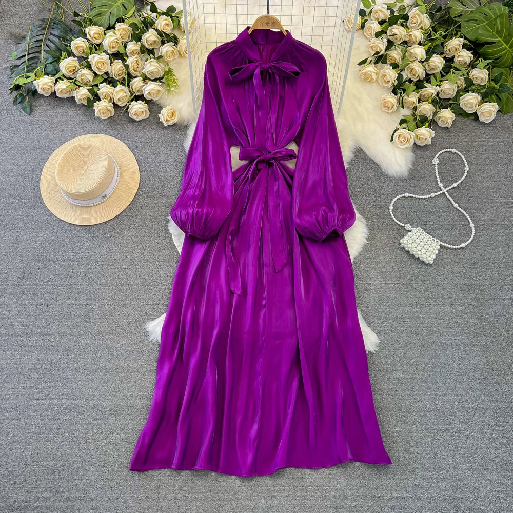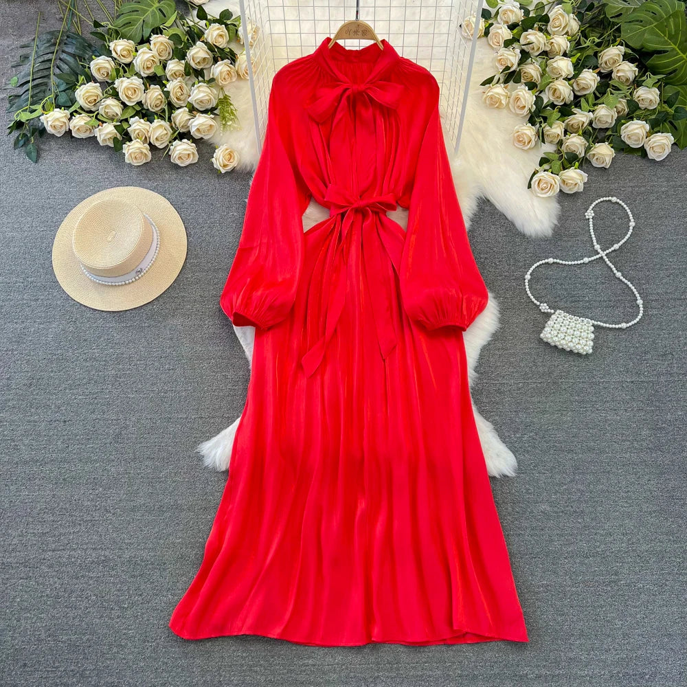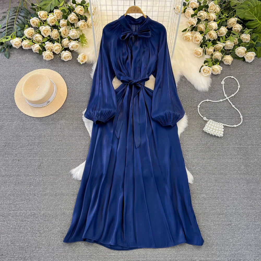 Autumn Elegant Women Fashion Party Long Dress Bow Lace Up Long Sleeve Evening Dresses A-Line Casual Vestidos One Piece Prom Robe