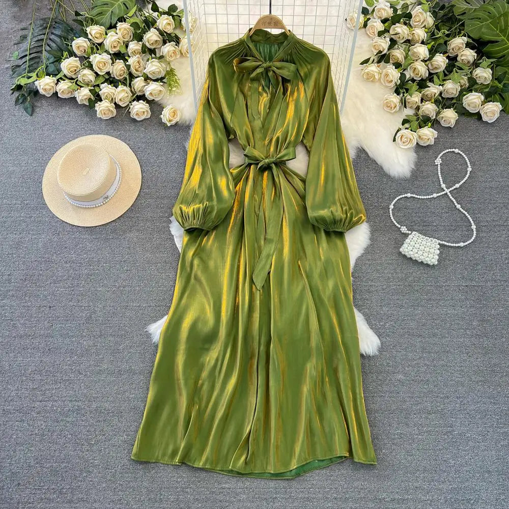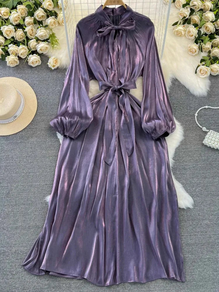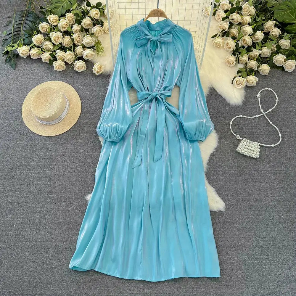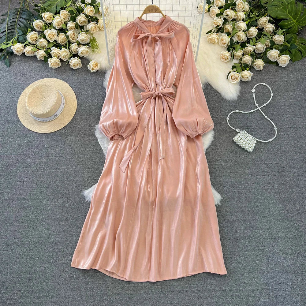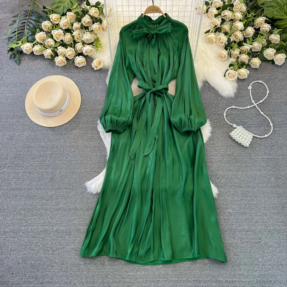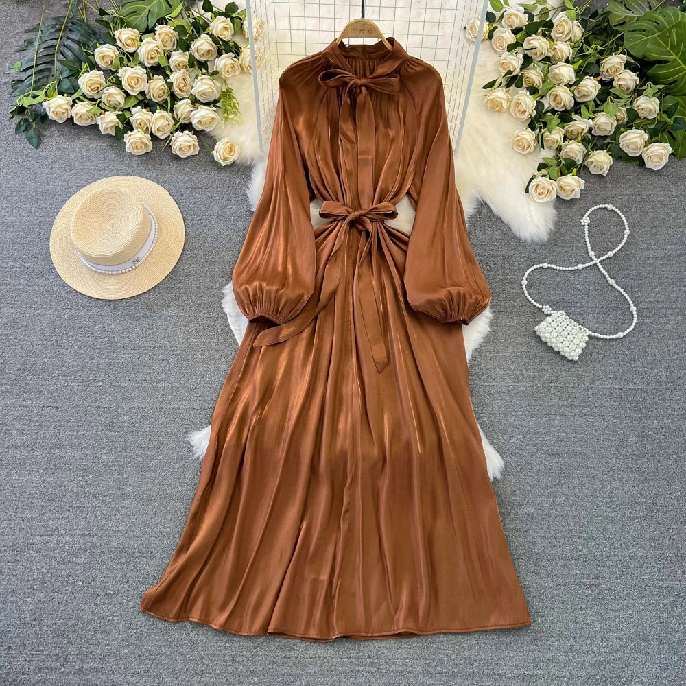 Autumn Elegant Women Fashion Party Long Dress Bow Lace Up Long Sleeve Evening Dresses A-Line Casual Vestidos One Piece Prom Robe