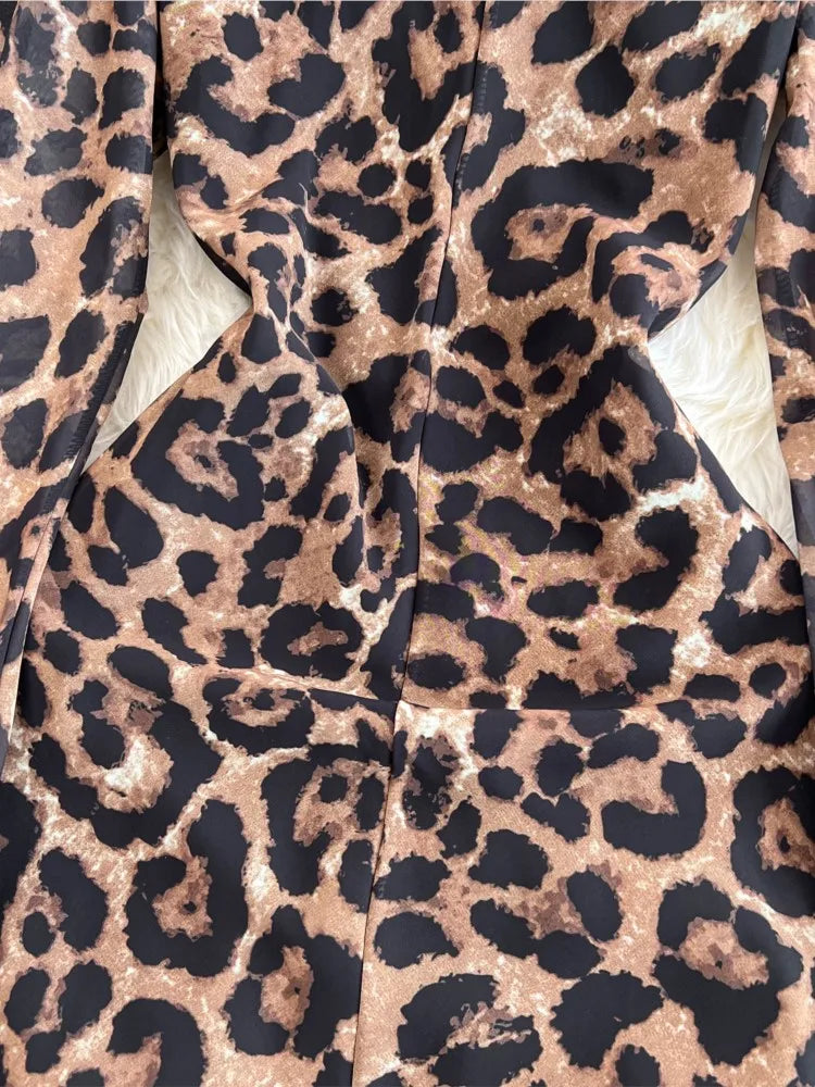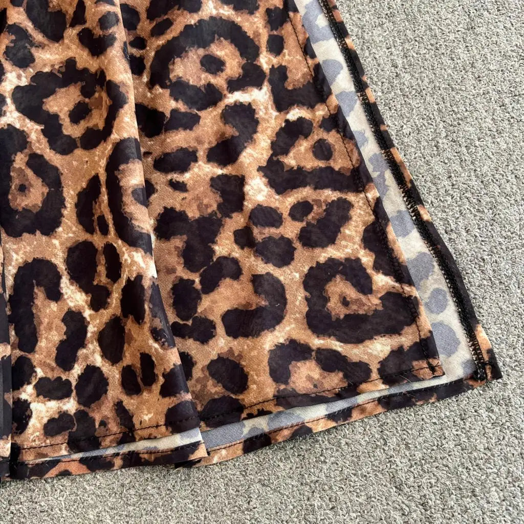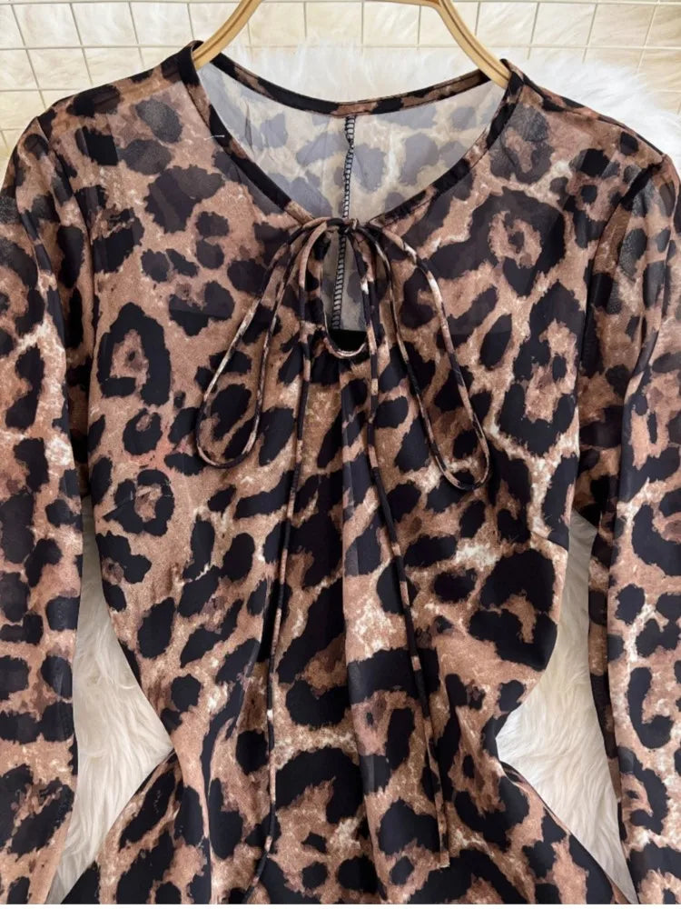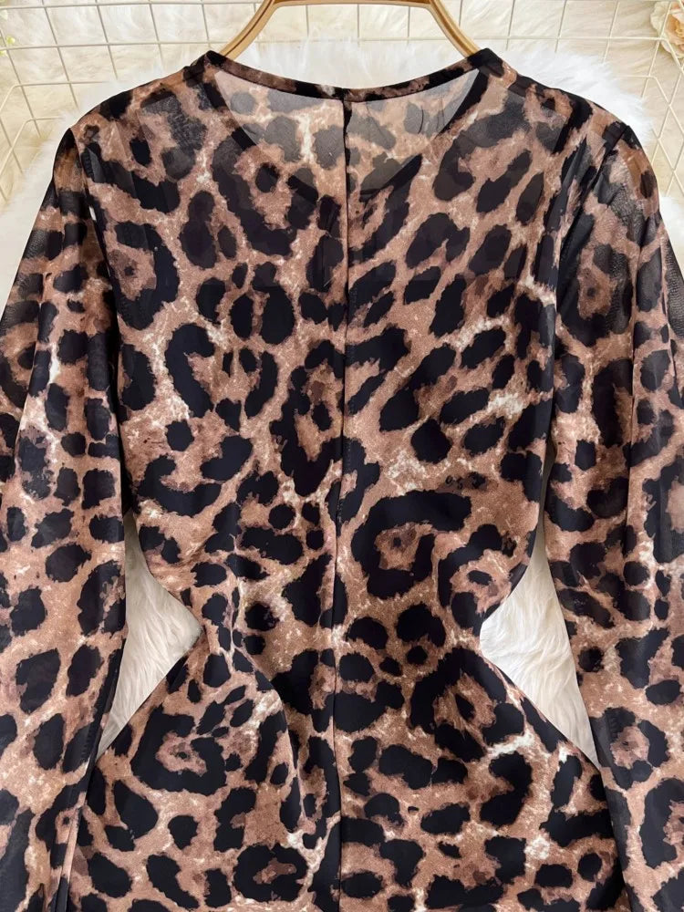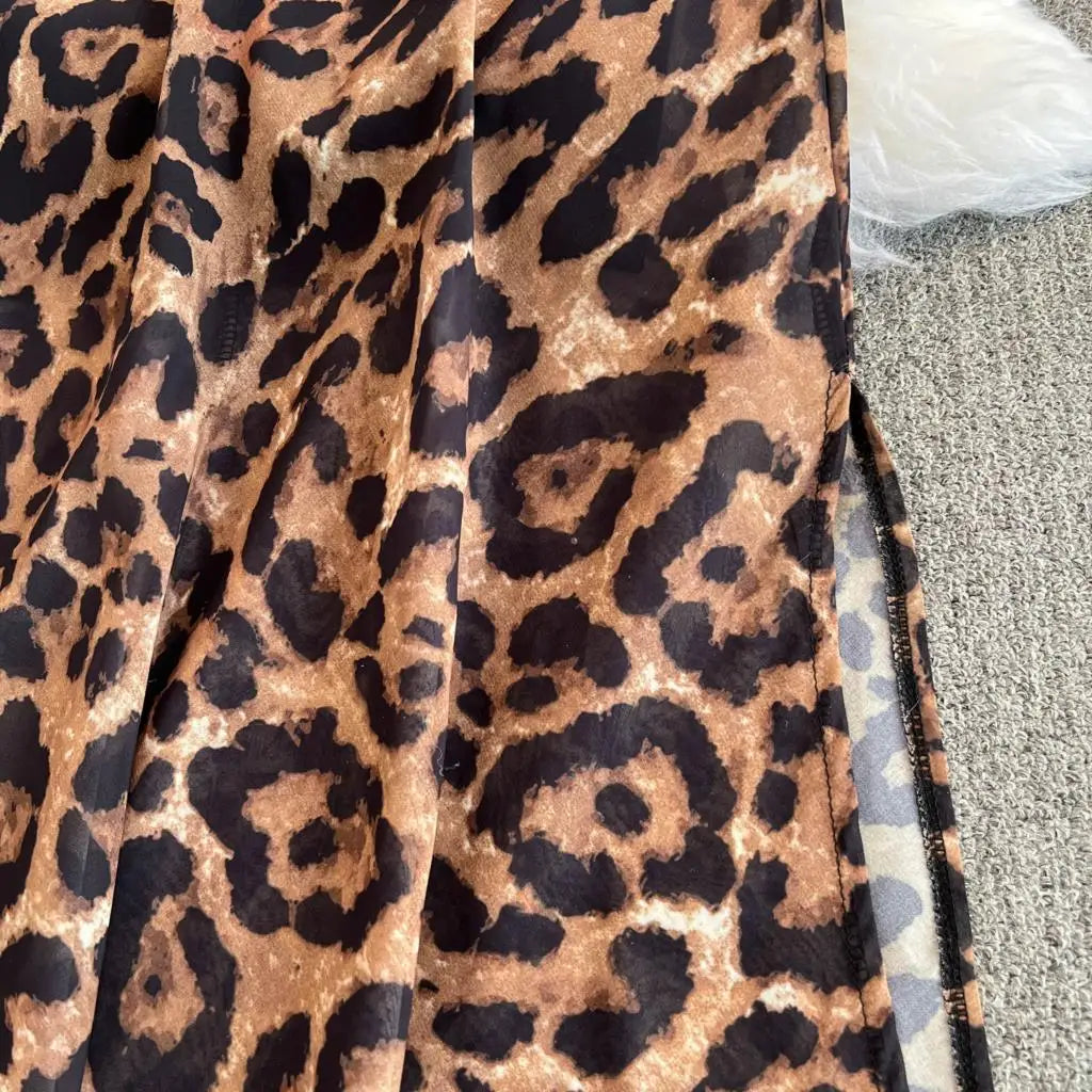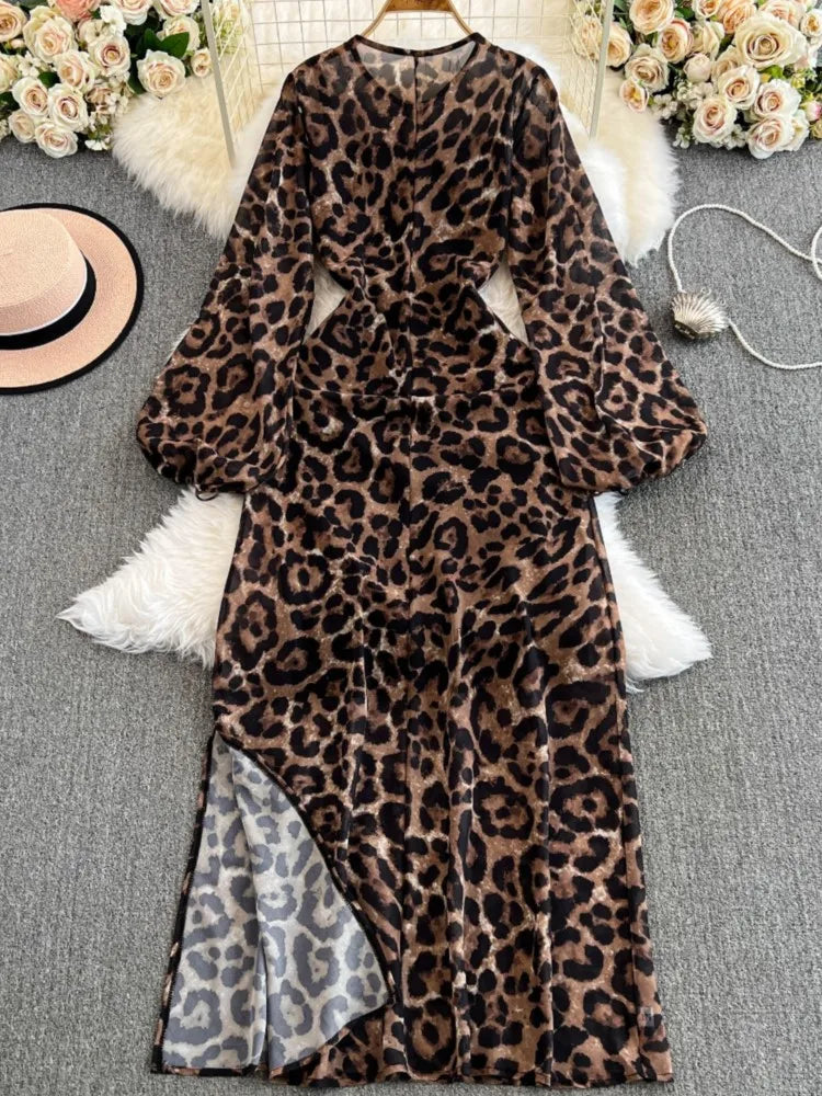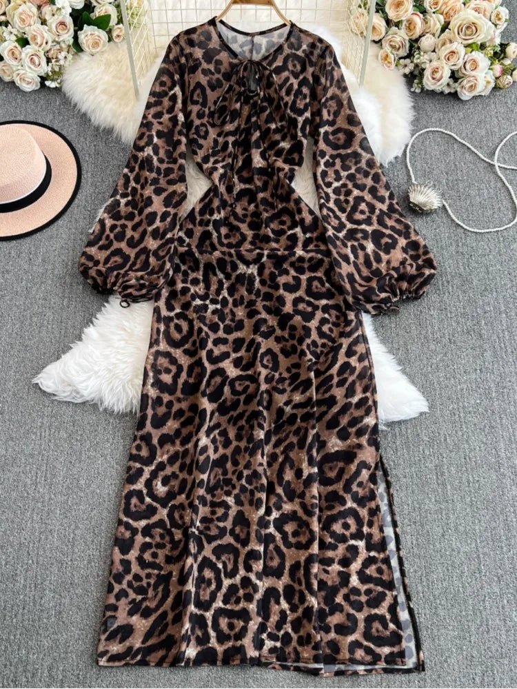 Autumn Elegant Women Leopard Print Long Sleeve Dress Casual Loose A-Line Slit Evening Dresses New Fashion Vintage Vestido Mujers