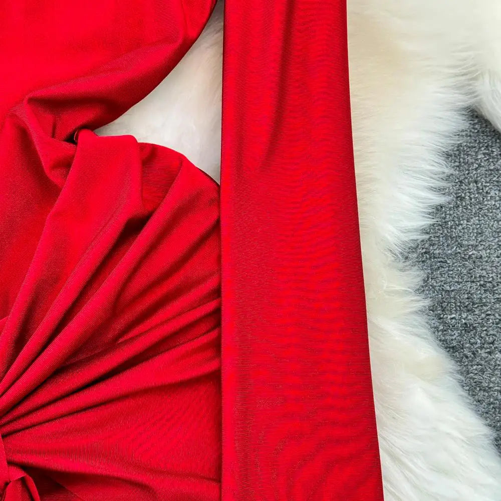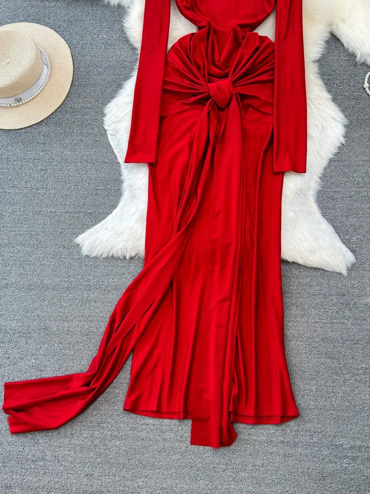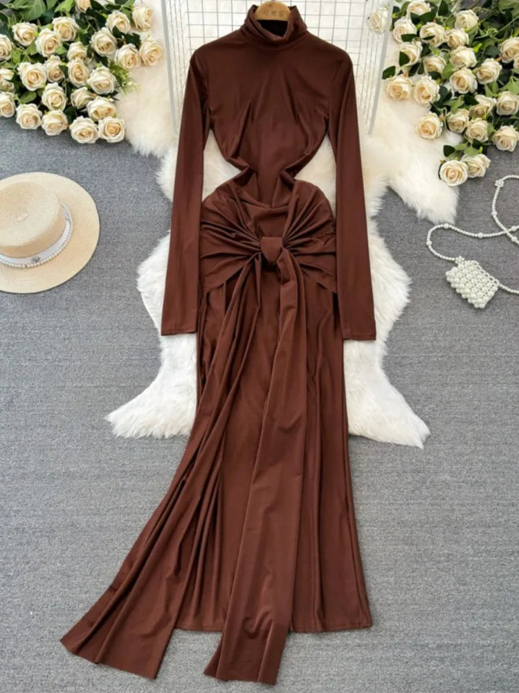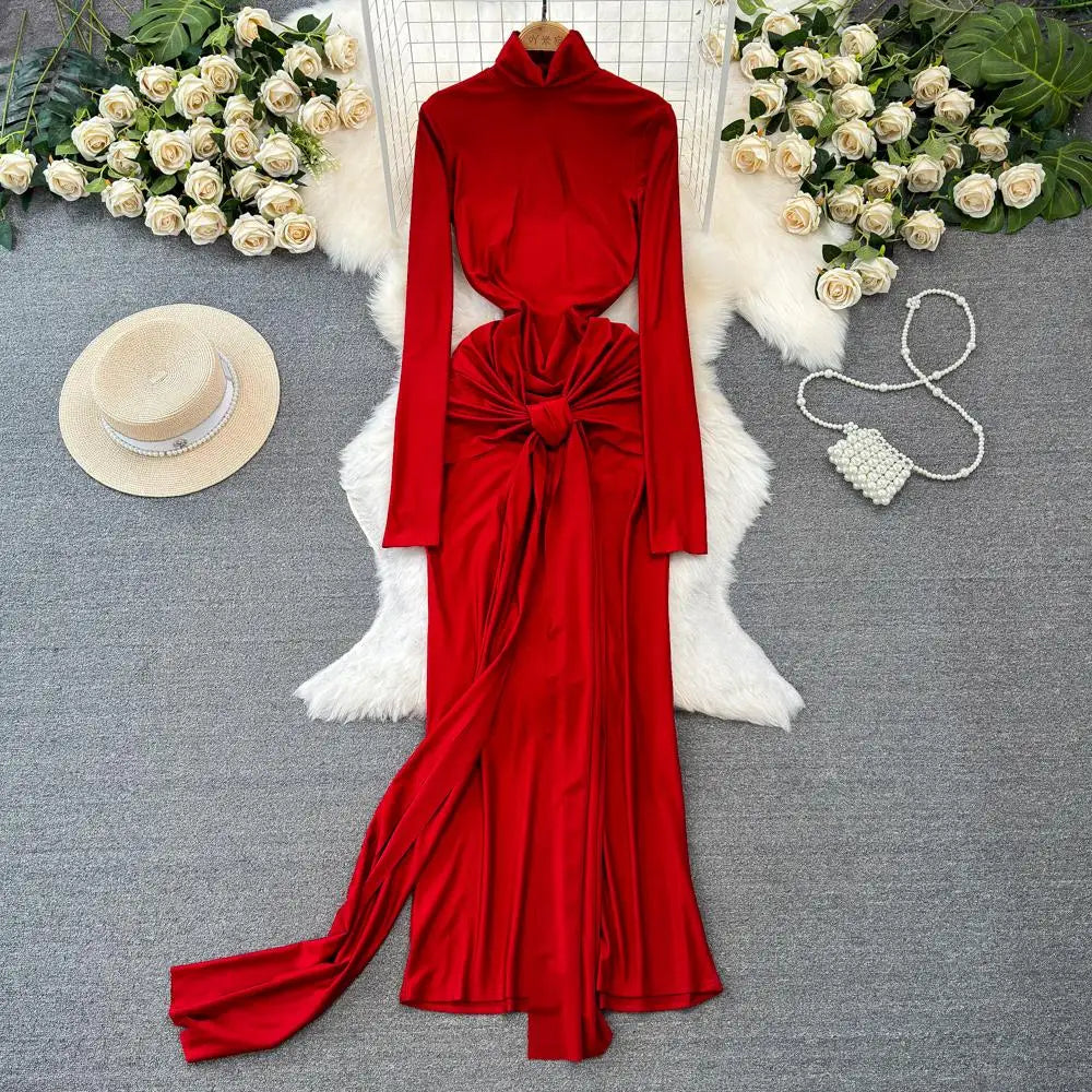 Autumn Solid Long Sleeve Party Dress for Women Sexy Bodycon Stand Collar Evening Dresses Bow Bandage Pleated Slim Waist Vestidos