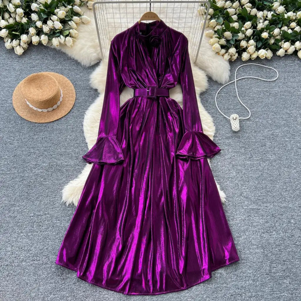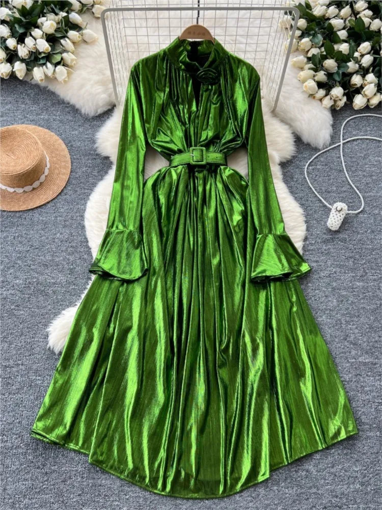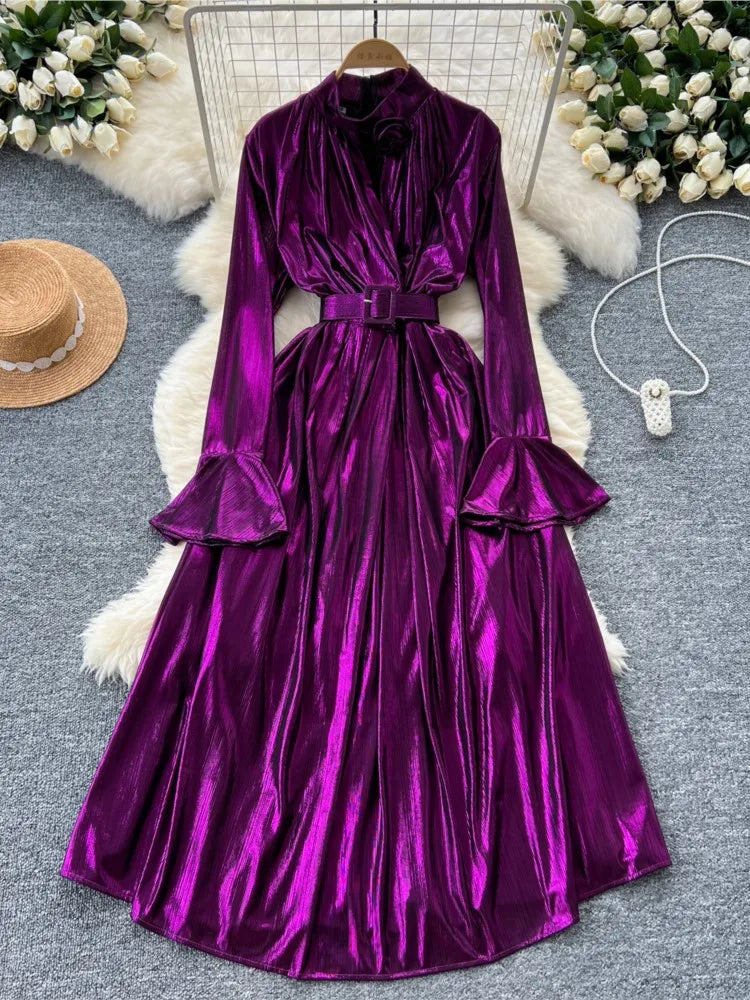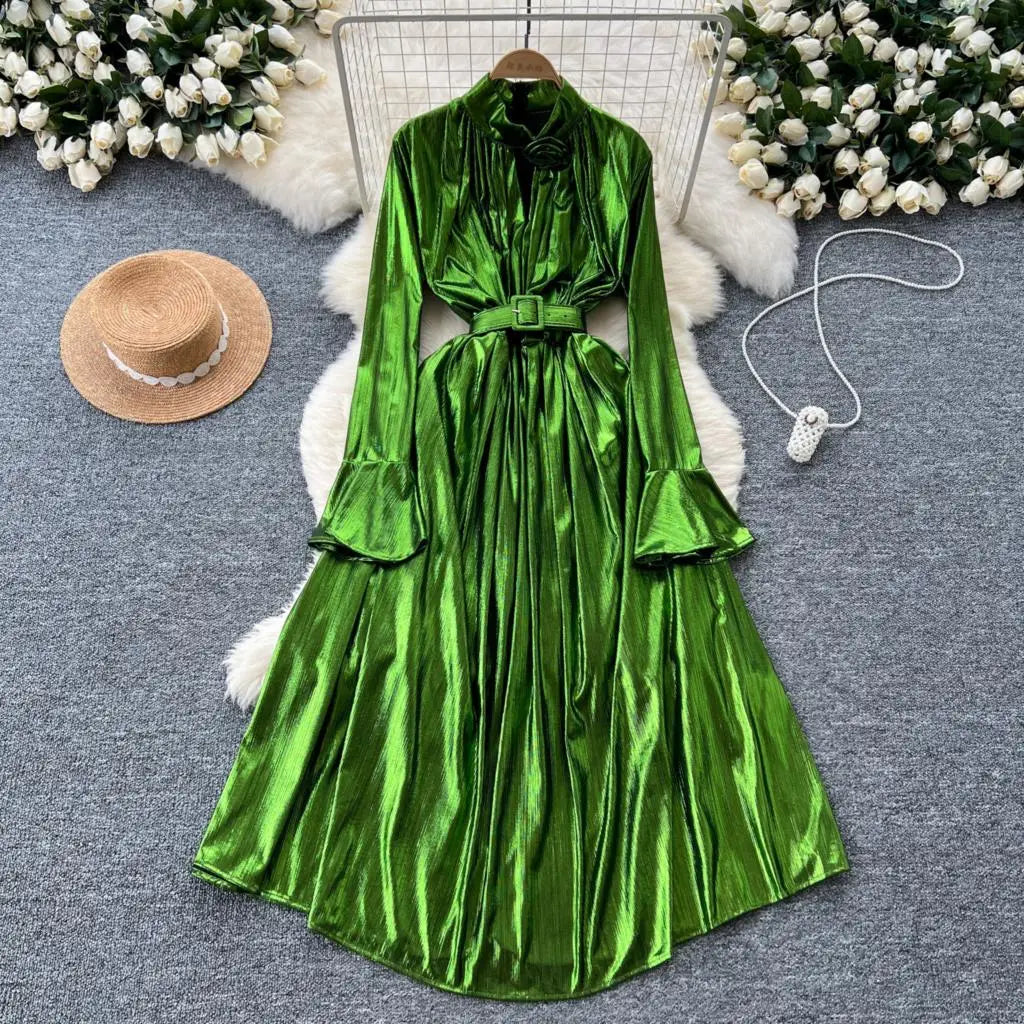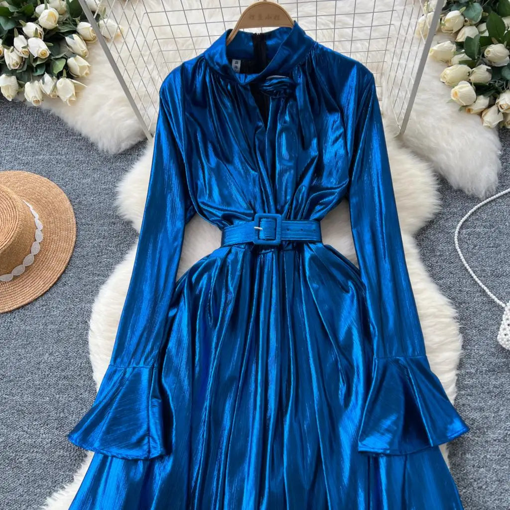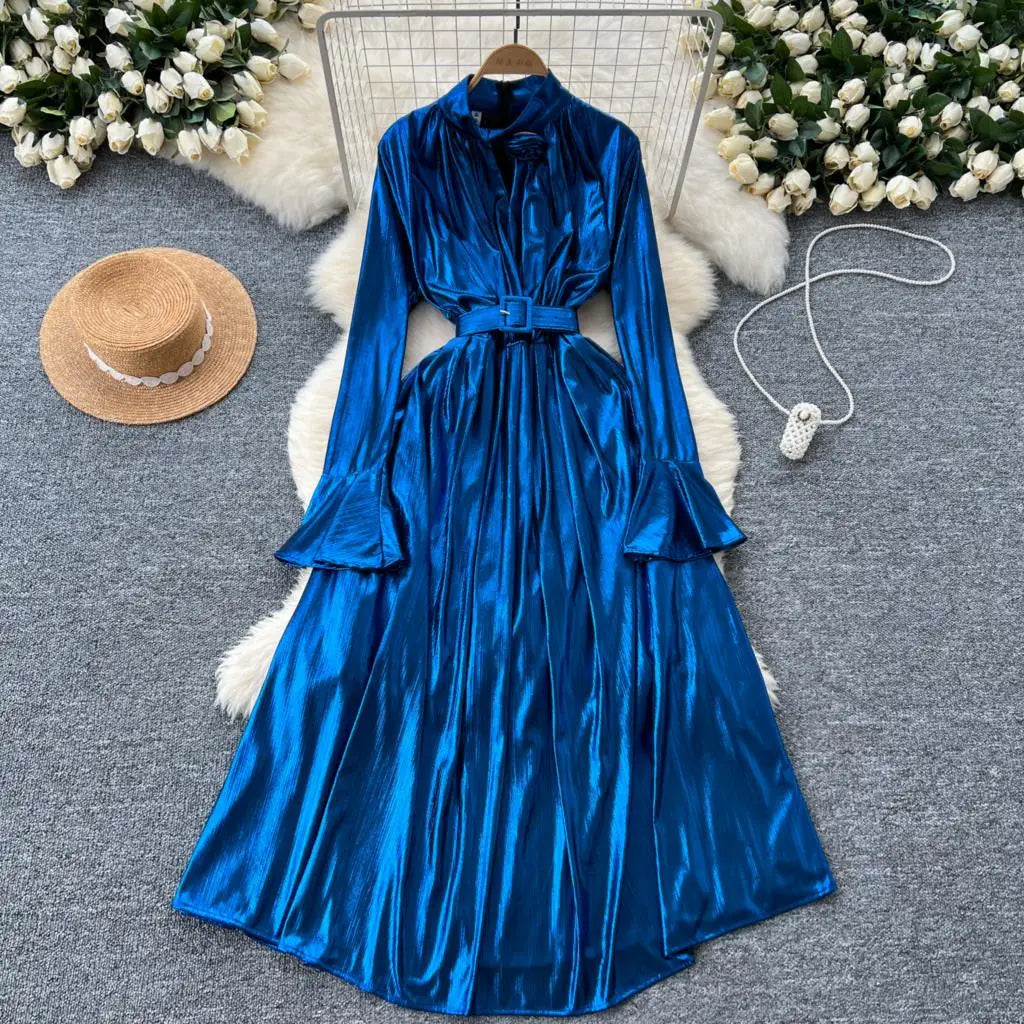 Autumn Vintage Pleated Women Long Dress Elegant Stand Collar Solid A-Line Party Prom Vestidos Female Birthday Clothes Mujers