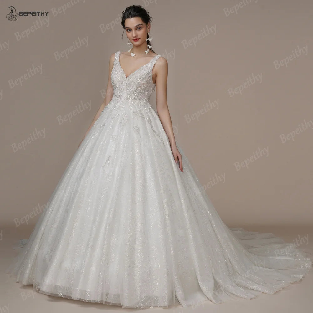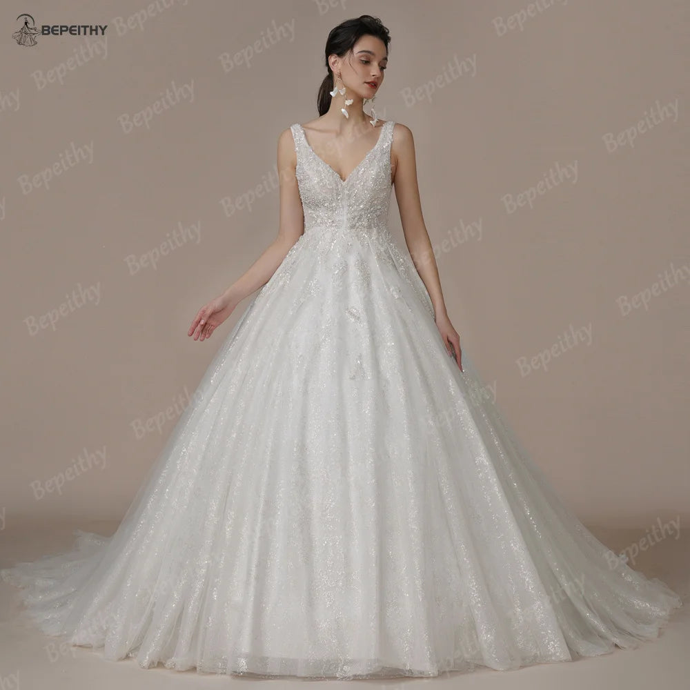 BEPEITHY Bride Luxury V Neck Crystal Wedding Dresses 2023 Sleeveless Court Train Beading Exquisite Ivory Bridal Ball Gown Spring