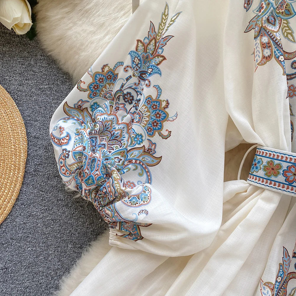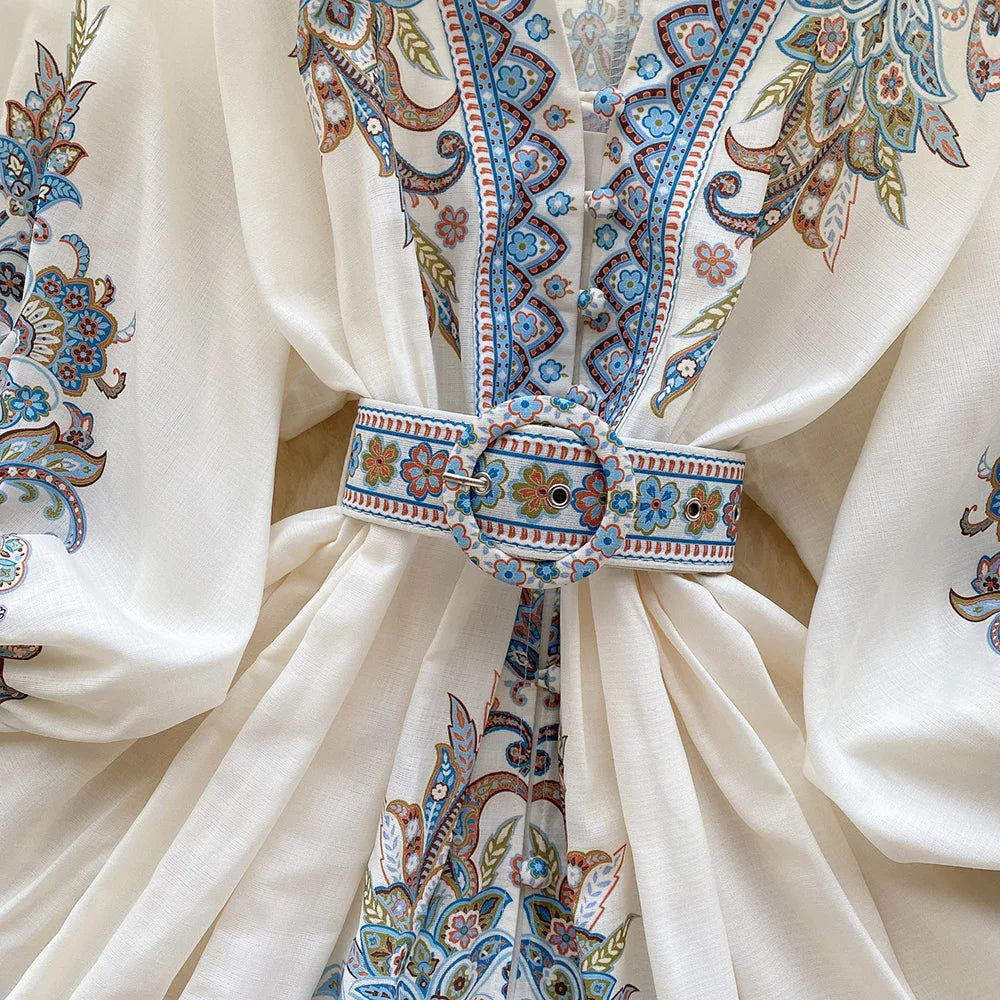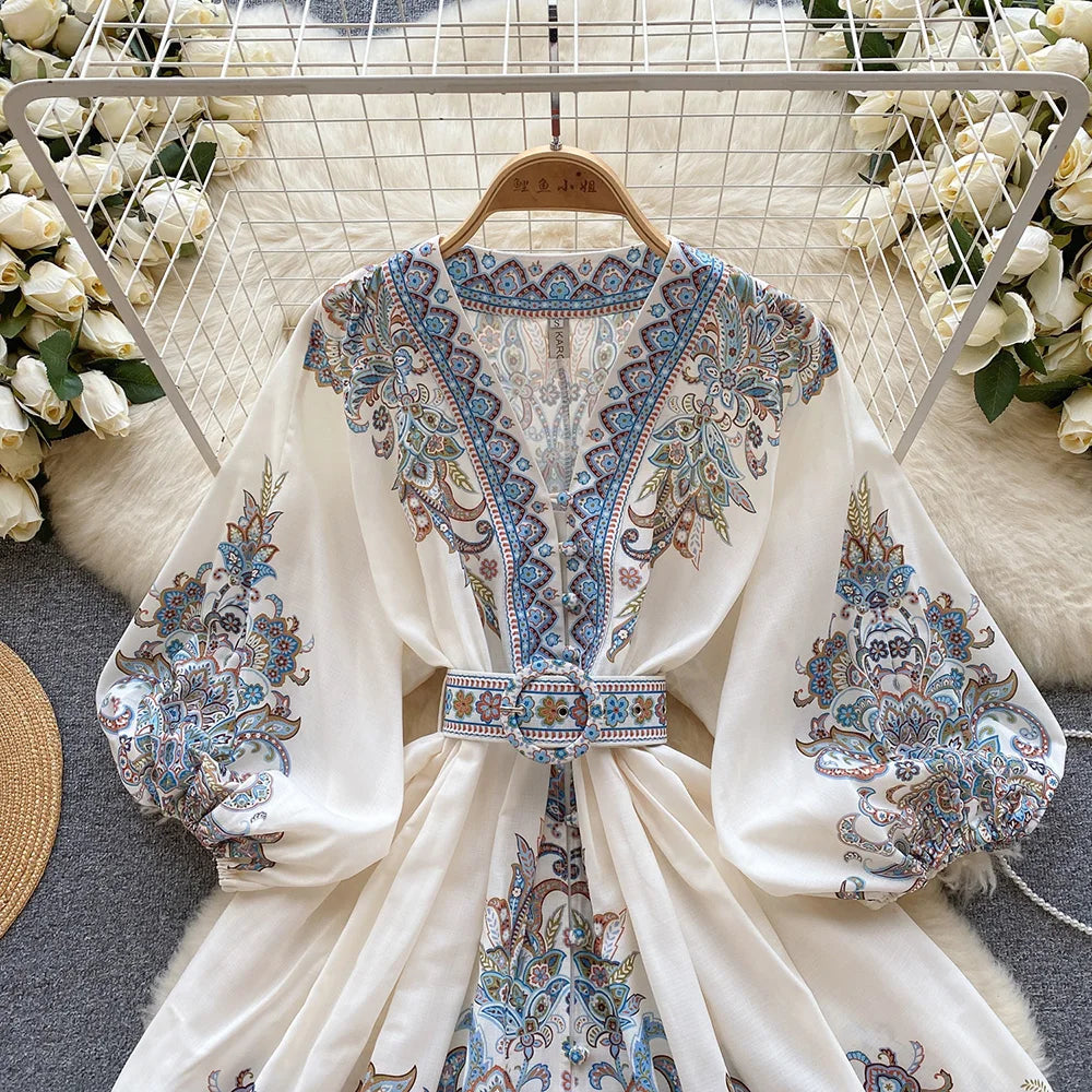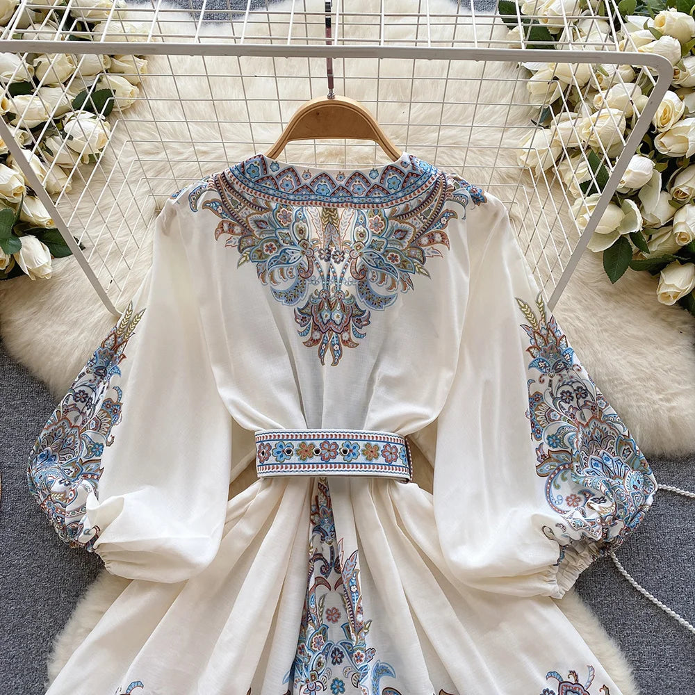 Bohemian Dresses For Women 2024 V Neck 3/4 Sleeve Spring Summer Vacation Mini Dress With Belt Boho Vintage Paisley Print Dress