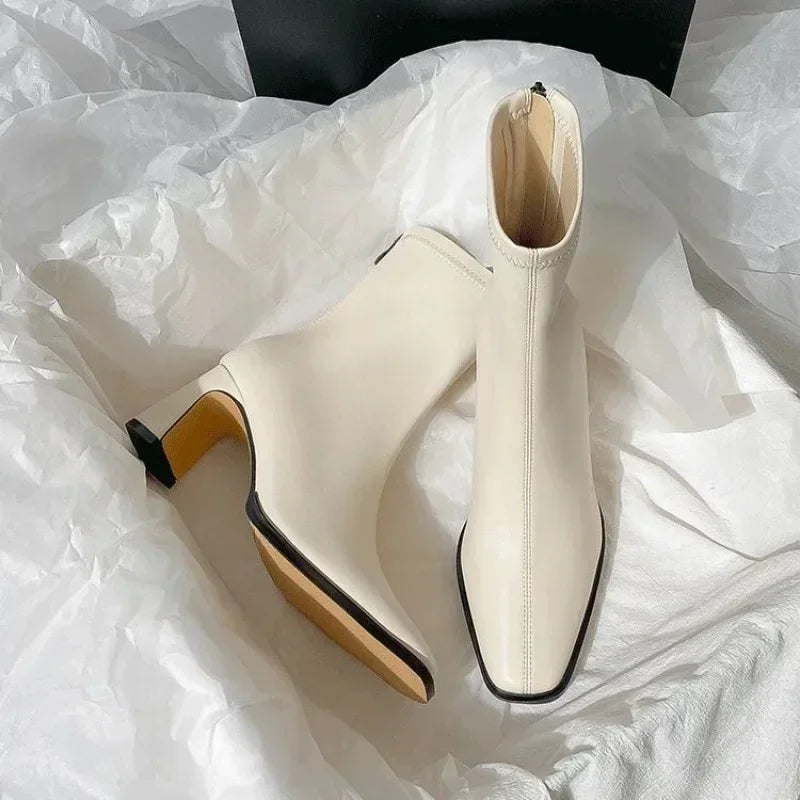 Brown Short Boots Women High Heel Autumn/winter New Style Thick Heel French Style Ankle Boots Zipper Square Versatile Slimming