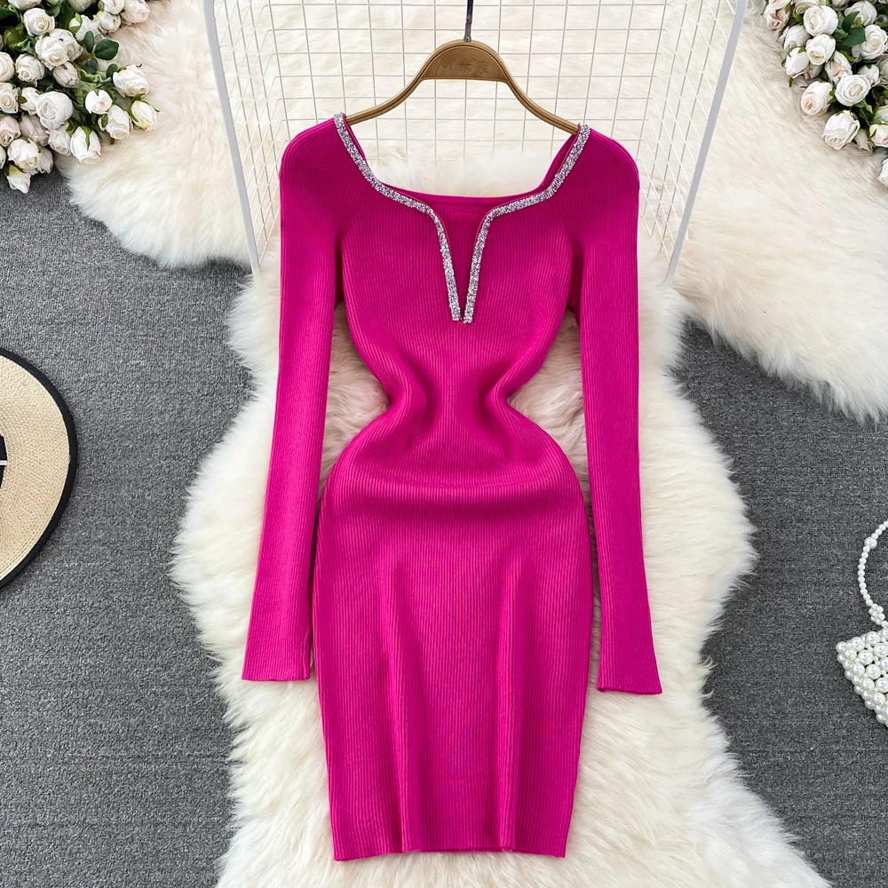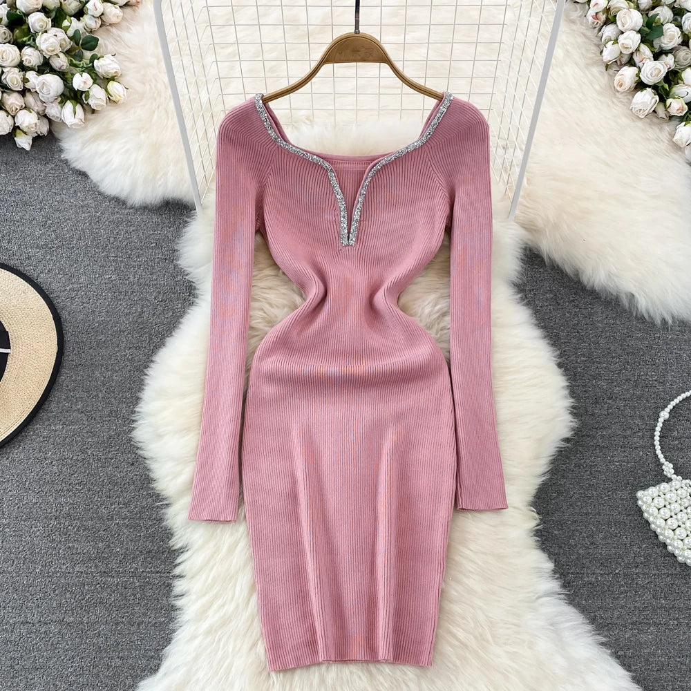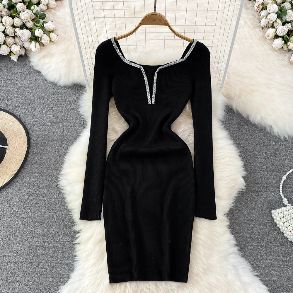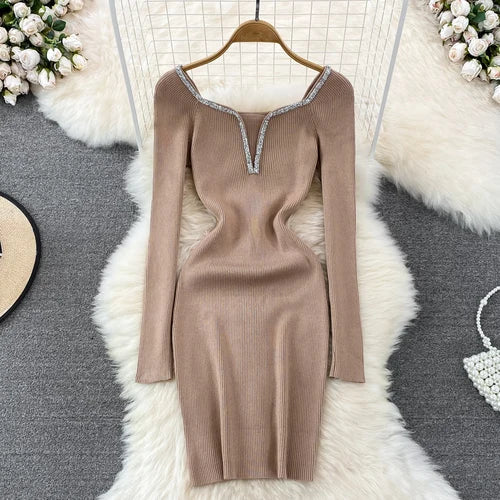 Chic Elegant Glitter V Neck Long Sleeve Elastic Bodycon Dress Sexy Fashion Knit Pencil Vestidos Slim Autumn Winter party robe