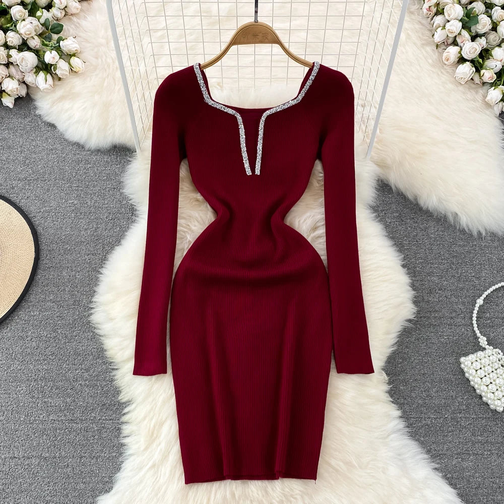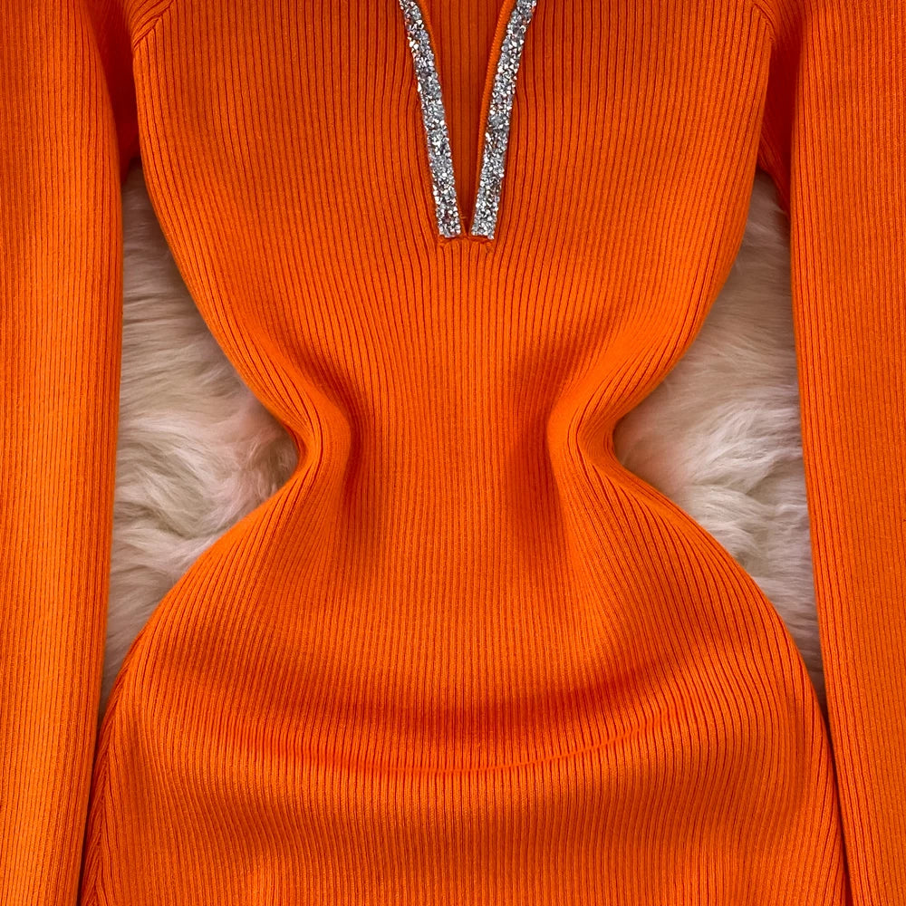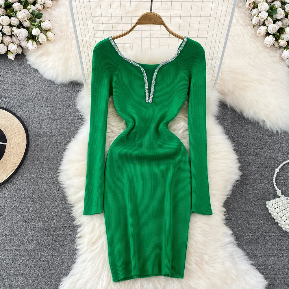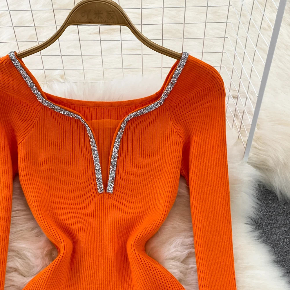 Chic Elegant Glitter V Neck Long Sleeve Elastic Bodycon Dress Sexy Fashion Knit Pencil Vestidos Slim Autumn Winter party robe