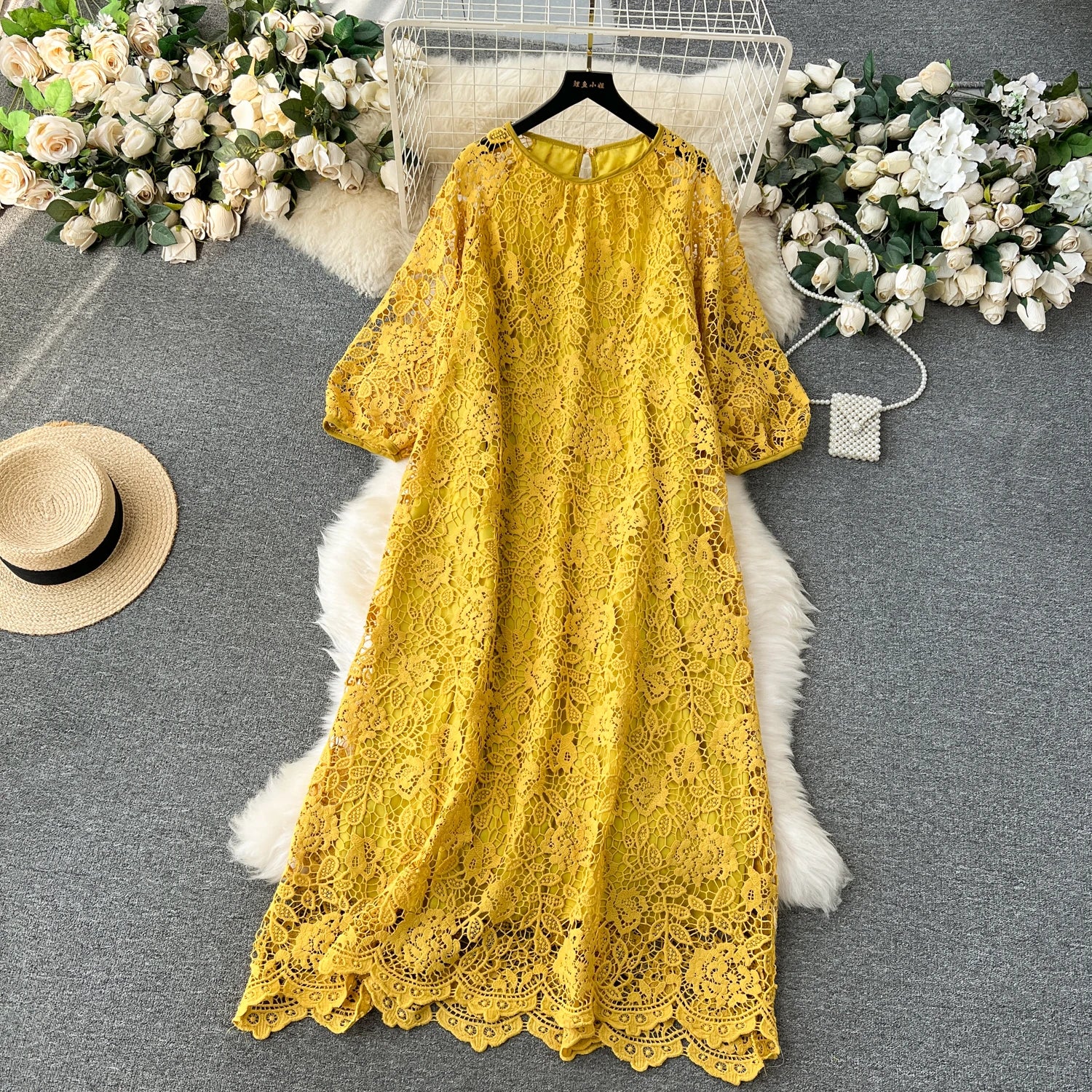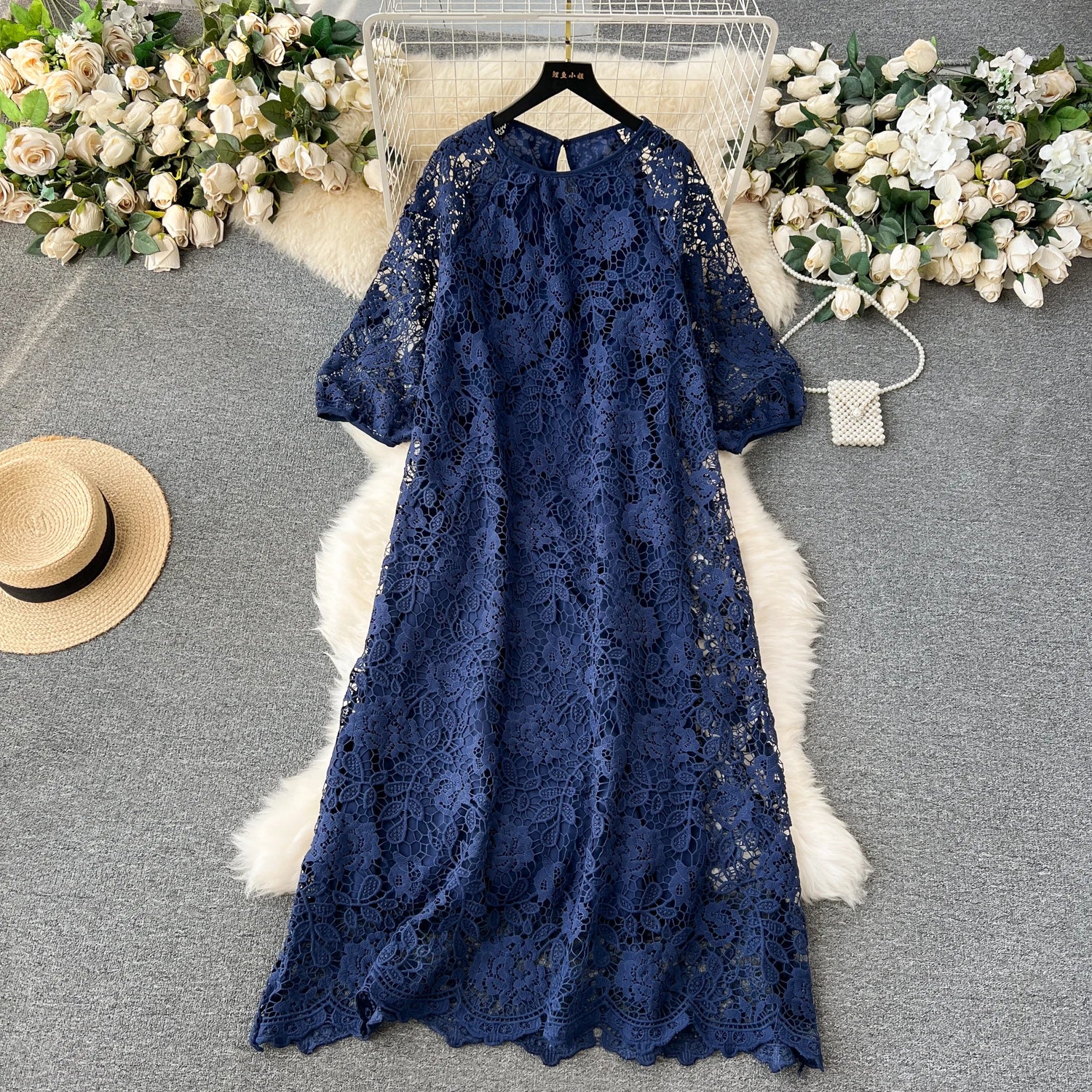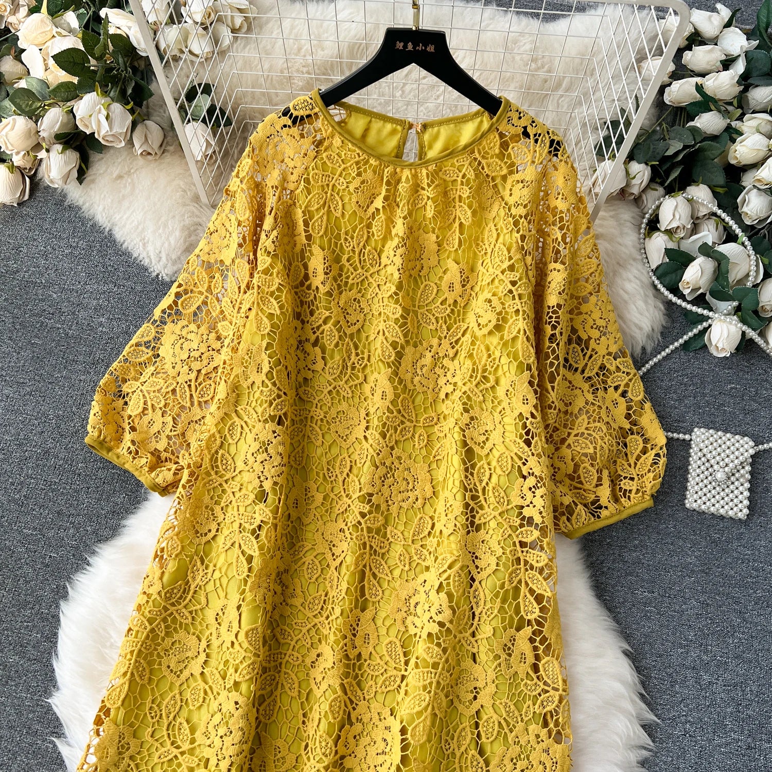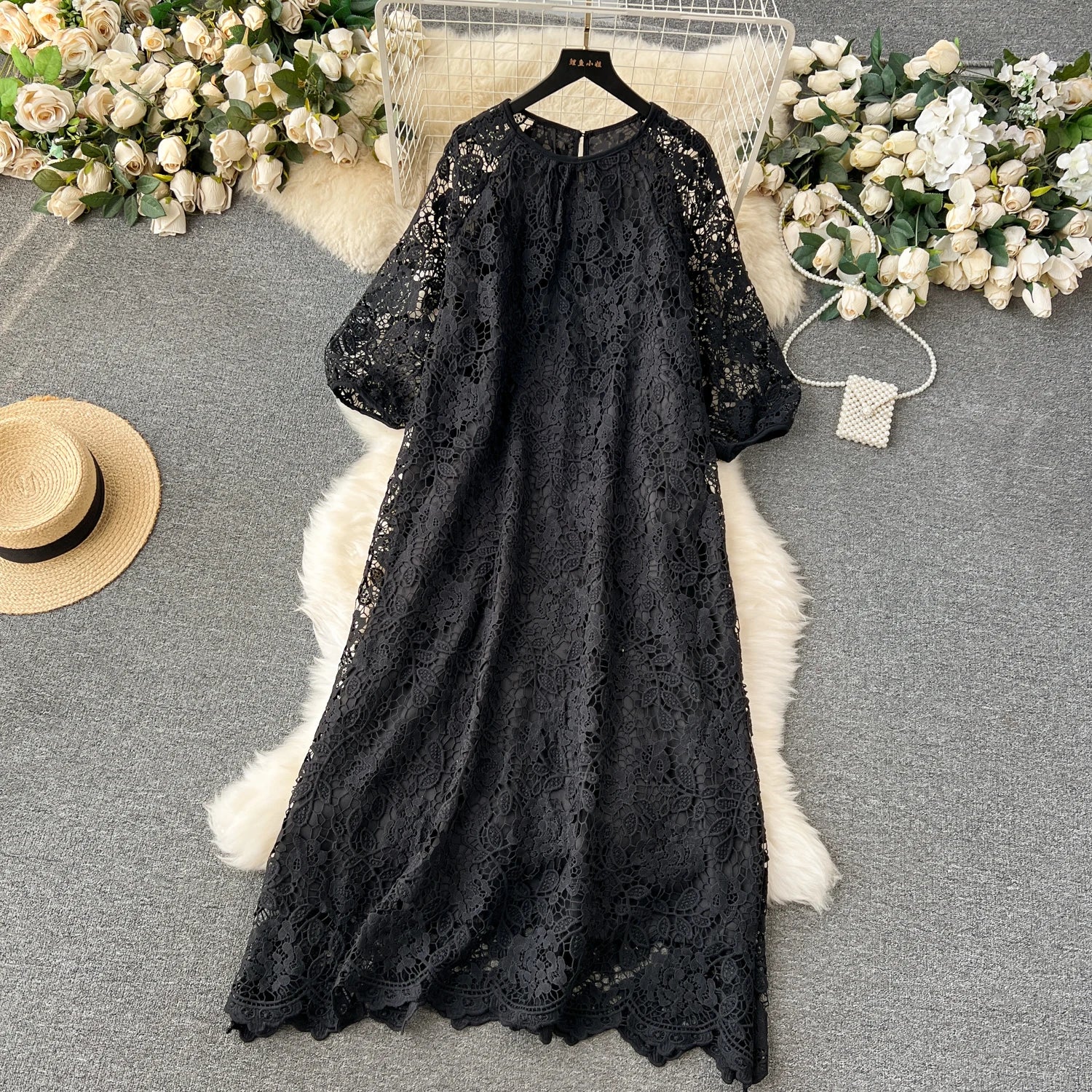 Chic Long Sleeve O Neck Lace Hook Flower Hollow Loose Dress Chiffon A-line Casual Dresses Fashion Women Elegant Vestidos