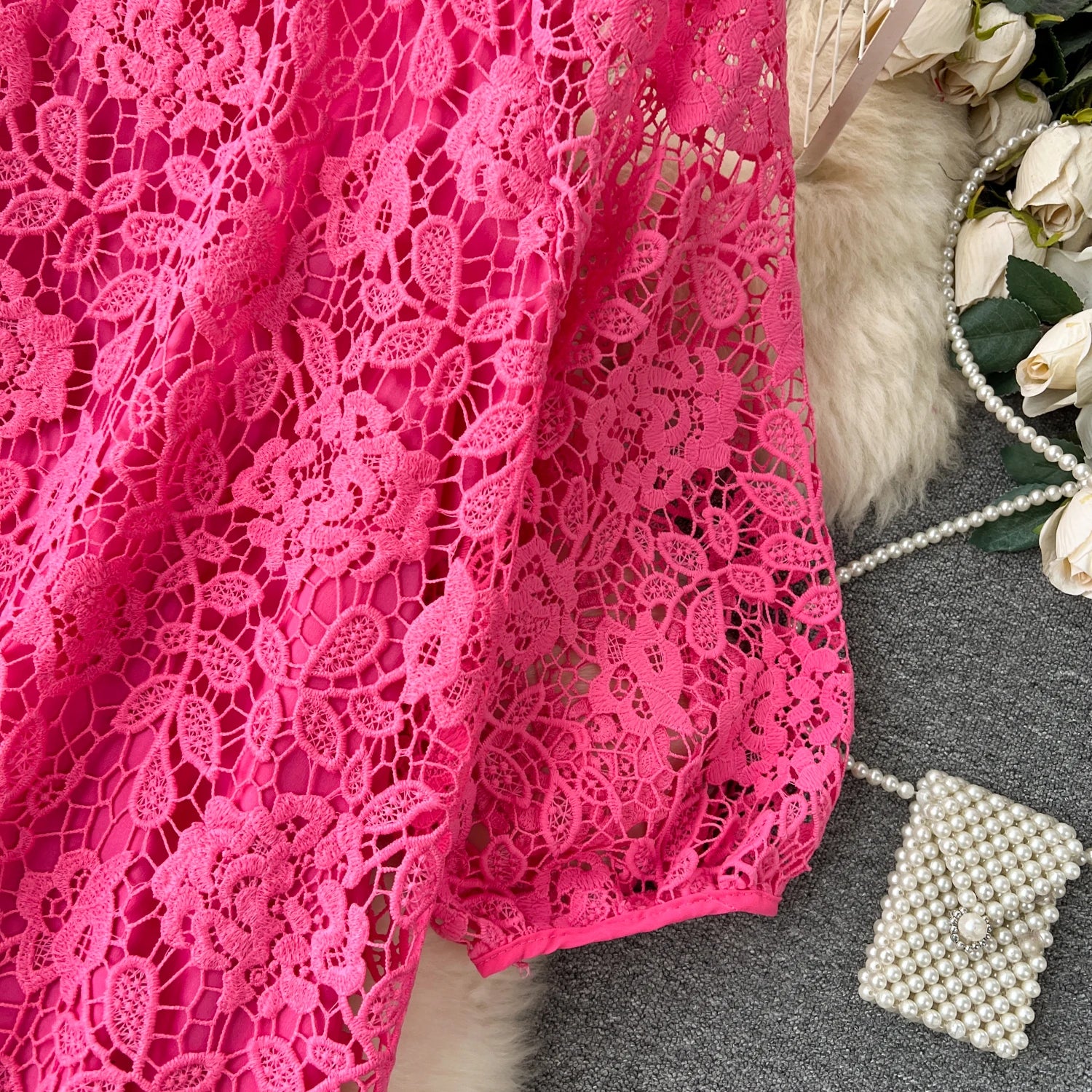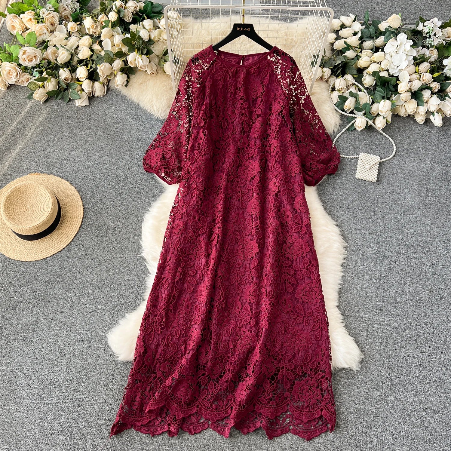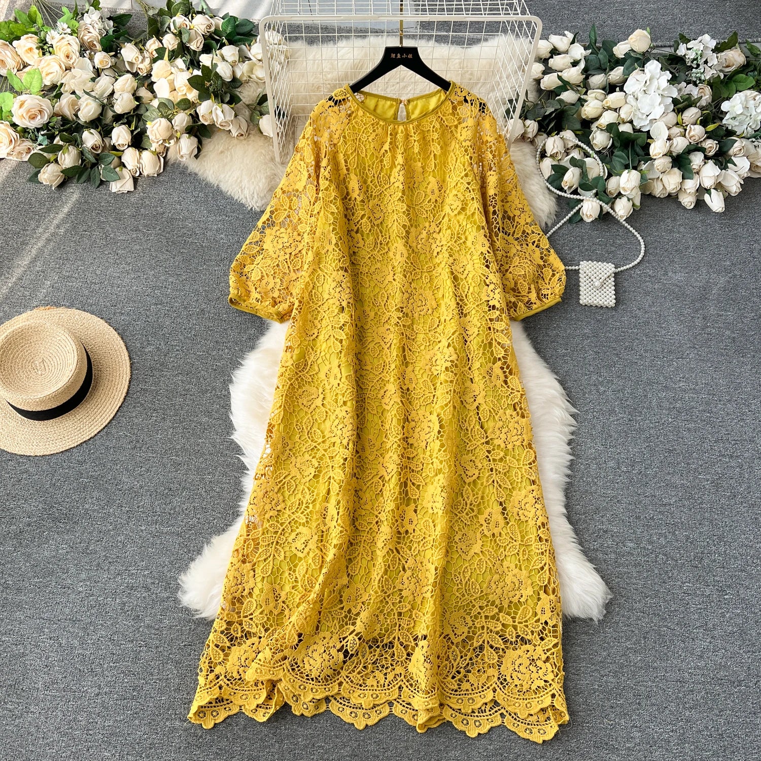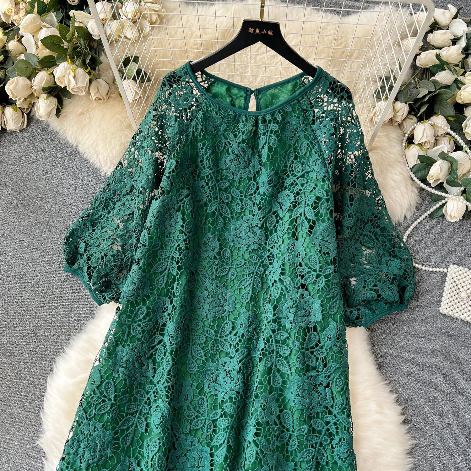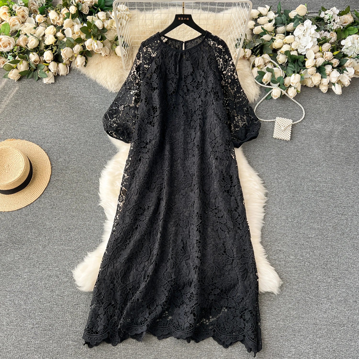 Chic Long Sleeve O Neck Lace Hook Flower Hollow Loose Dress Chiffon A-line Casual Dresses Fashion Women Elegant Vestidos