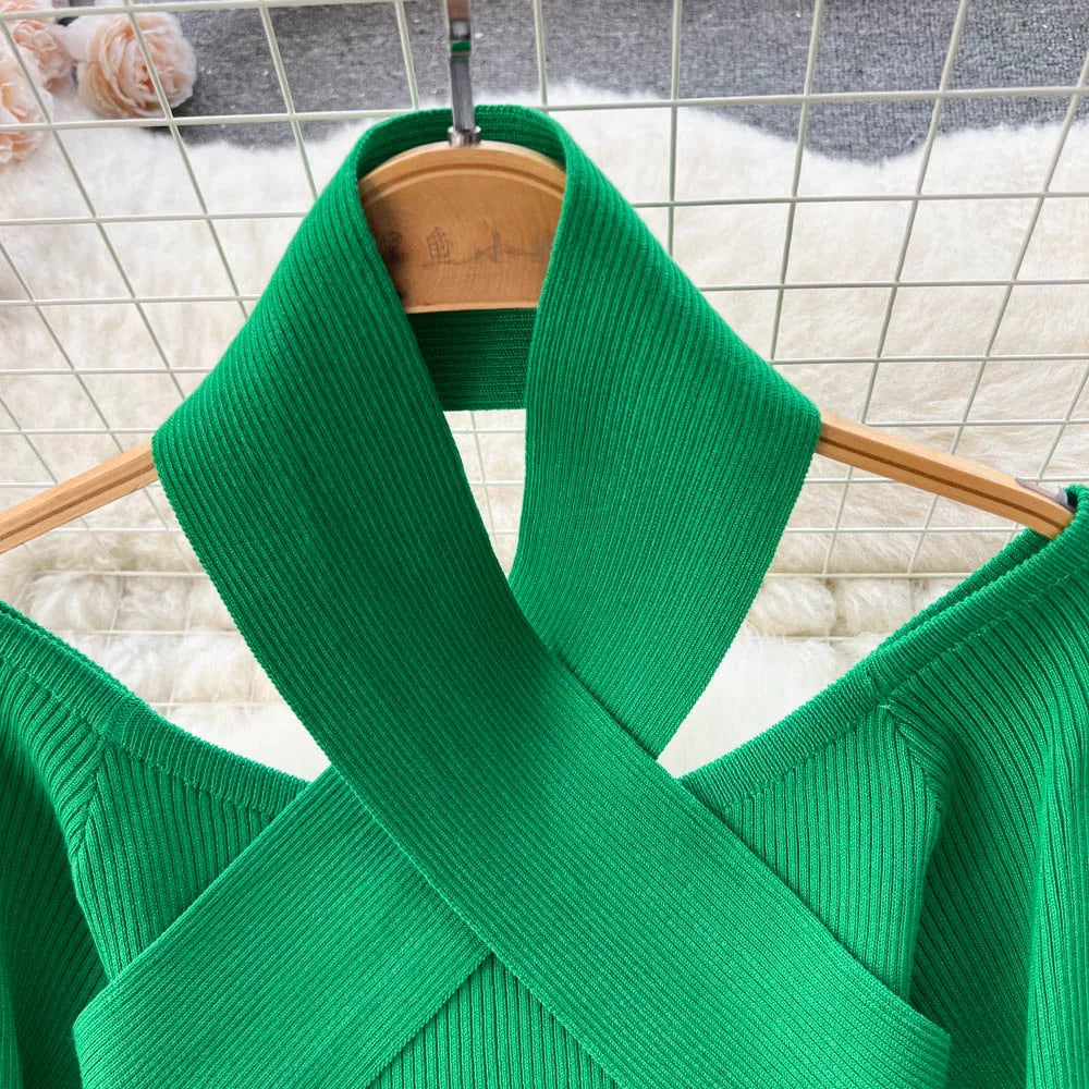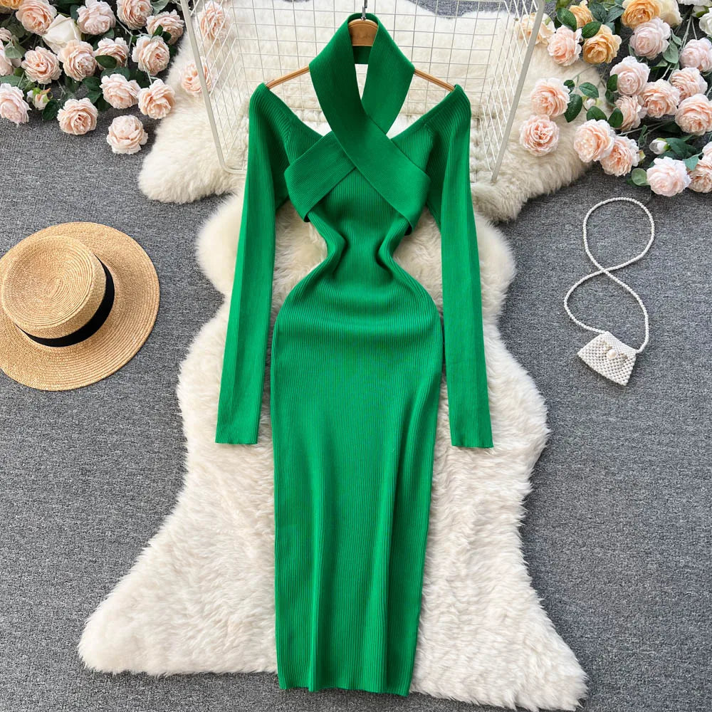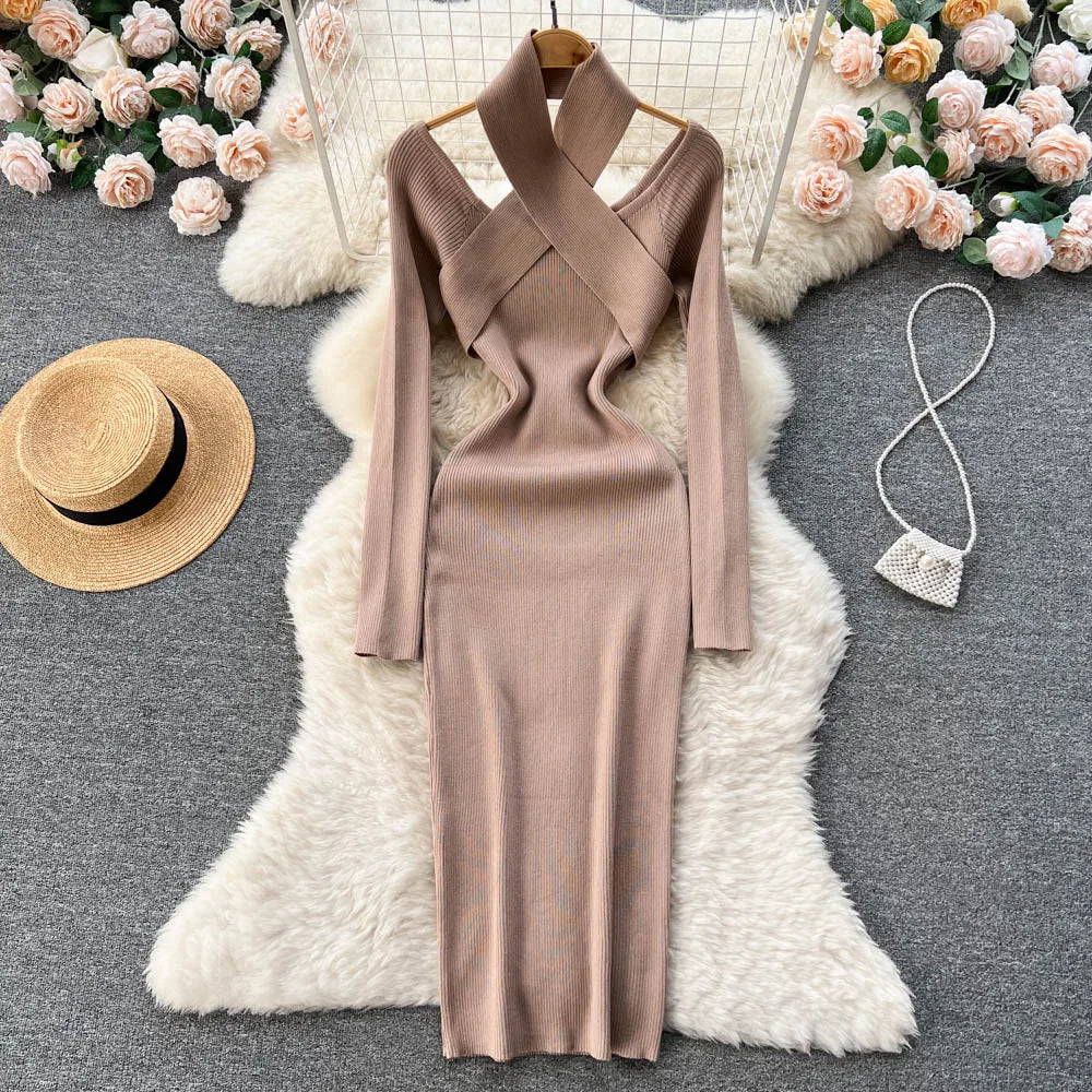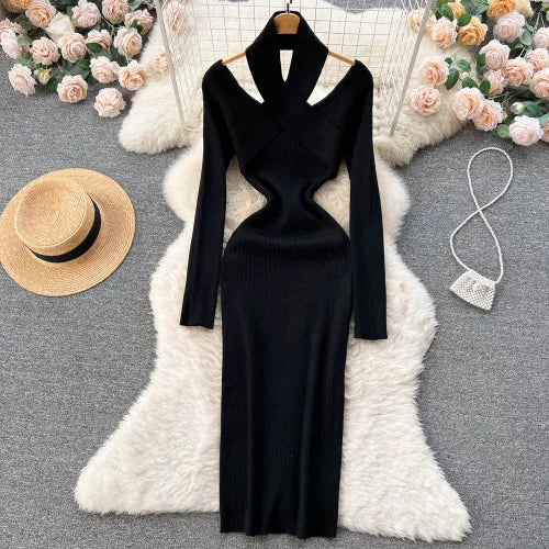 Chic Sexy Criss-cross Halter Elegant Pencil Dress Fashion Slim Knit Long Sleeve Birthday Party Vestidos Women Autumn Winter Robe