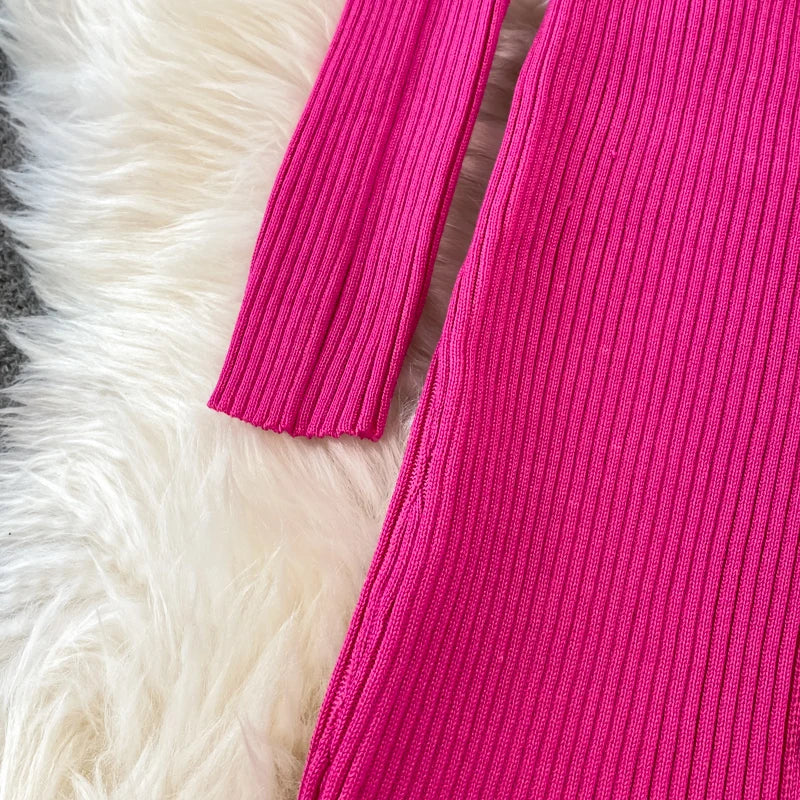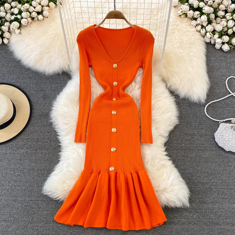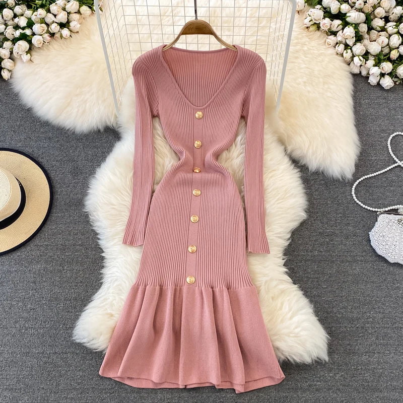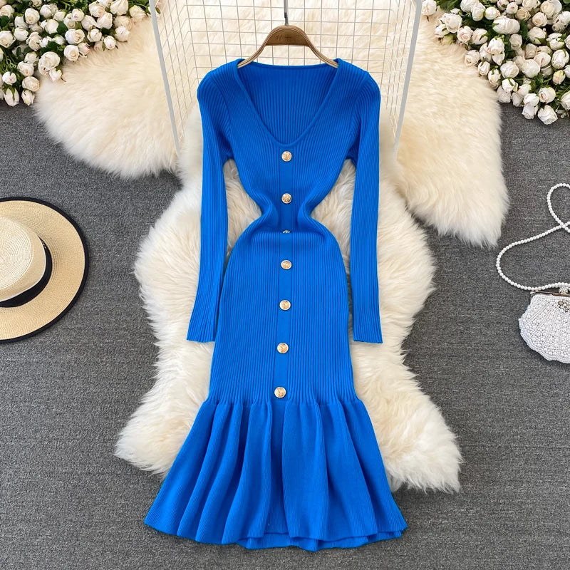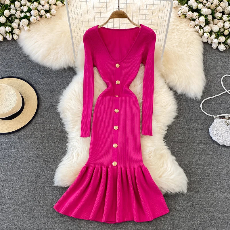 Chic V Neck Long Sleeve Elegant Mermaid Dress Sexy slim Evening Party French Fashion Knit Vestidos High Waist Autumn Slim Robe