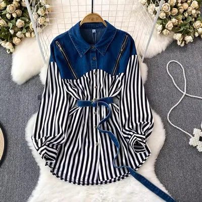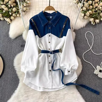 Denim Spliced Long Sleeve Shirt Coat Women Zipper Design Fashion Belt Lapel Mid Long Shirt Jacket Female Autumn Casual Blouses