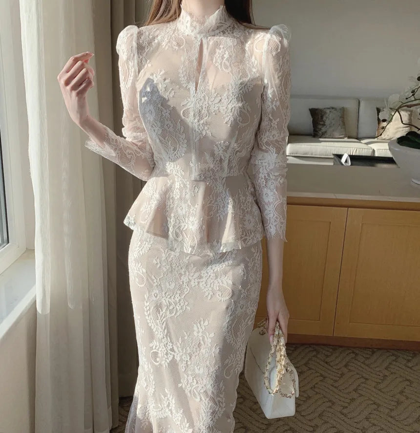 Elegant and Slim fitting Semi Transparent Lace Set Women's Spring Temperament Long Sleeved Top+Long Fishtail Skirt Two-piece