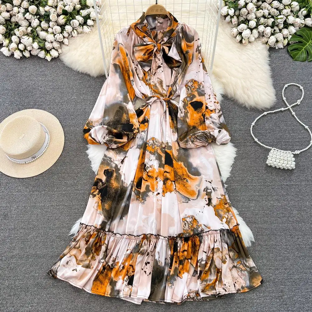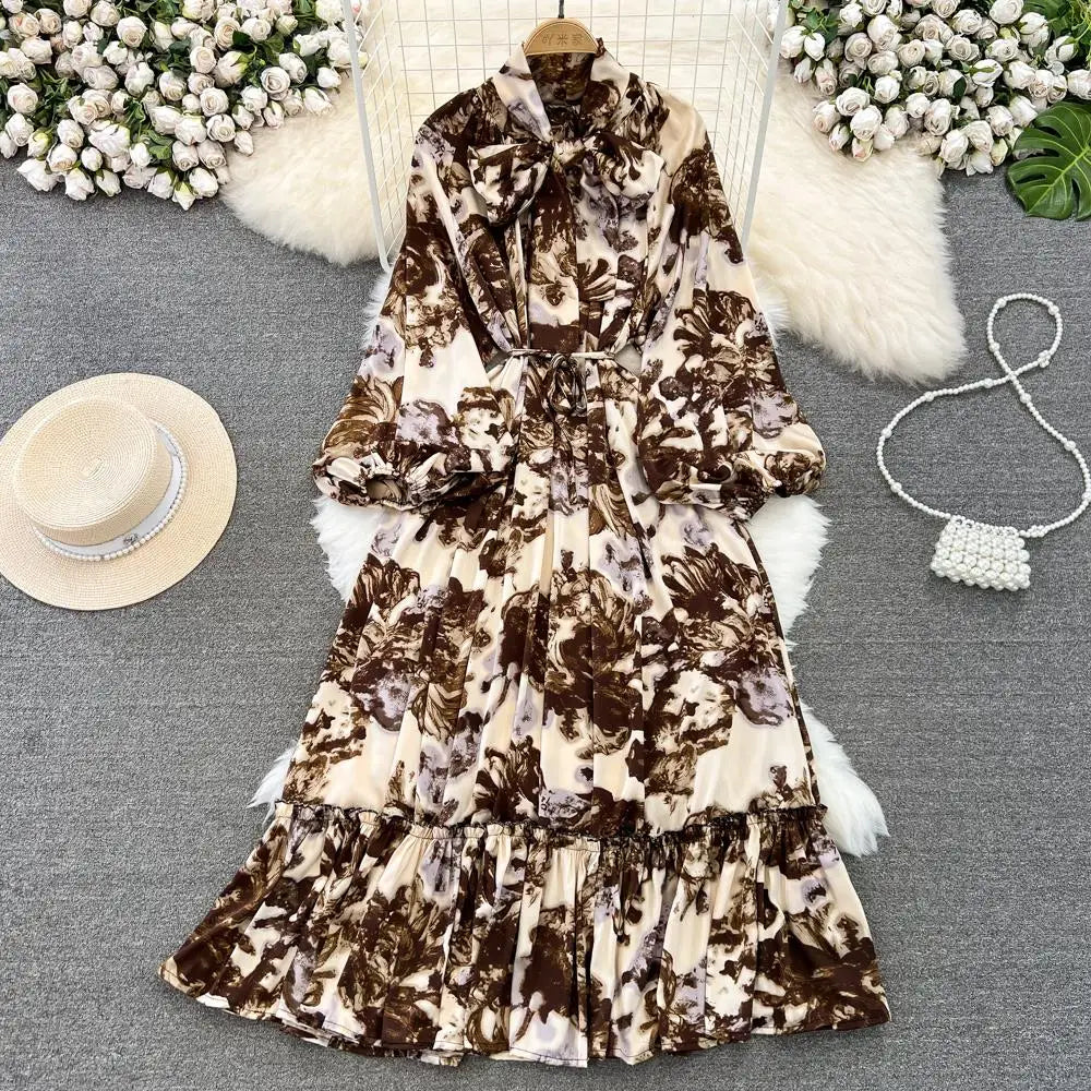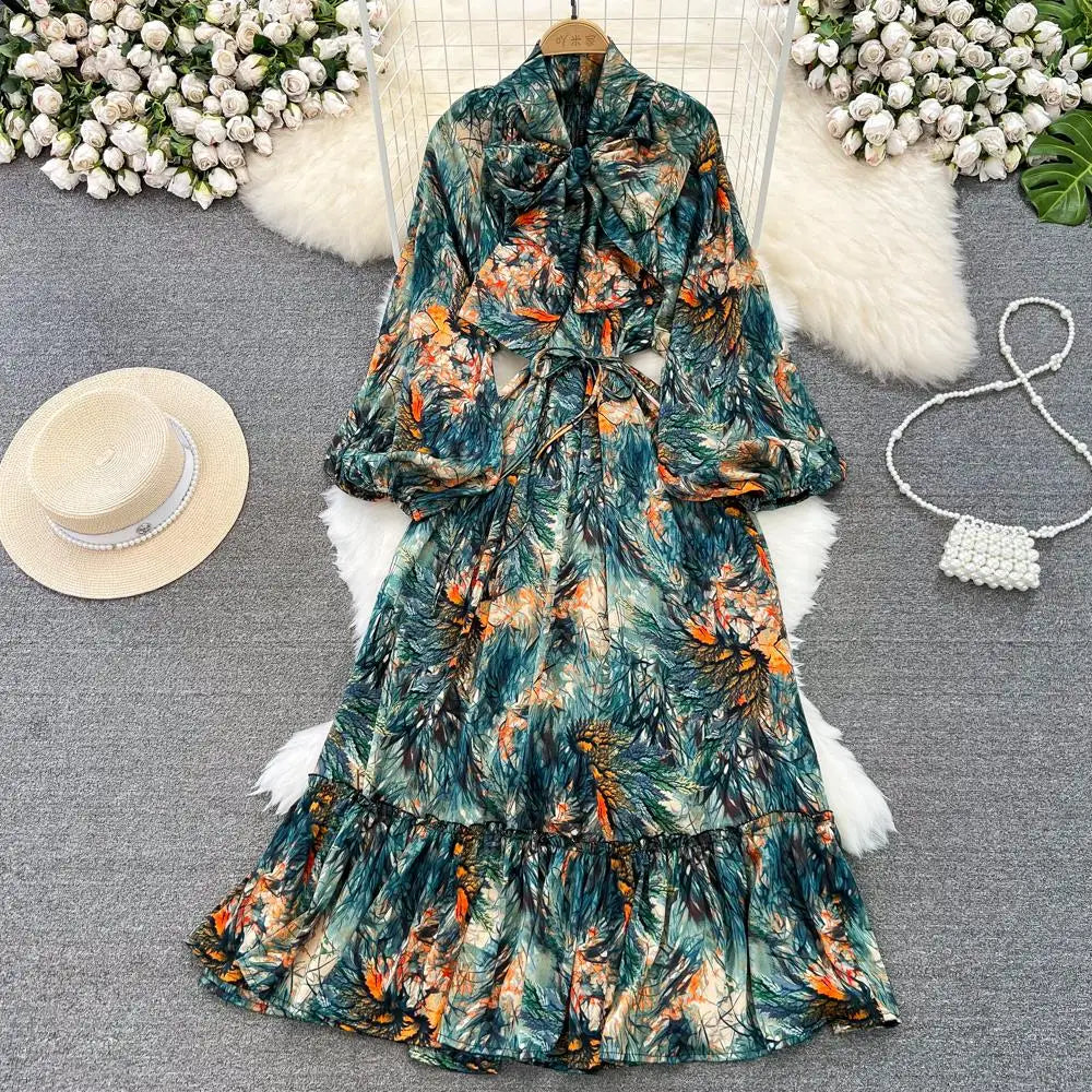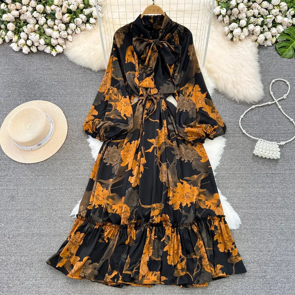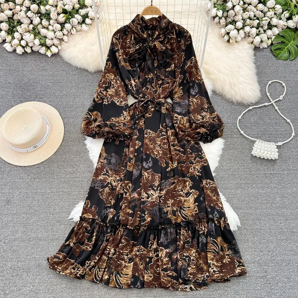 Elegant Casual A-Line Vintage Ruffle Print Long Dress Autumn Lantern Sleeve Party Boho Dresses Beach Holiday Female Vestidos