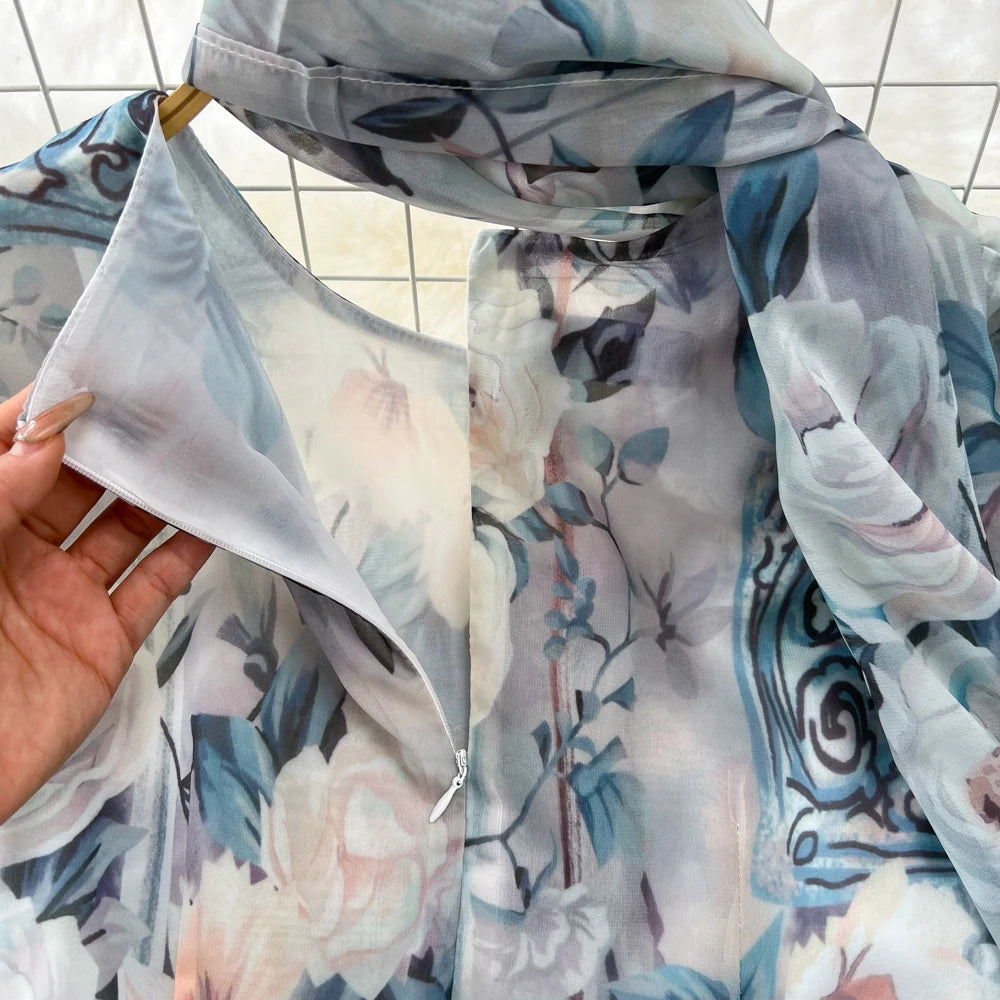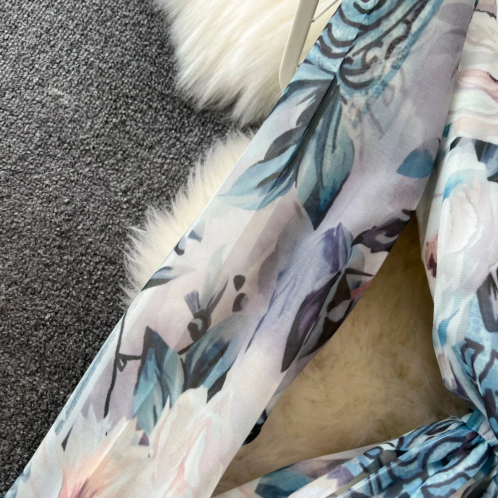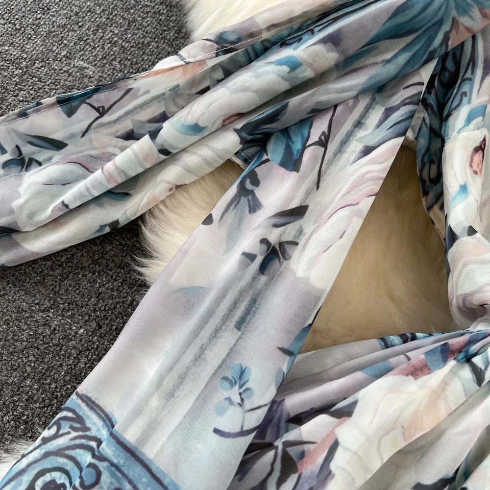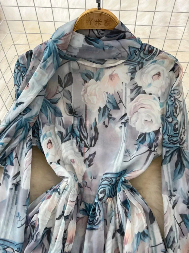 Elegant Chic A-Line Women Autumn Dress Long Sleeve Casual Floral Print Vintage Beach Holiday Vestidos Female Lace-up Robe Mujers