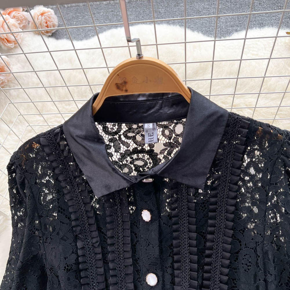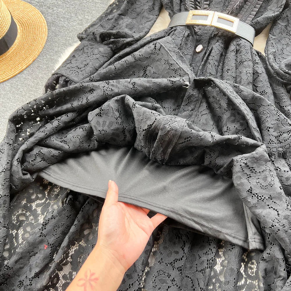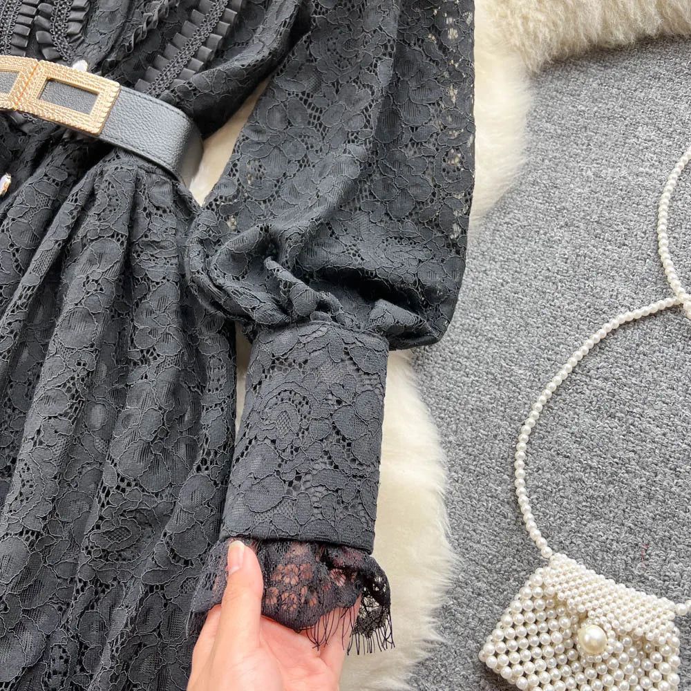 Elegant Chic Lace Hook Flower Hollow Long Sleeve Lapel Dress Party A-line Vestidos High Waist Basic Women Autumn Winter Dress