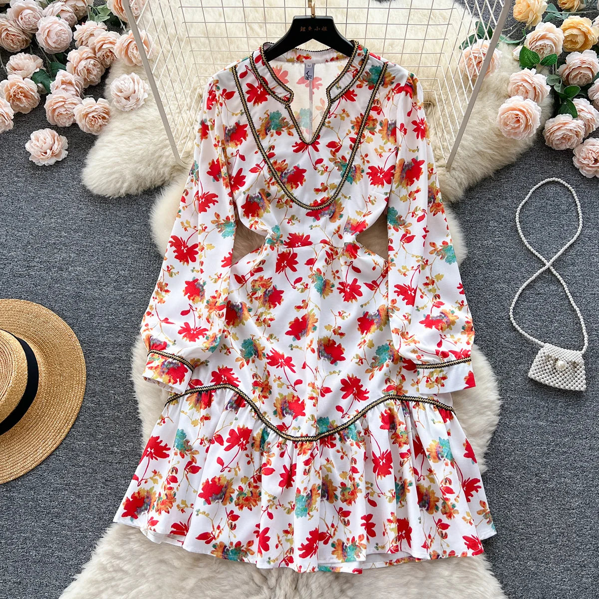 Elegant Dresses For Women 2023 New In Contrast Trim Vintage Floral Print Dress V Neck Long Sleeve Ruffle Hem Vacation Mini Dress