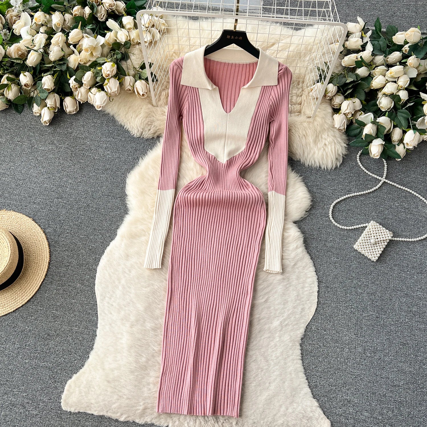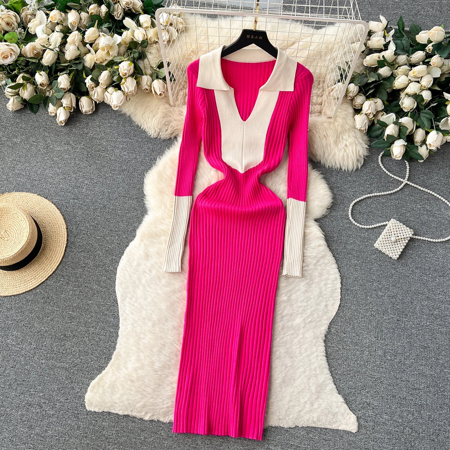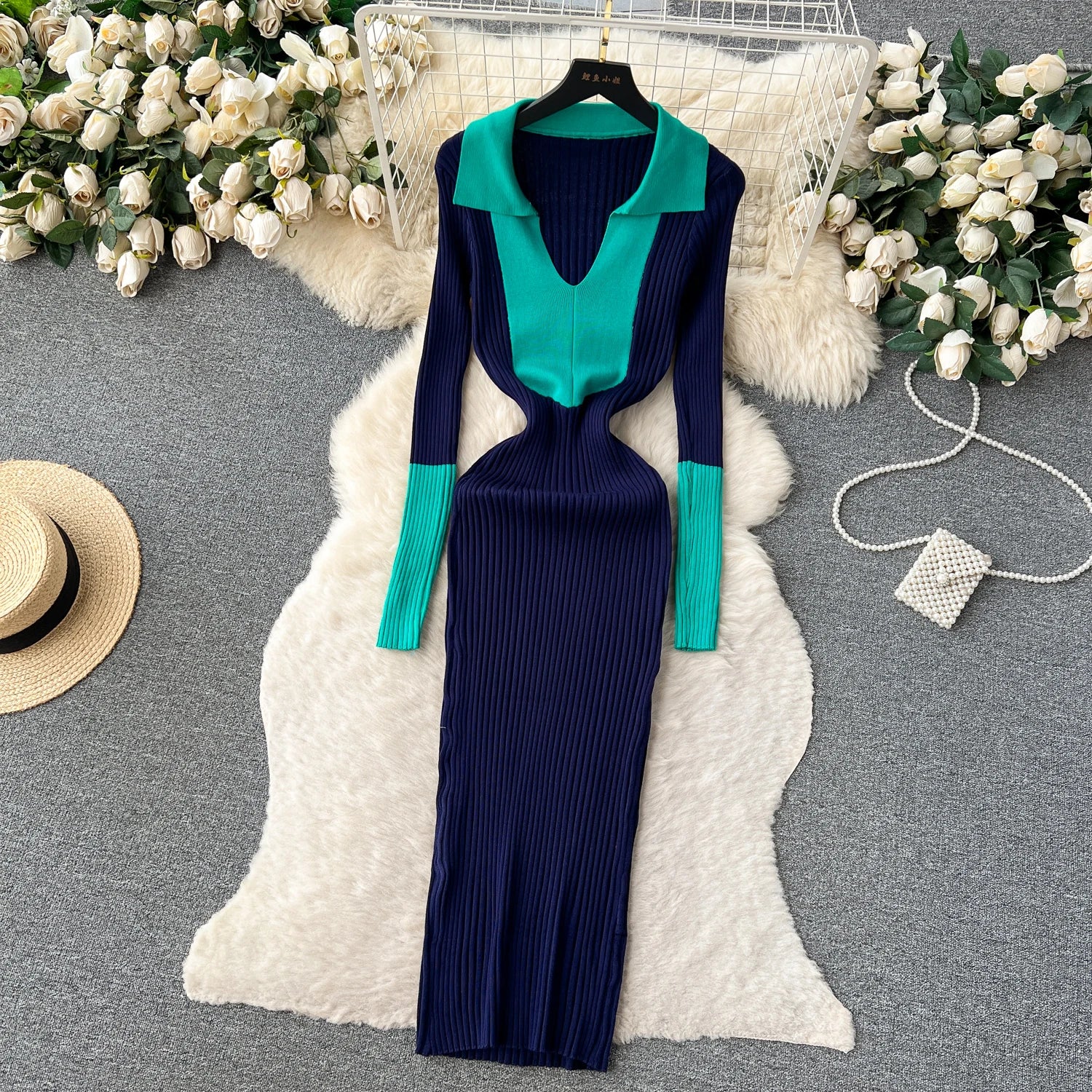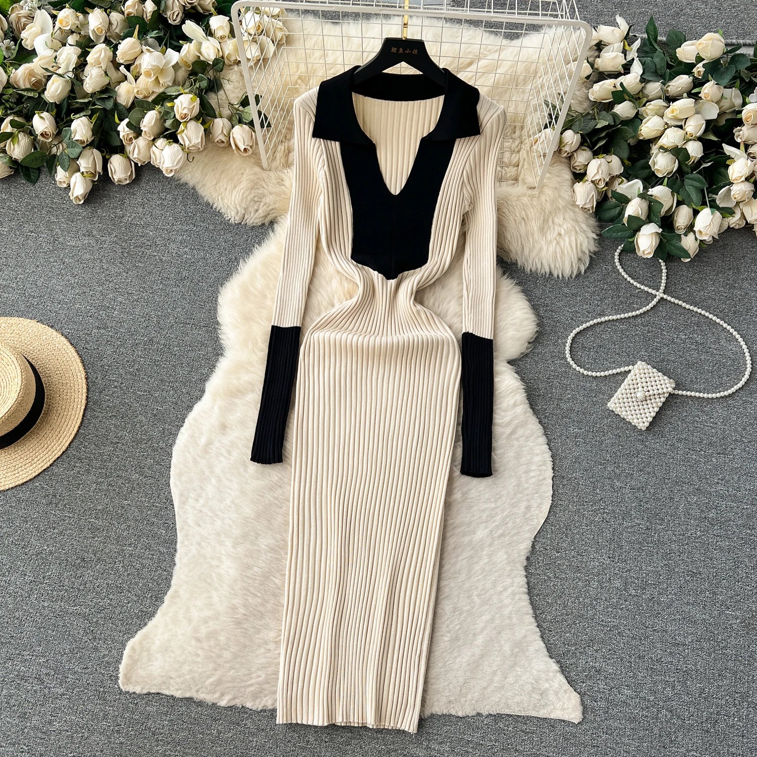 Elegant Polo-neck Long Sleeve Knit Bodycon Pencil Dress Slim Basic Fashion Sweater Vestido Sexy Women Autumn Winter Clothing