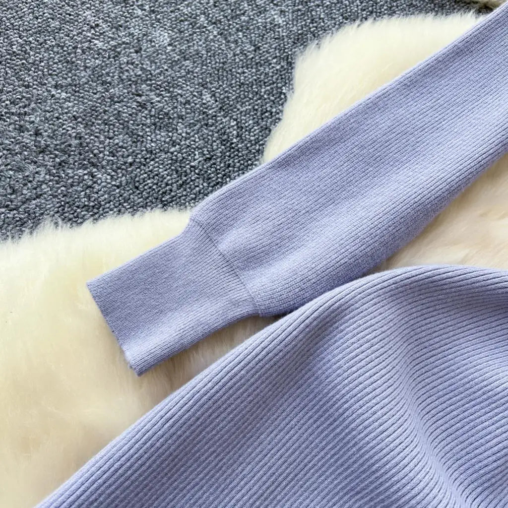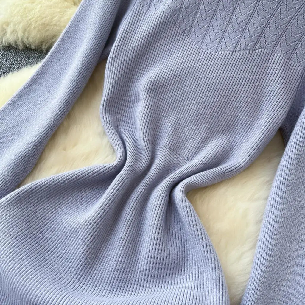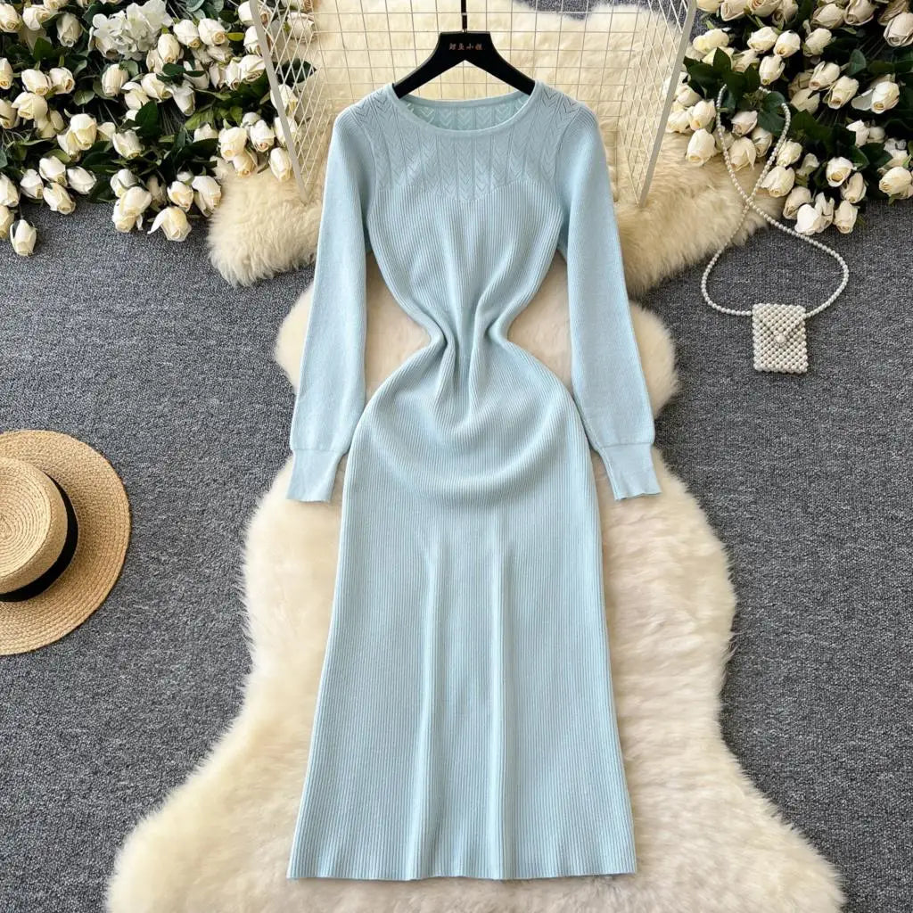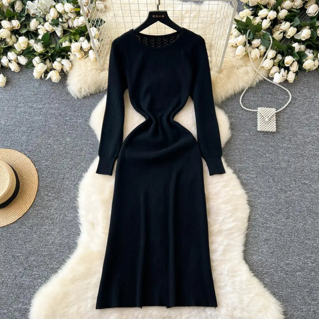 Elegant Solid Knitted Dress for Women Autumn French Vintage O-Neck Long Sleeve Fashion Evening Party Sweater Slim Midi Dresses