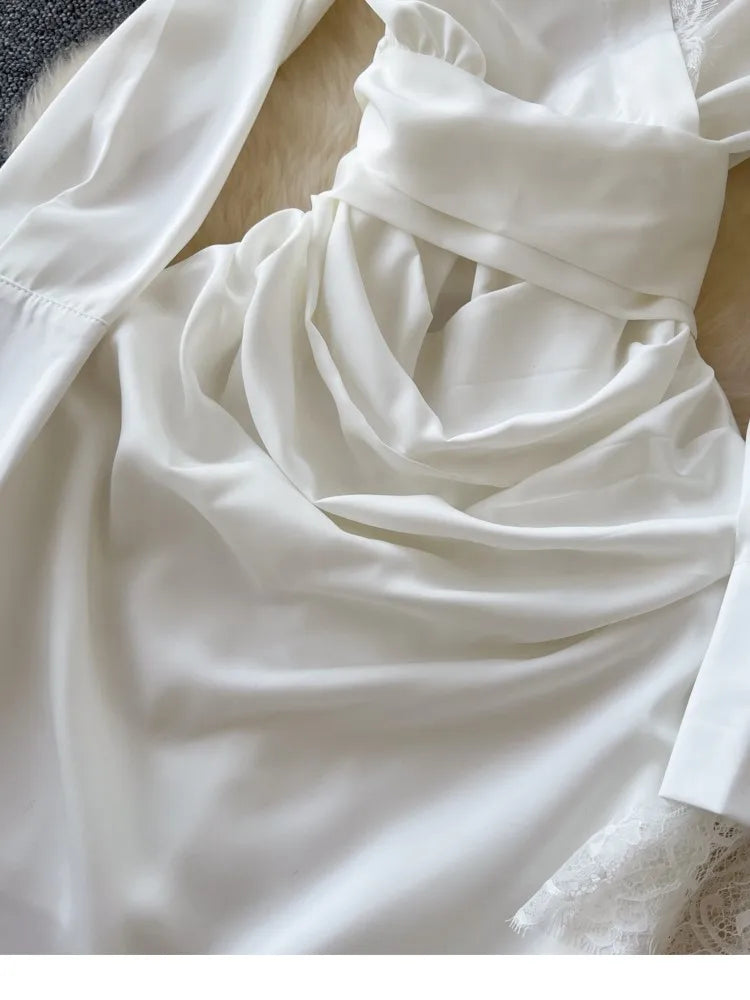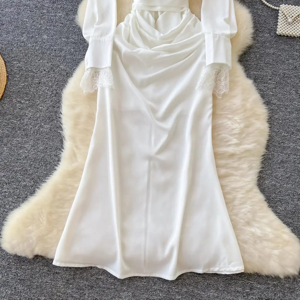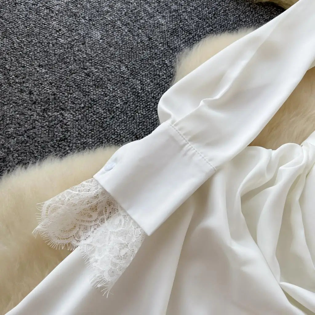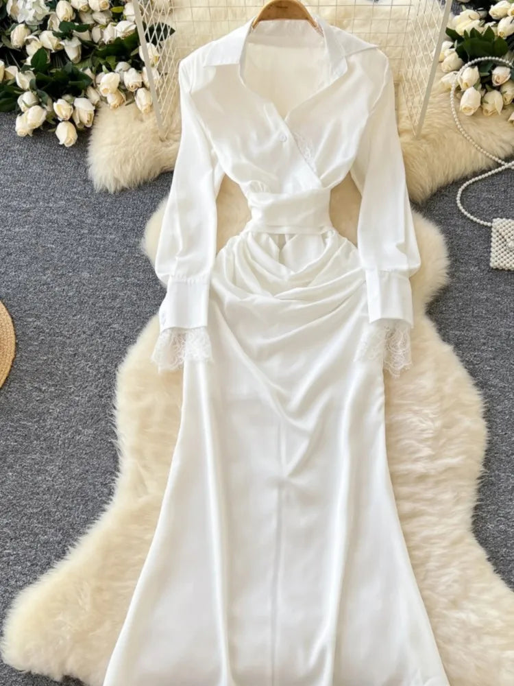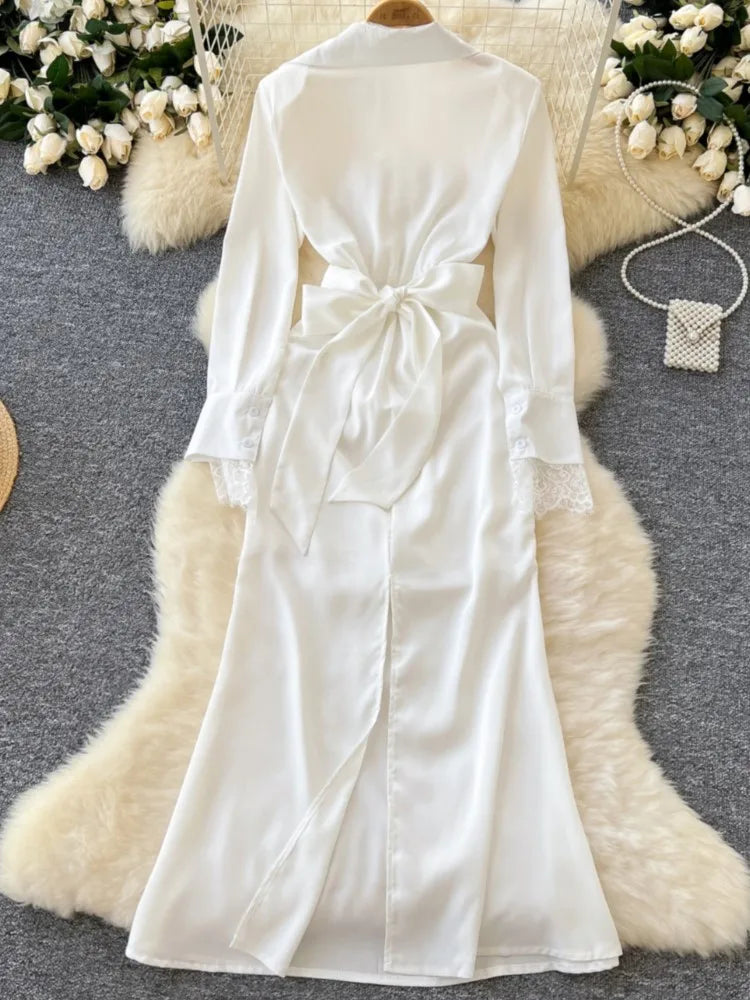 Elegant Solid Satin Midi Dress for Women Autumn Long Sleeve Lace Patchwork Office Work Shirt Dresses Lace-up Slim Waist Vestidos