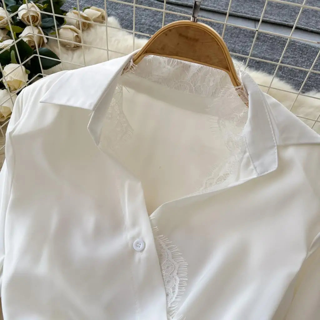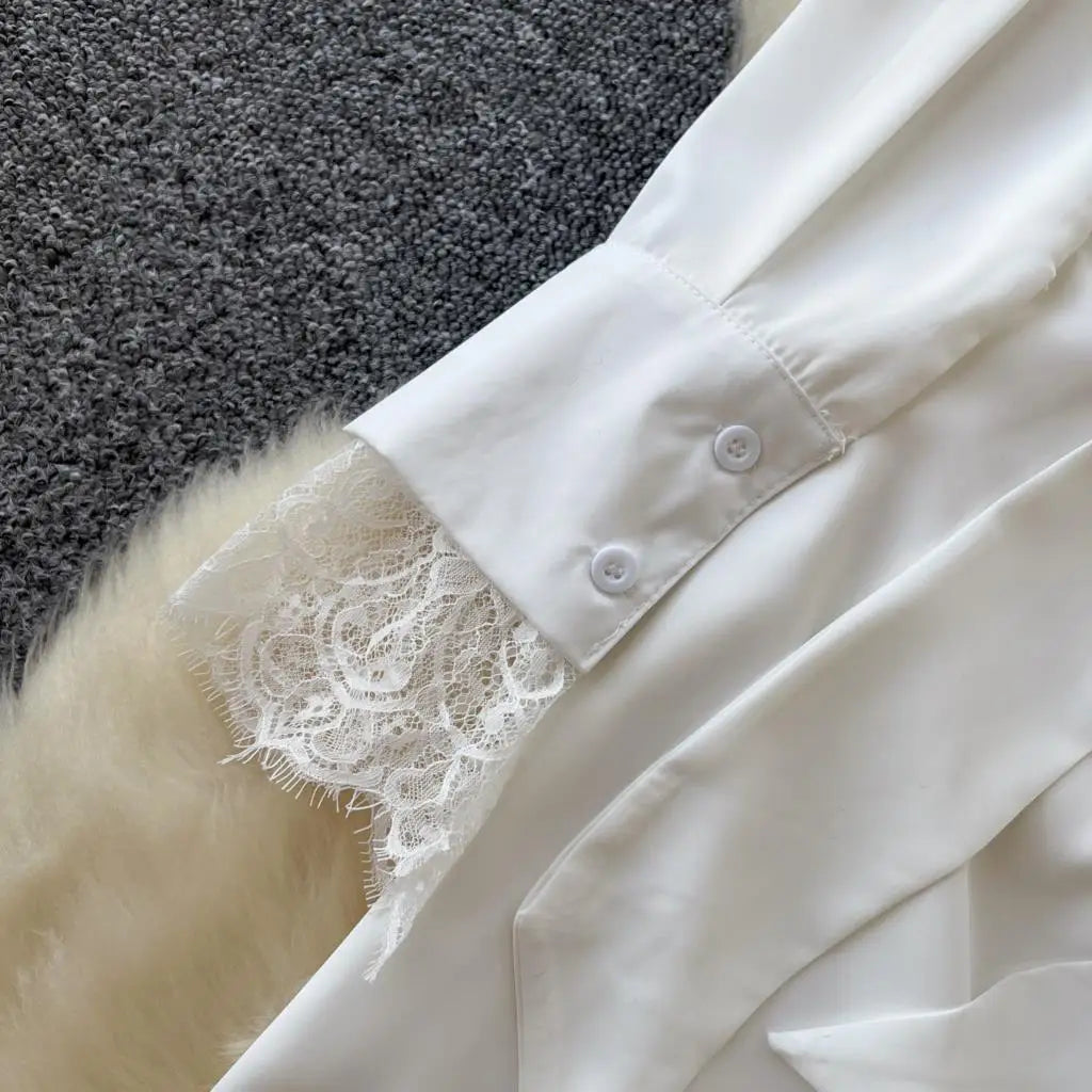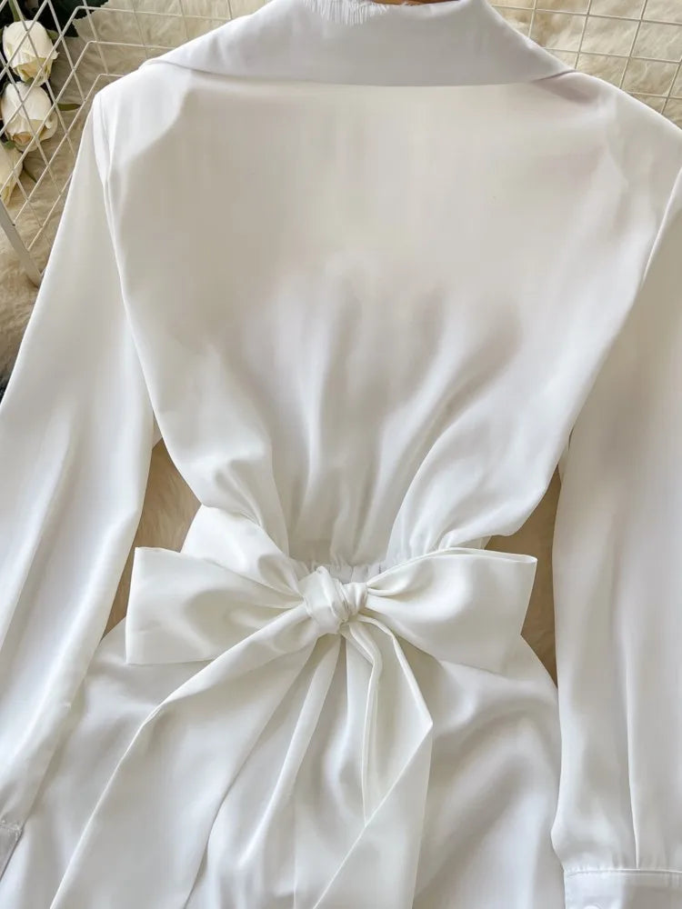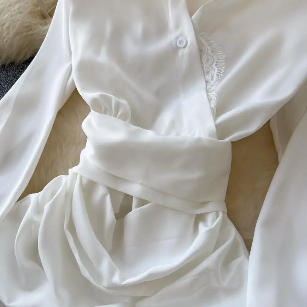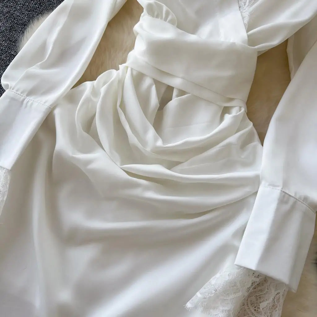 Elegant Solid Satin Midi Dress for Women Autumn Long Sleeve Lace Patchwork Office Work Shirt Dresses Lace-up Slim Waist Vestidos