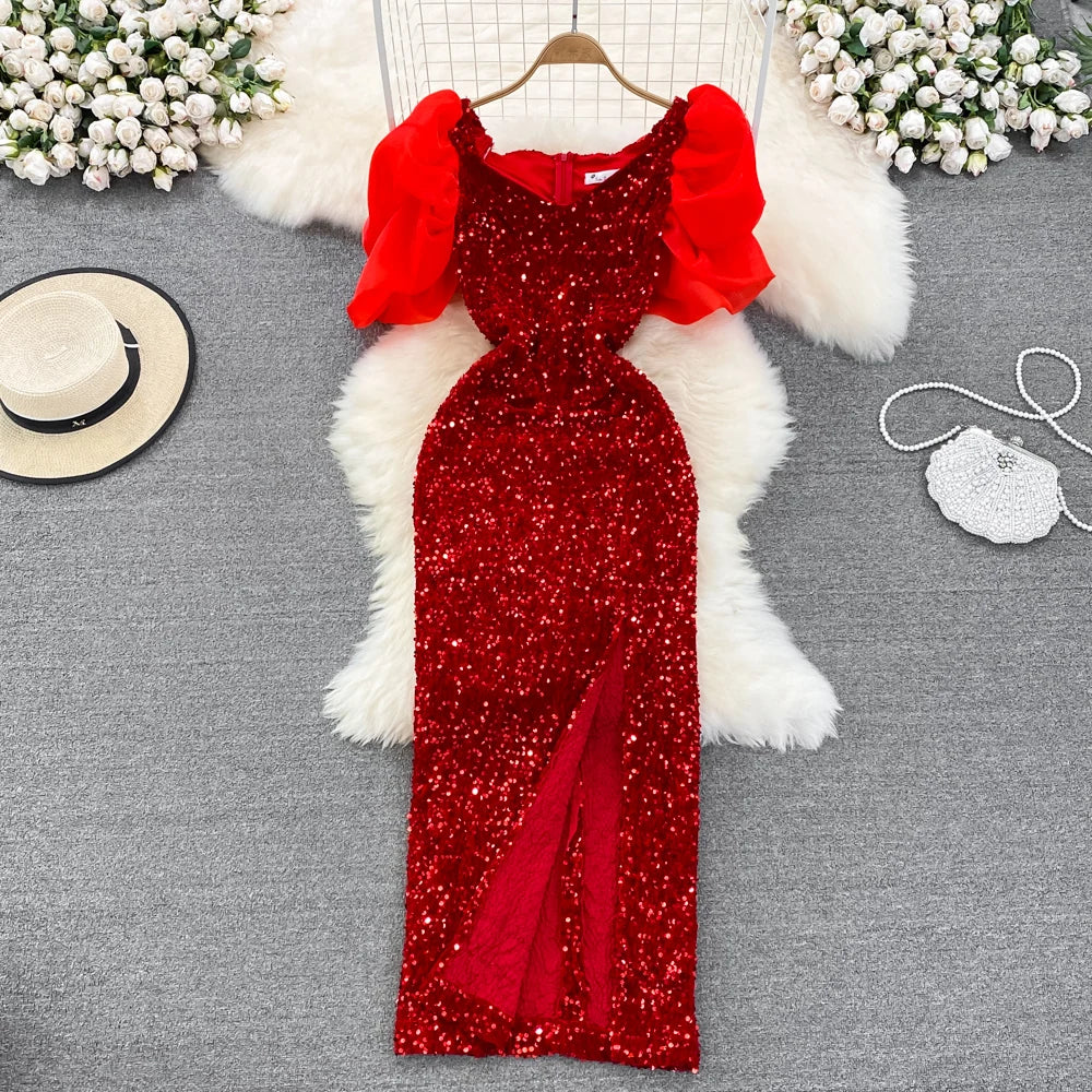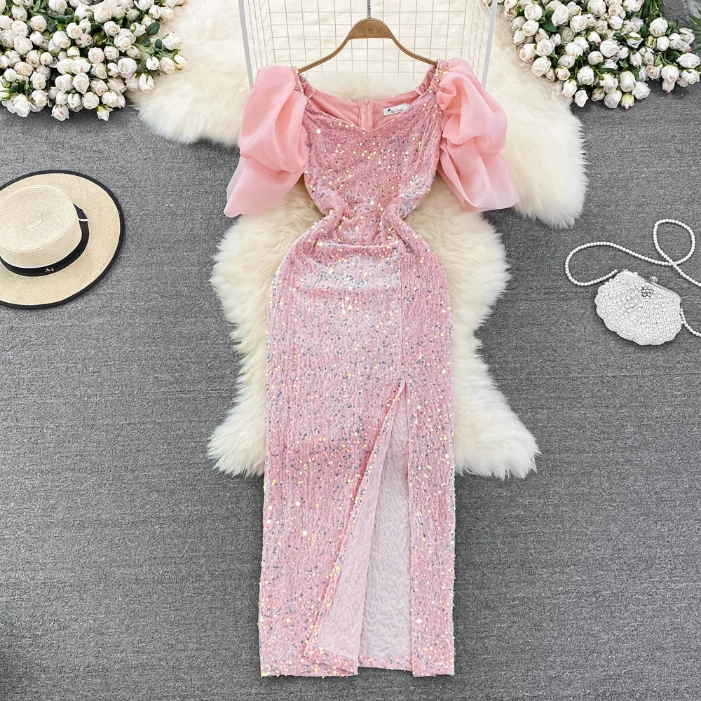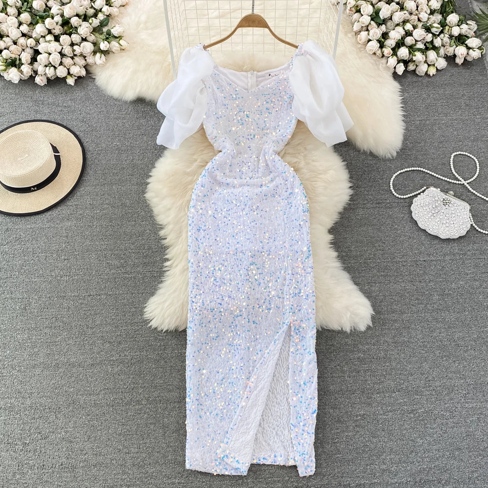 Elegant Square Collar Slim Sequin Women Dresses Luxury High Waist Long Banquet Dress Sexy High Slit Temperament Celebrity Gowns