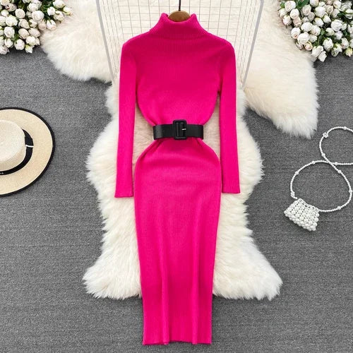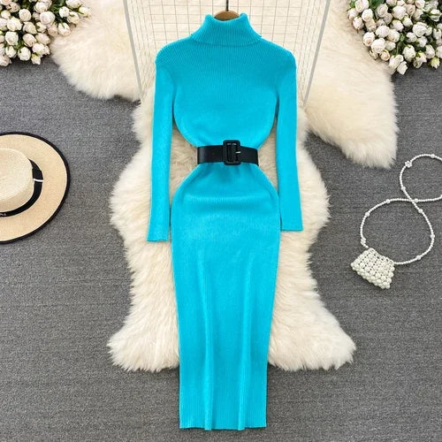Elegant Turtleneck Long Sleeve Knit Soft Tight Pencil Dress with Belt Slim Fashion Warm Sweater Vestido Sexy Women Winter Robe