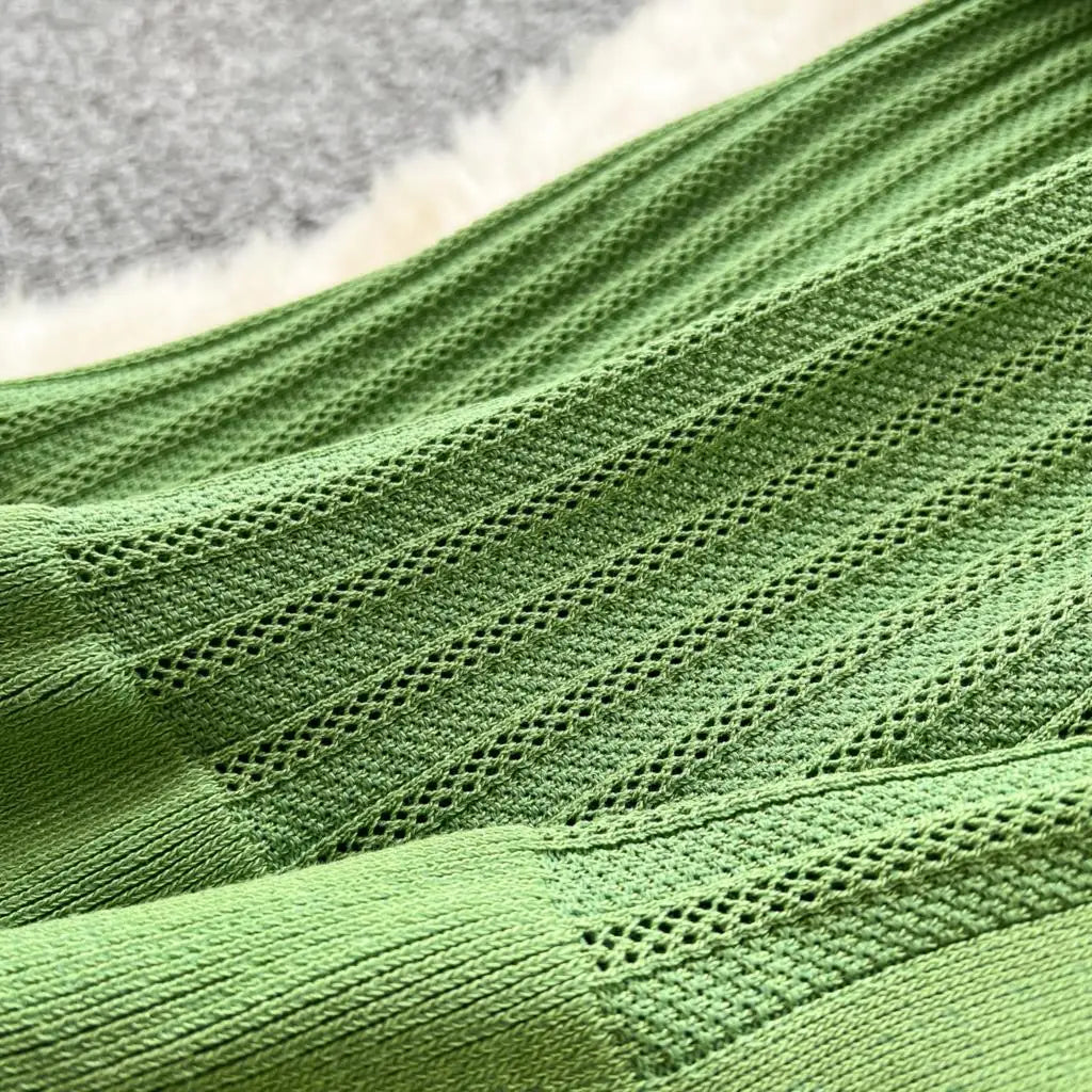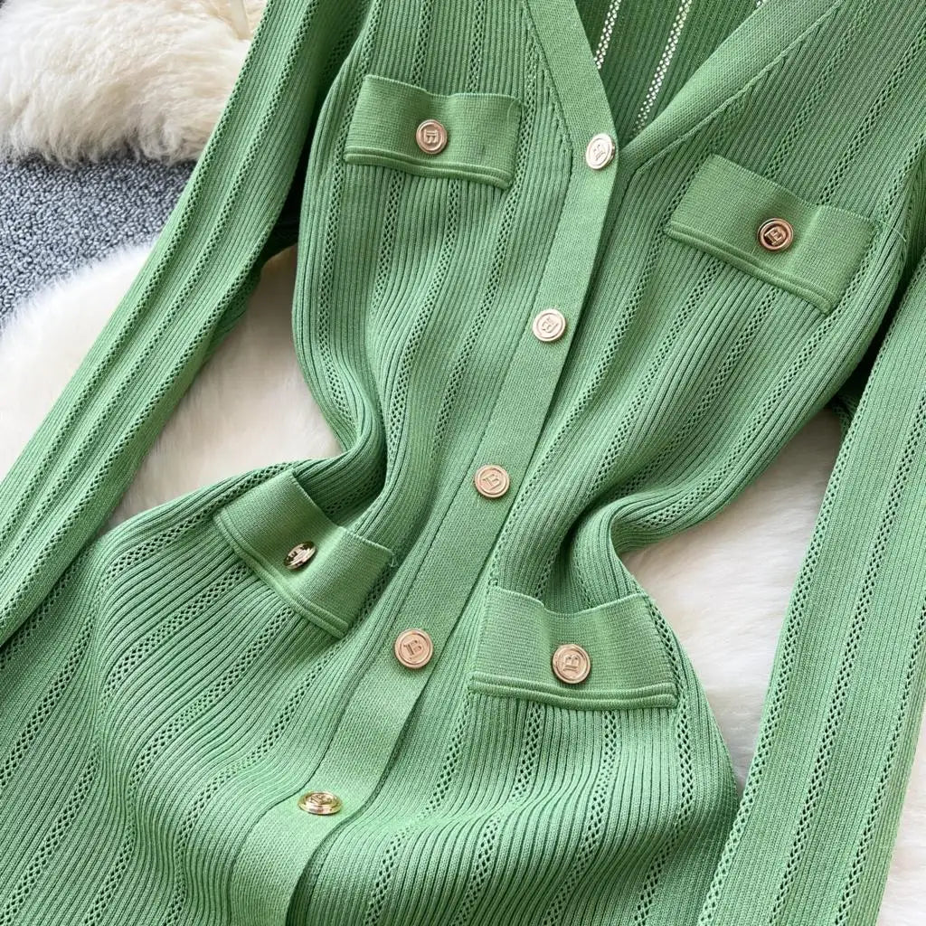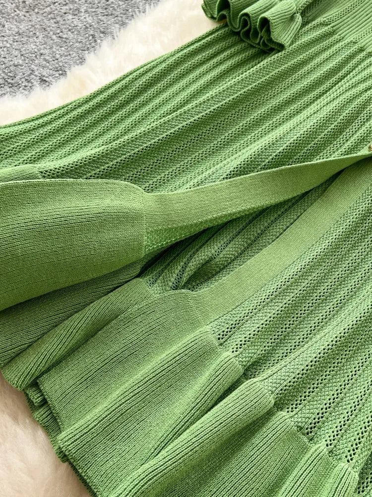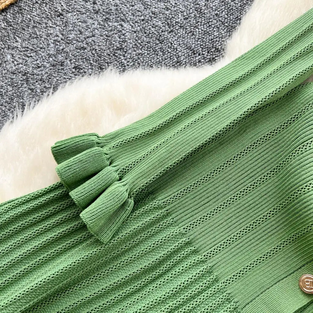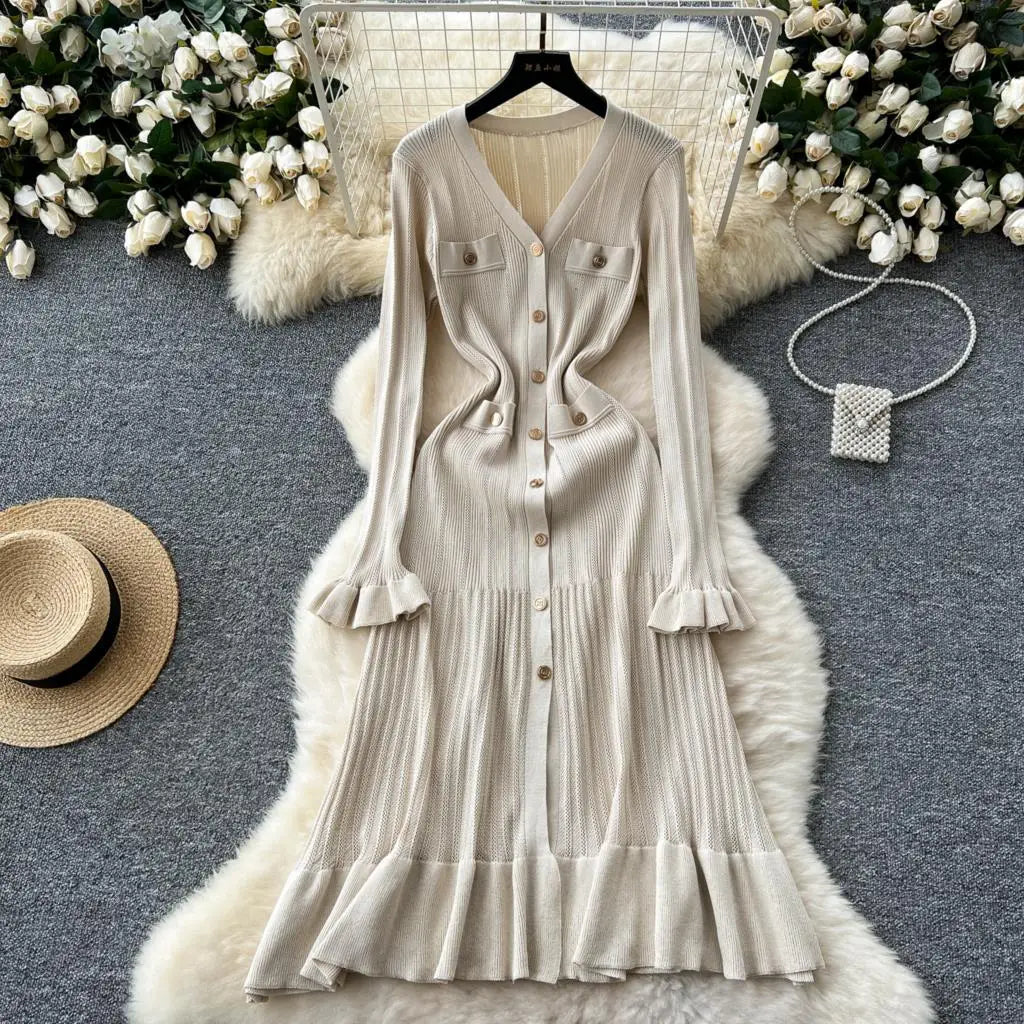 Elegant Women Solid Knitted Dresses Autumn V-Neck Single Breasted Chic Flared Sleeve Ruffles Hem Casual Female Slim Office Robes