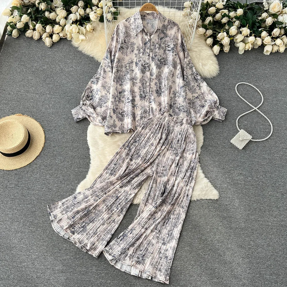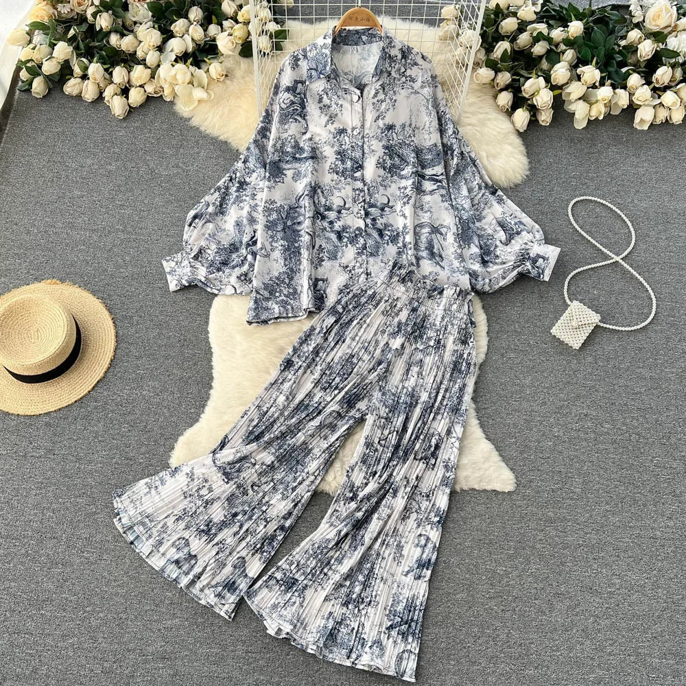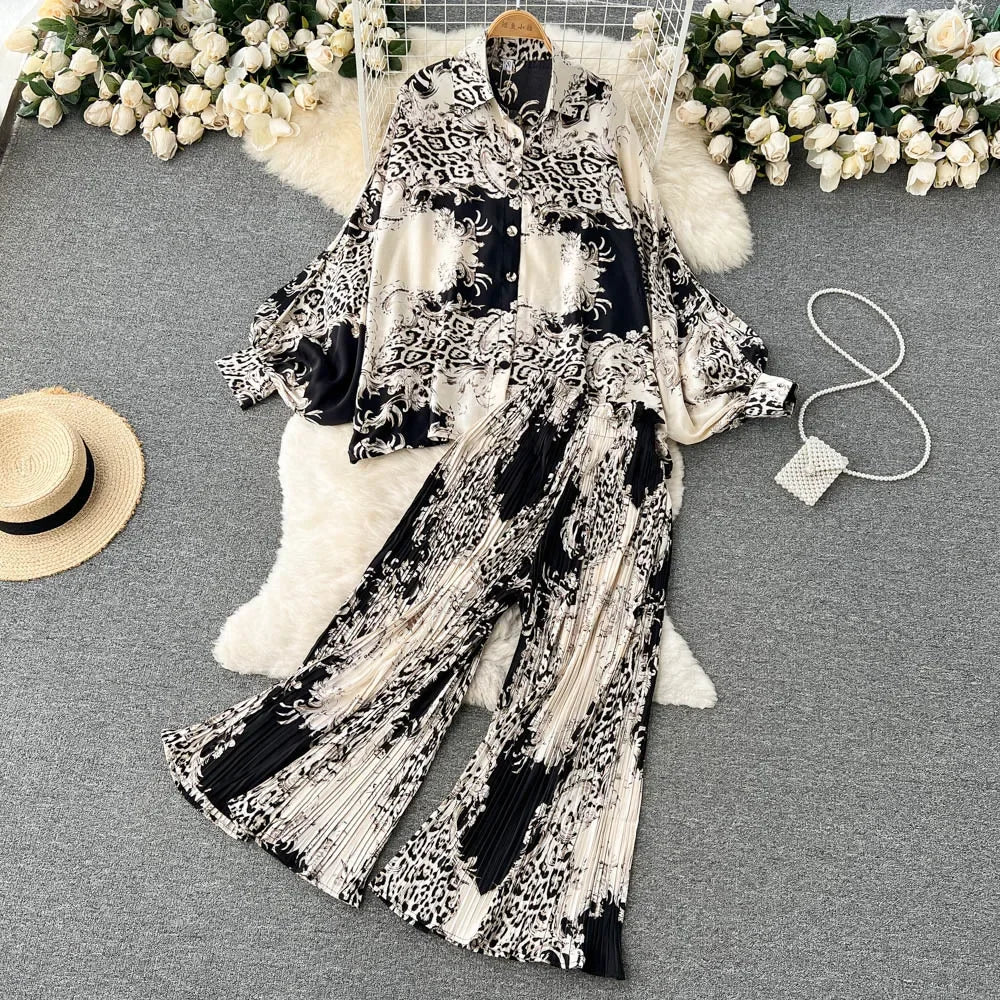Fashion Women Pajamas 2-piece Sets Lantern Sleeve Printed Shirt Top + High Waist Casual Wide Leg Pants Two-piece Set Sleepwear