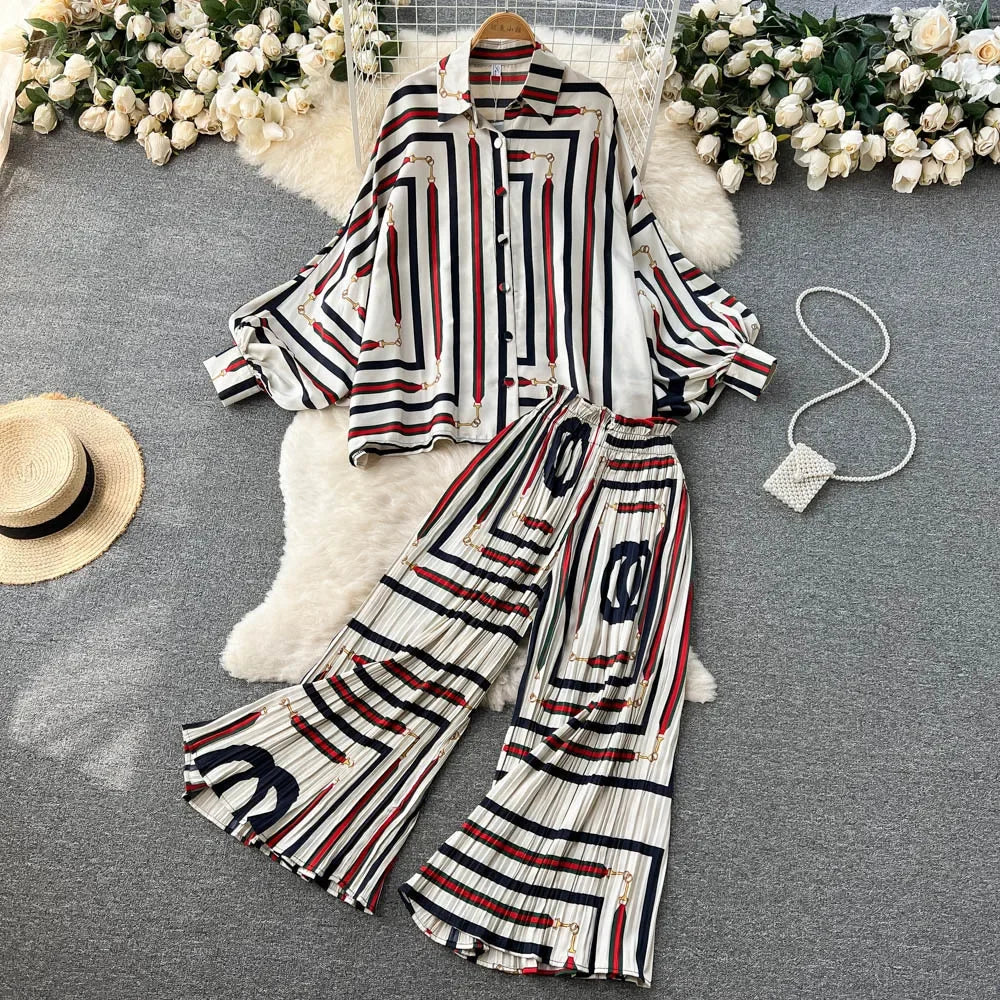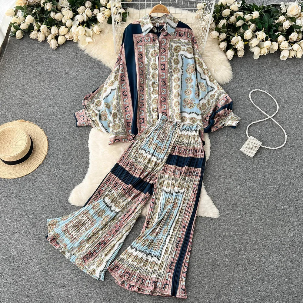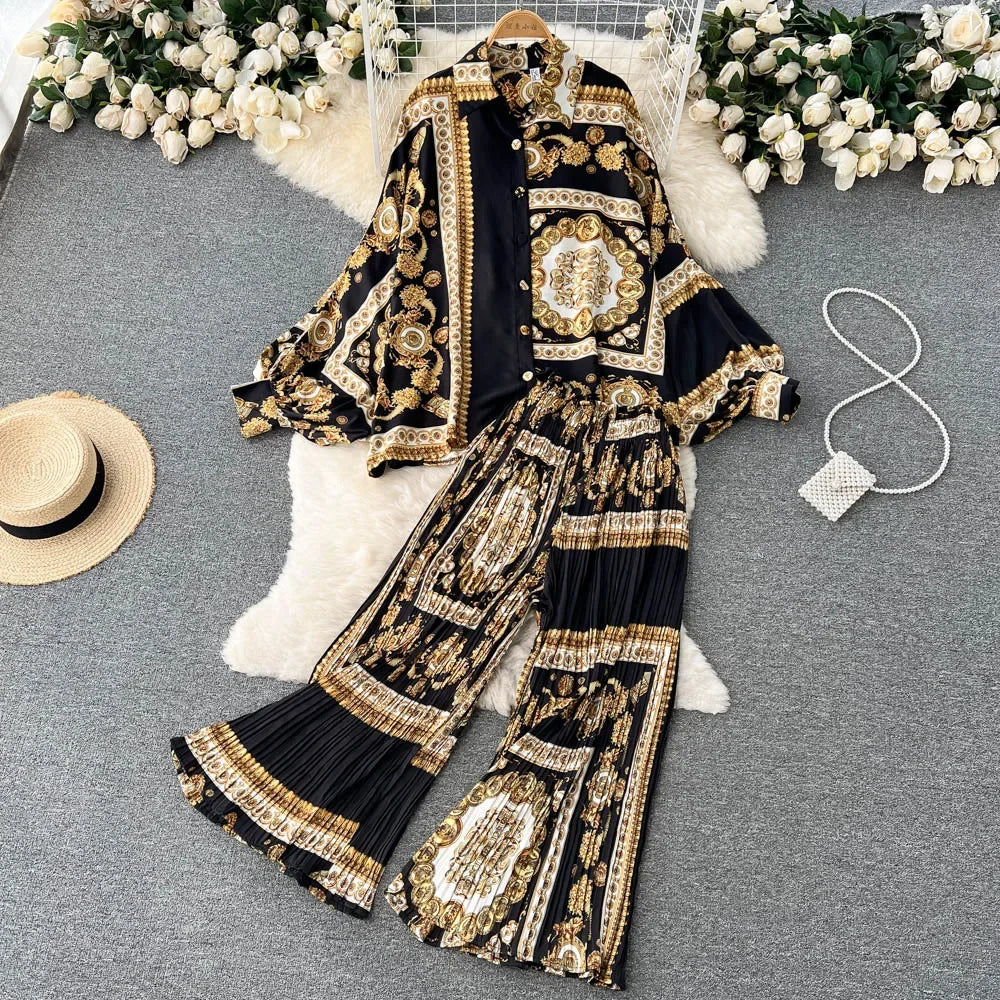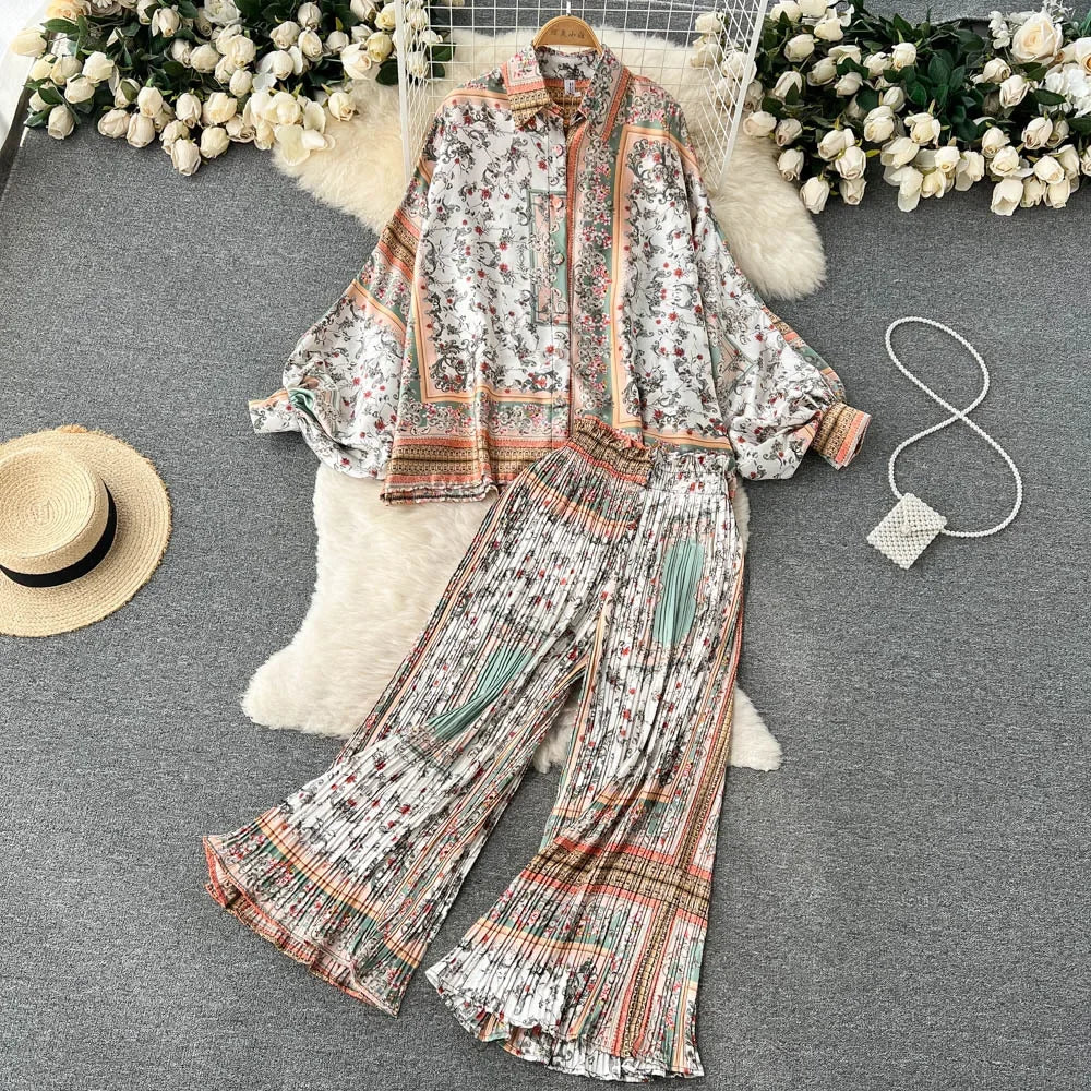 Fashion Women Pajamas 2-piece Sets Lantern Sleeve Printed Shirt Top + High Waist Casual Wide Leg Pants Two-piece Set Sleepwear