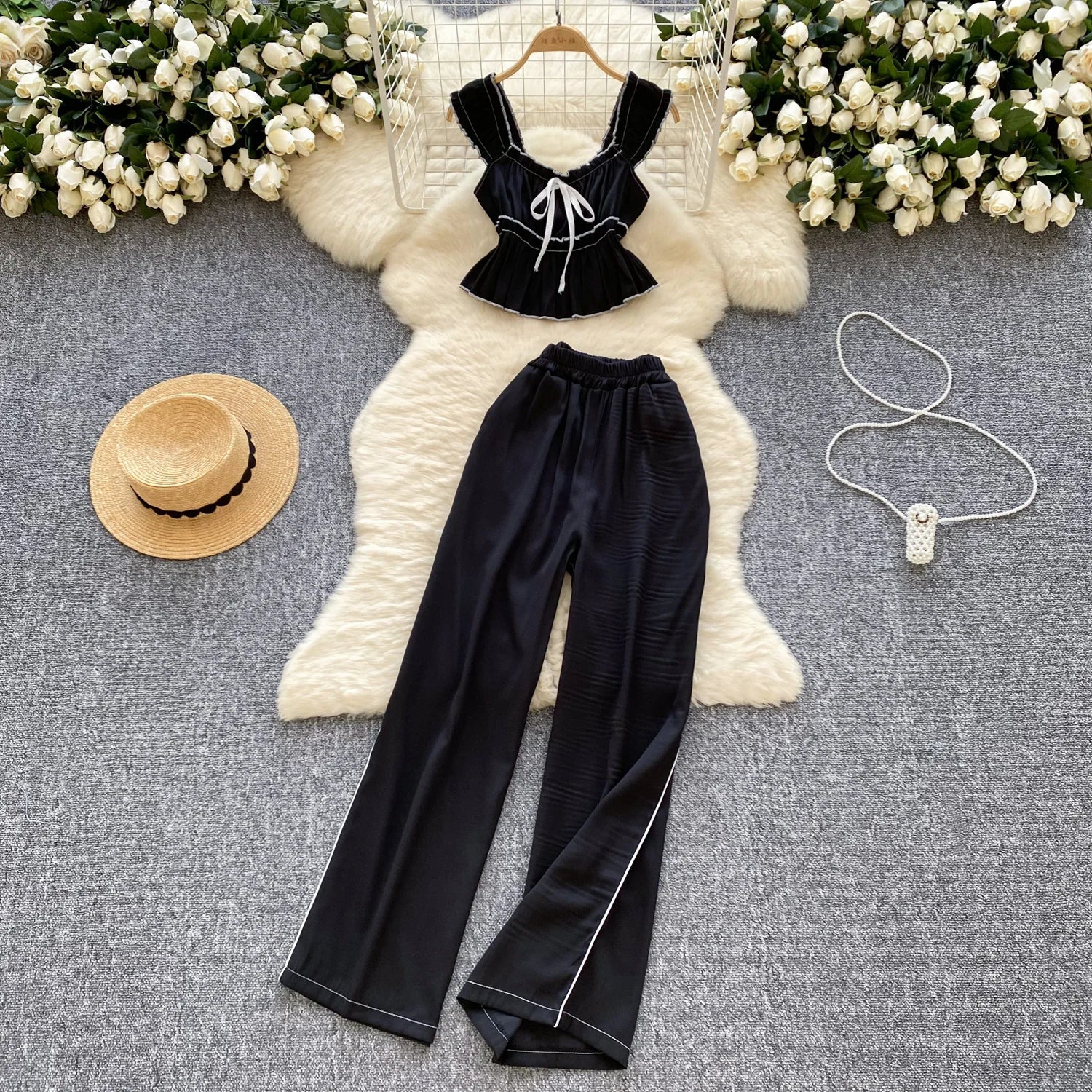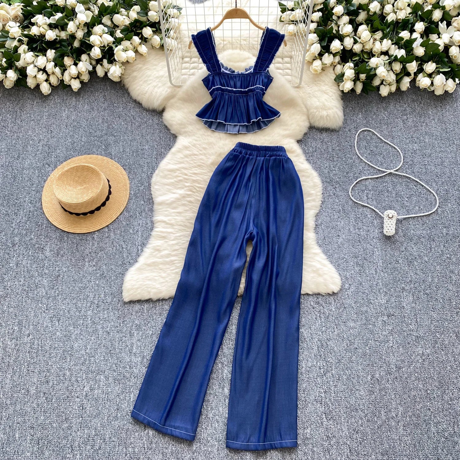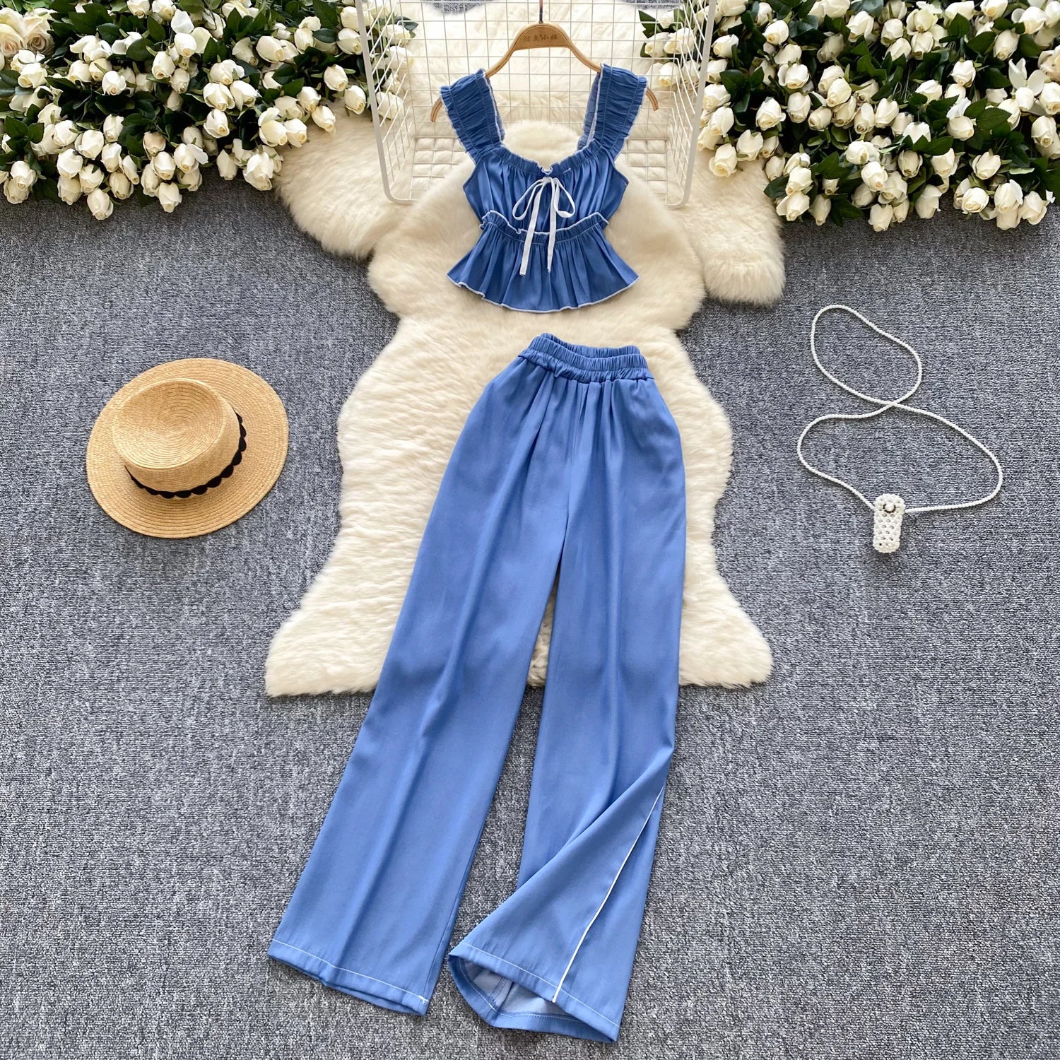 Fashion Womens Two Peice Sets Folds Lace-up Sleeveless Tank + Wide Leg Pants Elastic High Waisted Autumn Suits Ruched Dropship