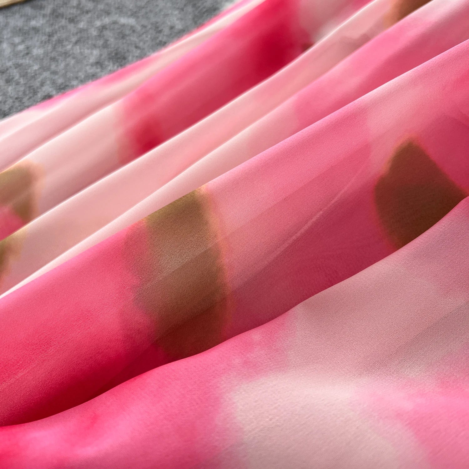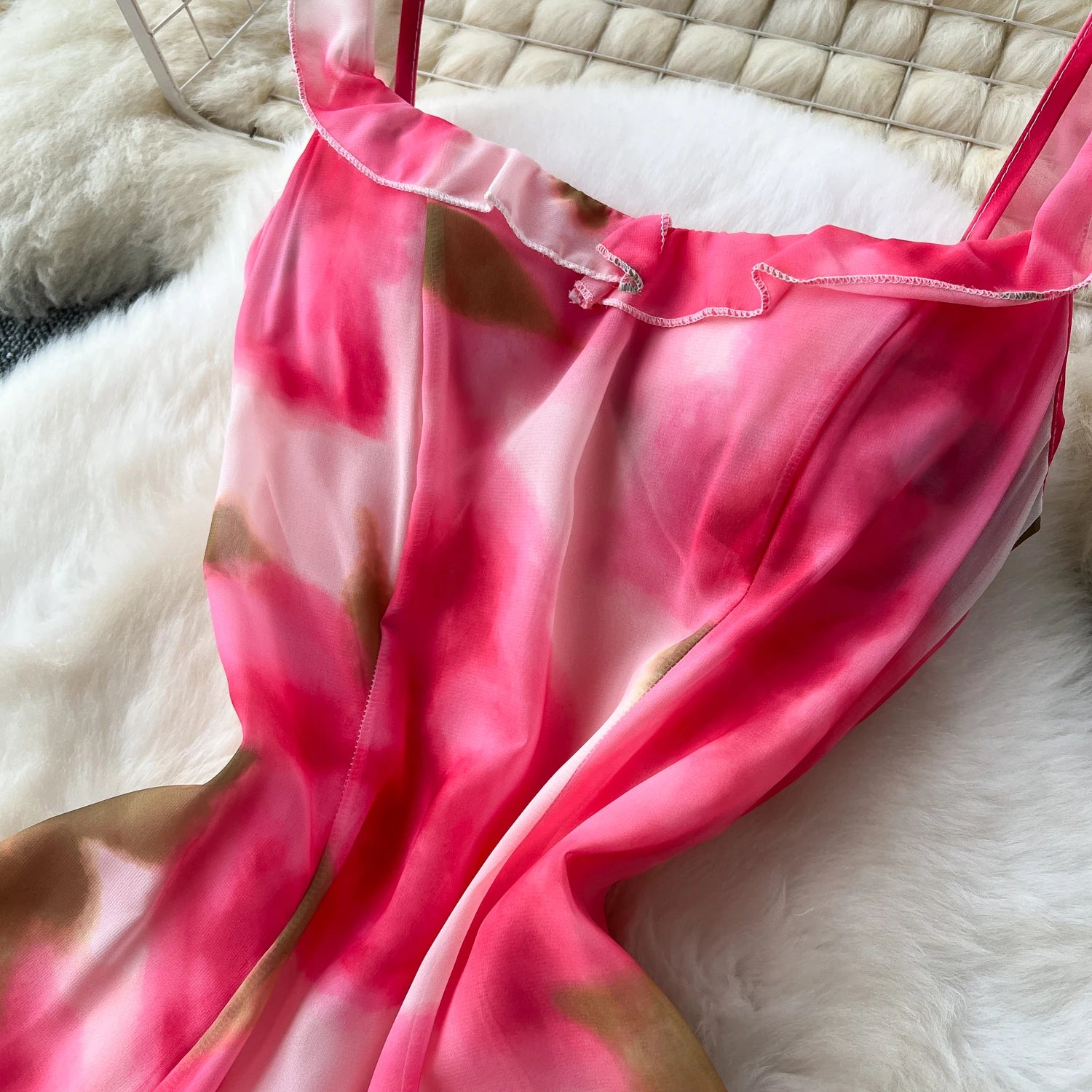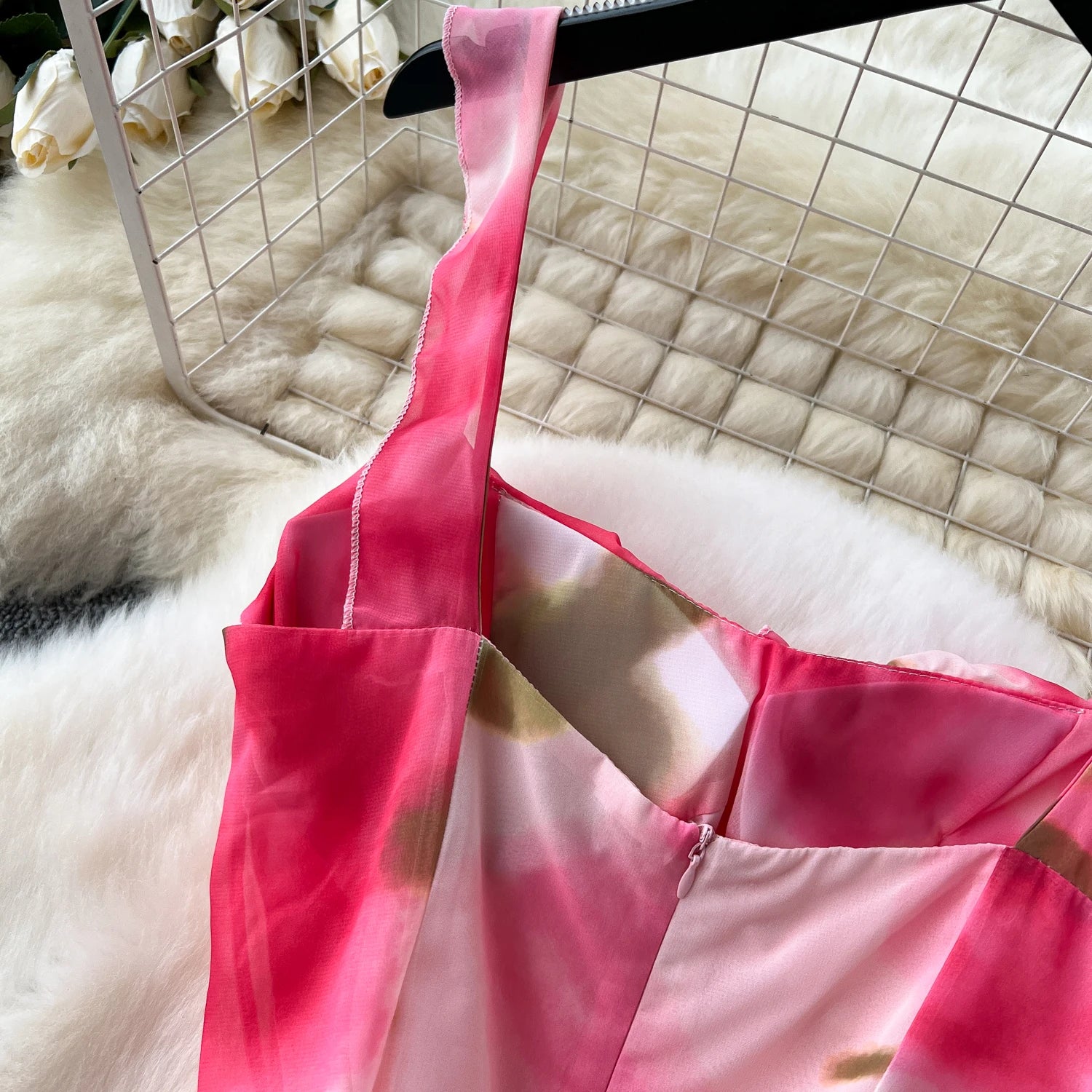 French Elegant Beach Dress Women Rose Print High Waist Chiffon Dresses Ladies Sleeveless Slim A-line Boho Long Robe Vestidos