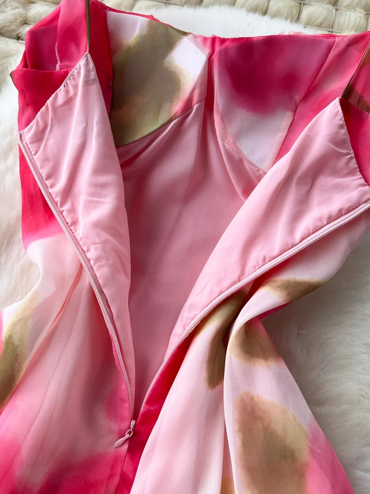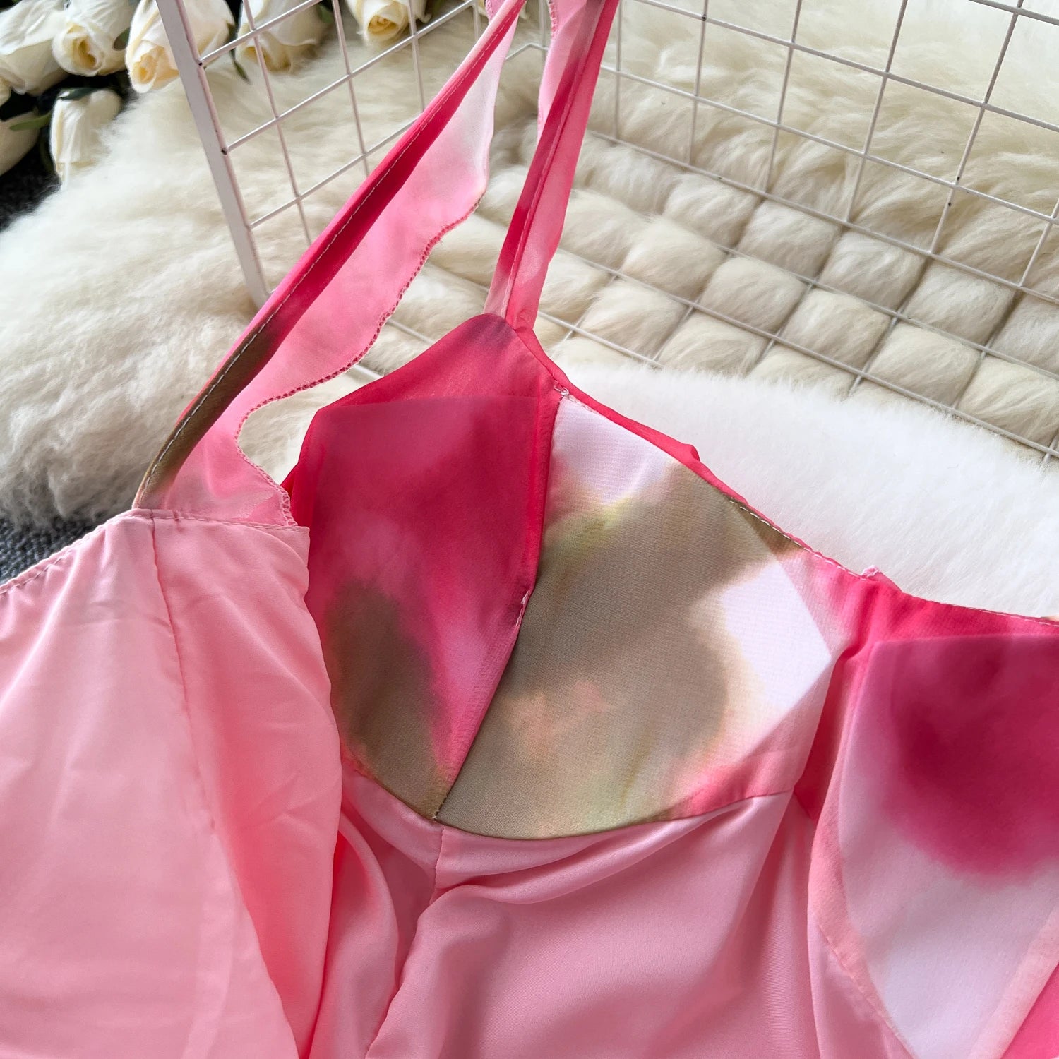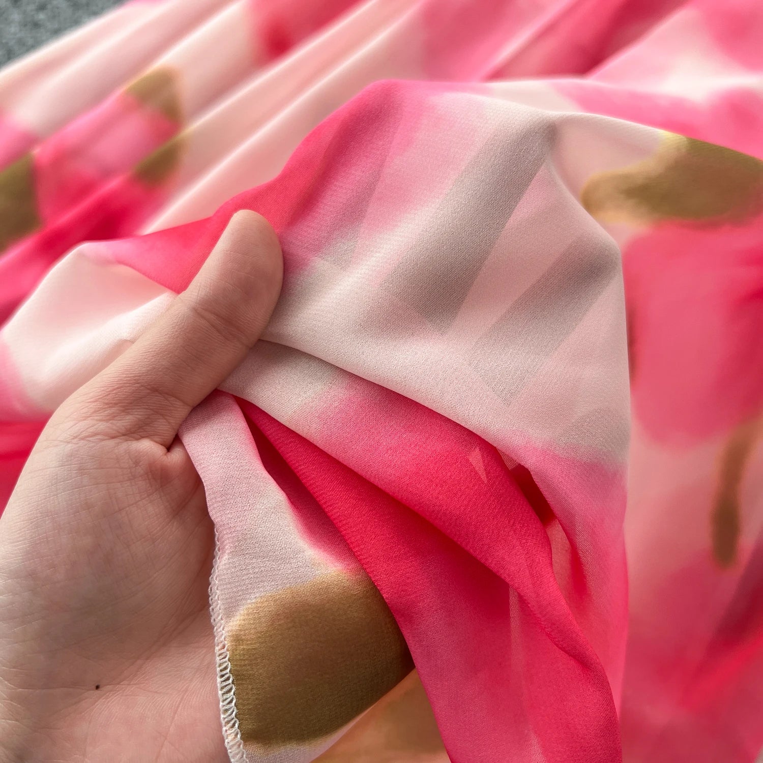 French Elegant Beach Dress Women Rose Print High Waist Chiffon Dresses Ladies Sleeveless Slim A-line Boho Long Robe Vestidos