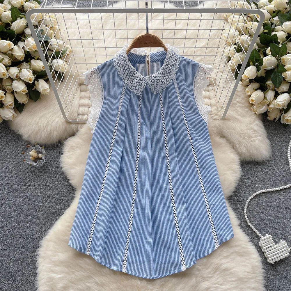 French Elegant Little Flying Sleeve Shirt Top Women's Summer Casual Loose Lace Hook Flower Retro Blue Striped Blouse Tops