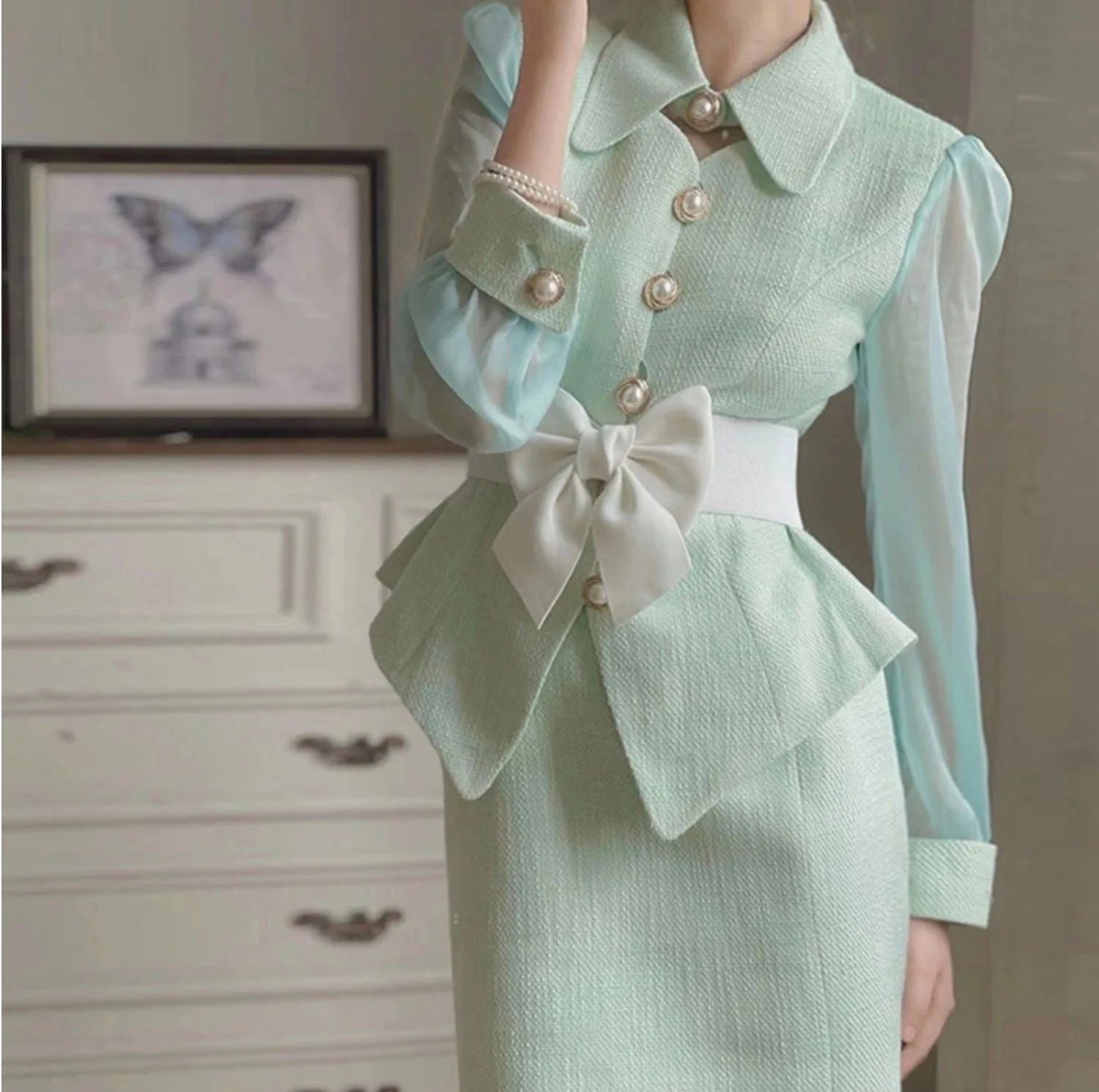 French Luxury Small Fragrance Suit Thick Tweed Two Piece Set with Long Sleeve Slim Waist Coat with Bow+Short Skirt Sets