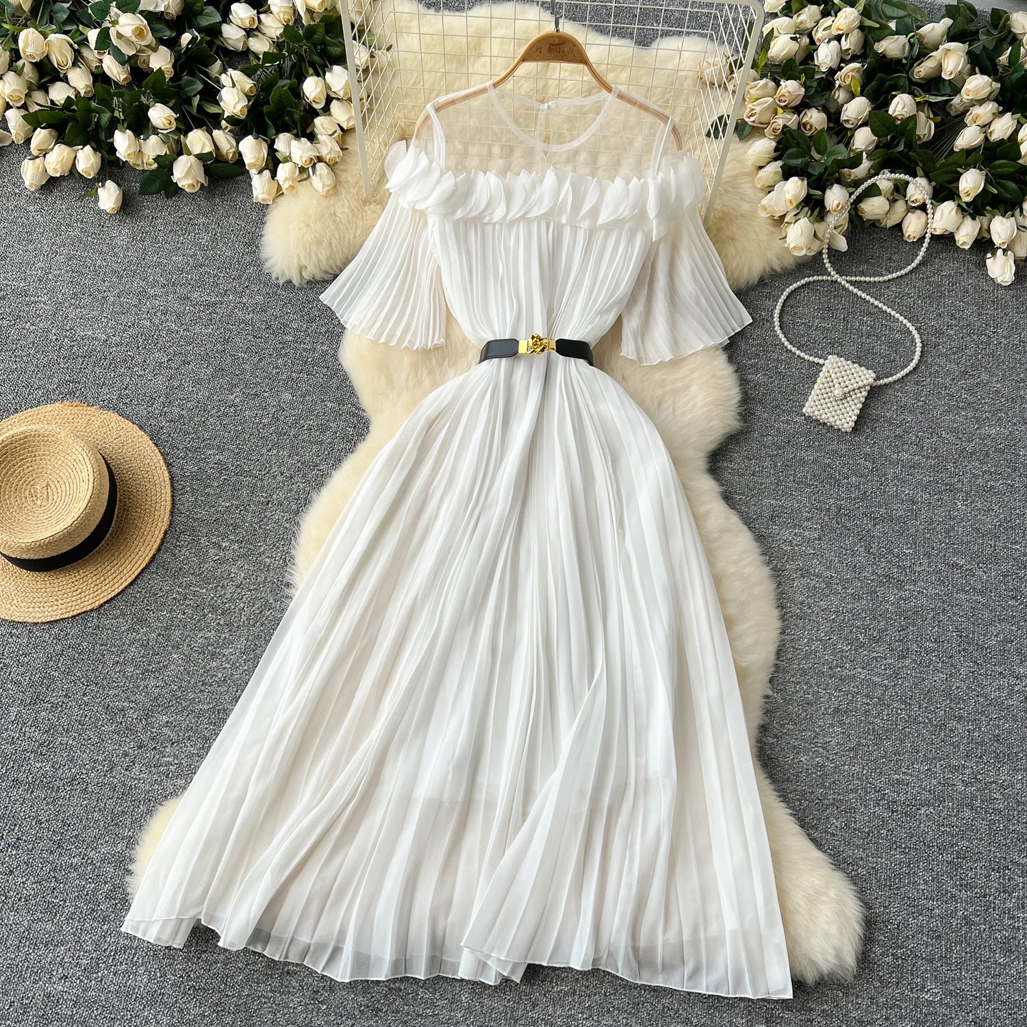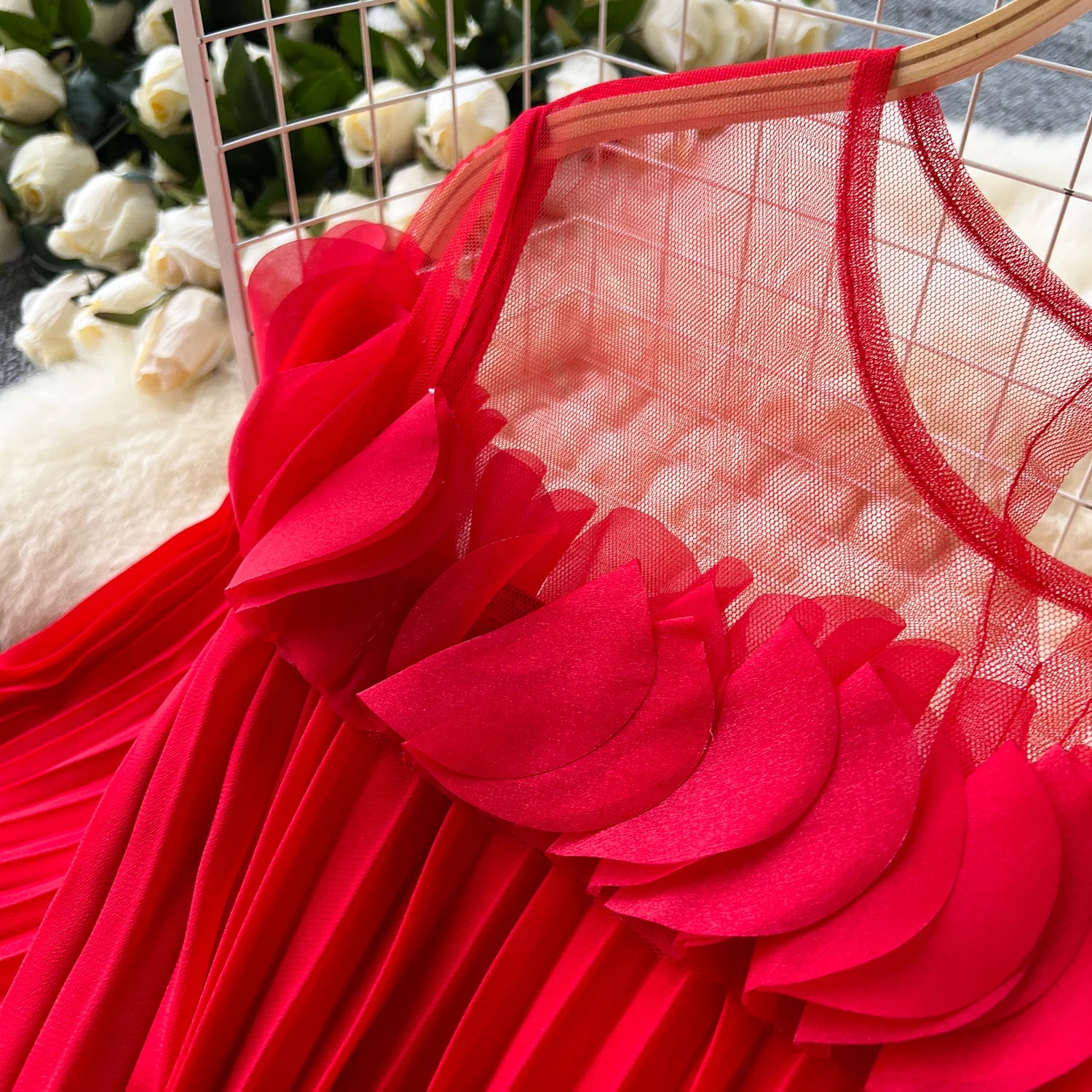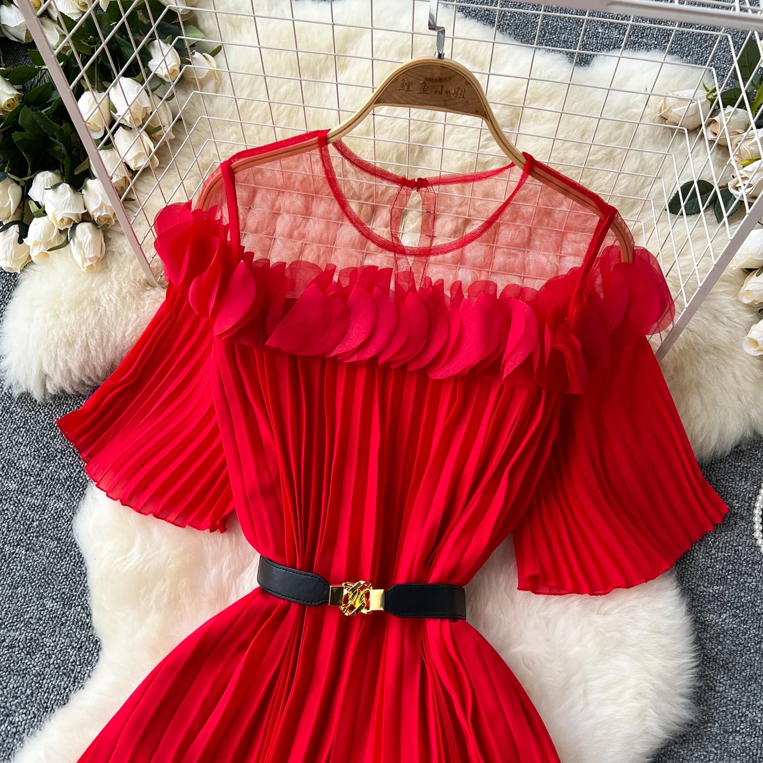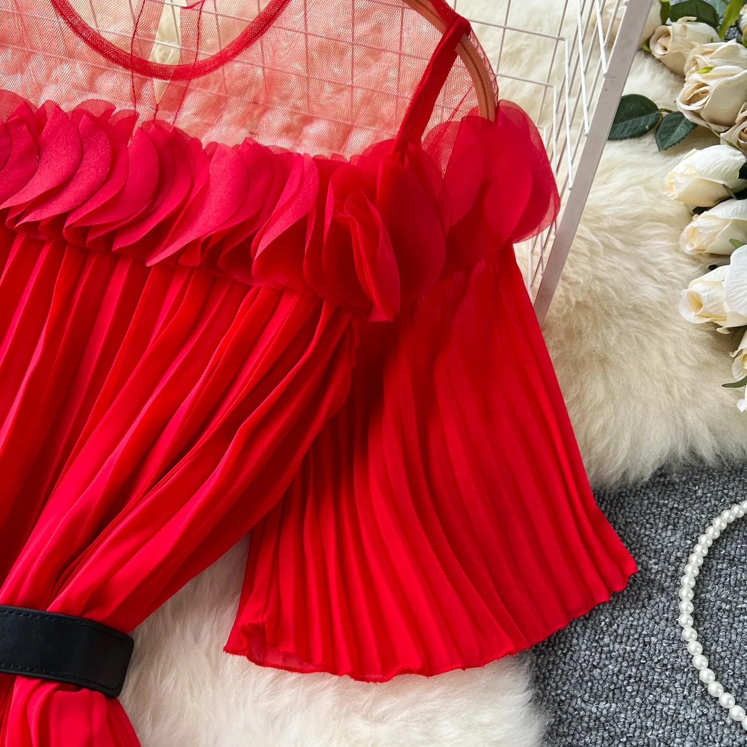 French mesh PATCHWORK Three-dimensional flower Sweet Dress Women Summer Waist Cinching pleated chiffon Dresses