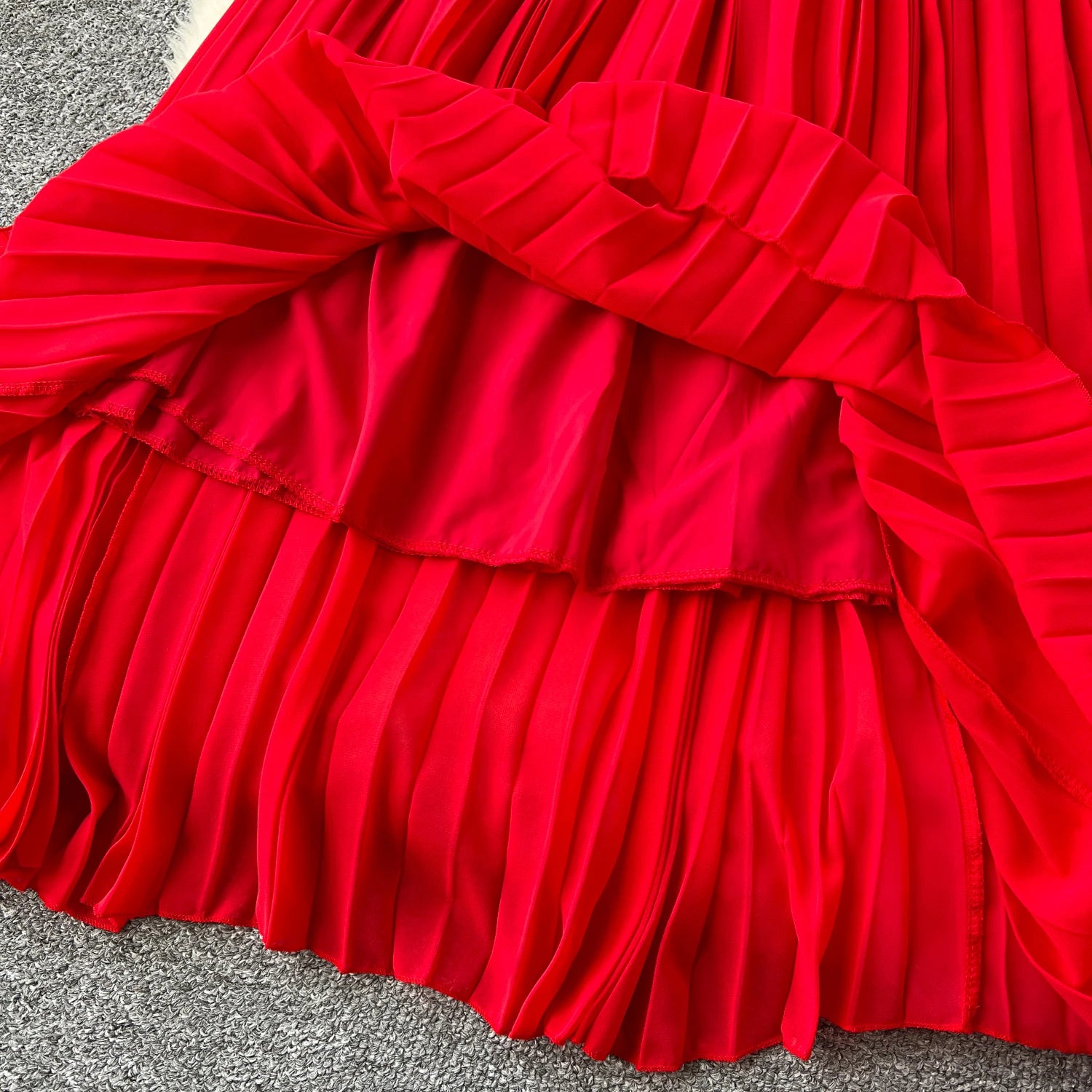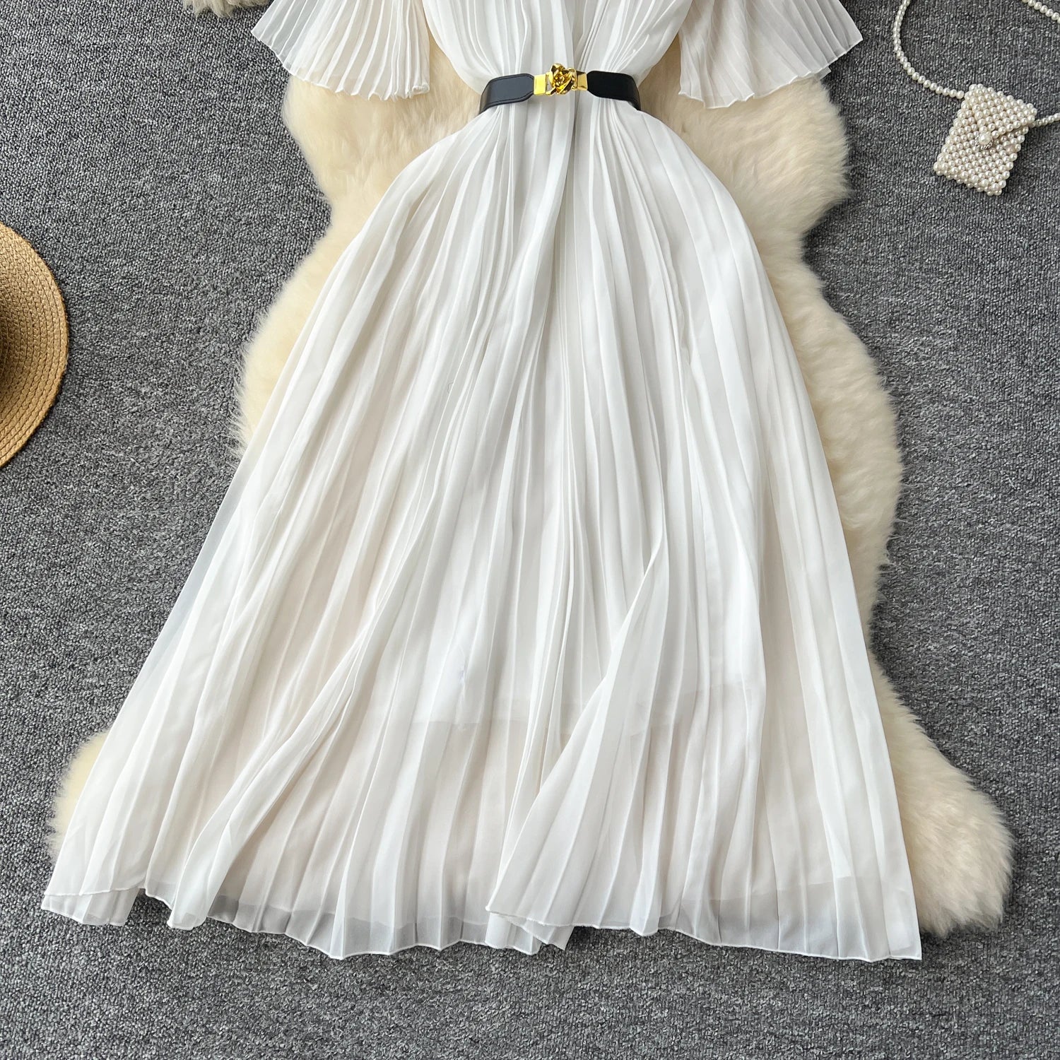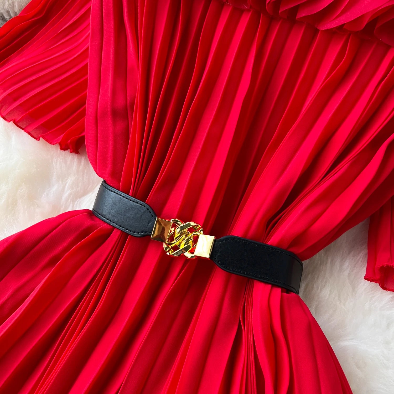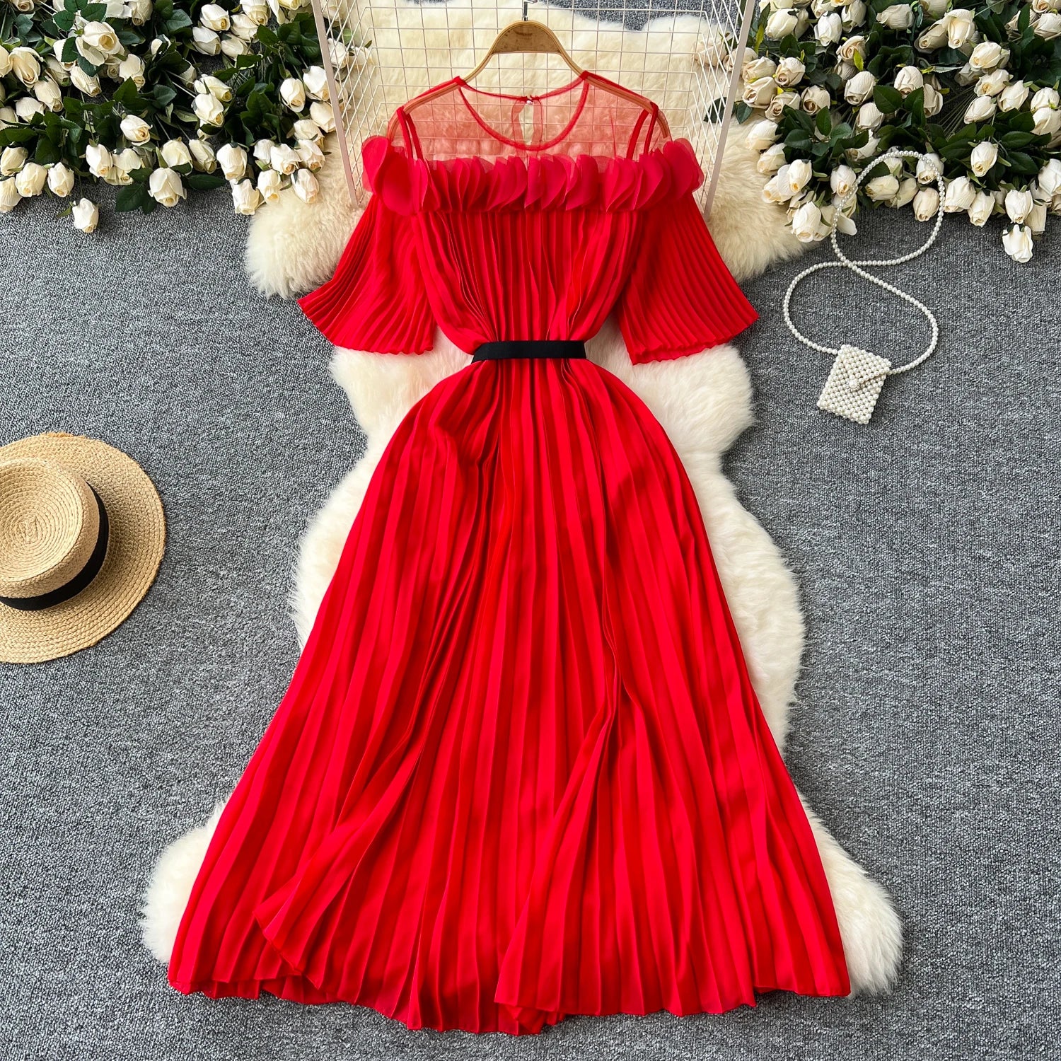 French mesh PATCHWORK Three-dimensional flower Sweet Dress Women Summer Waist Cinching pleated chiffon Dresses