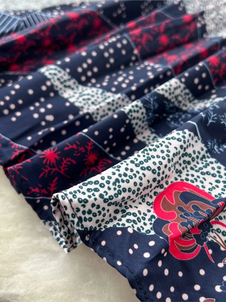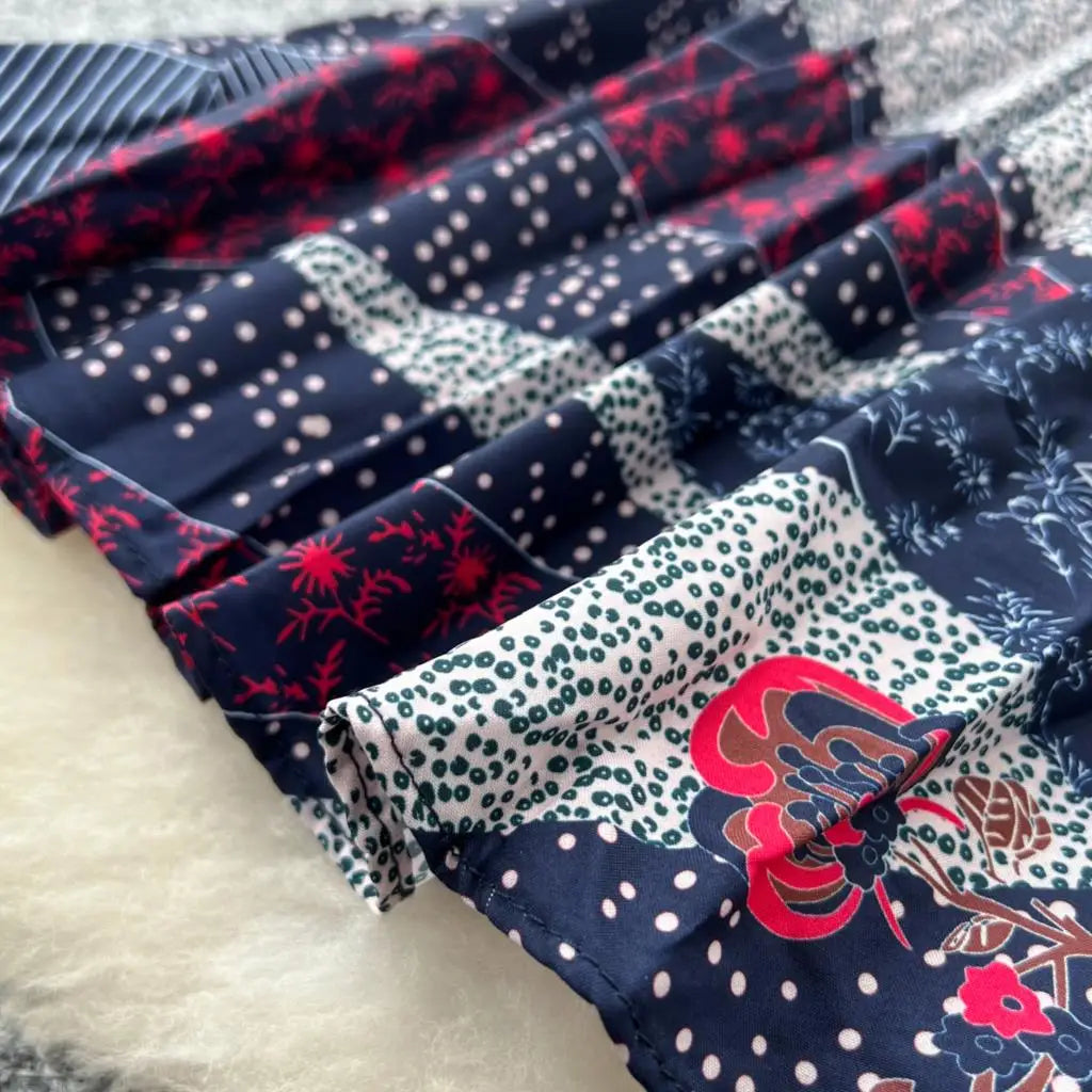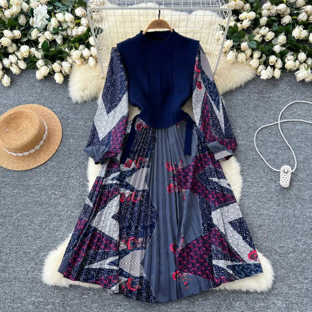 French Vintage Patchwork Print Knitted Dress Elegant and Chic Boho Beach Holiday Dresses A-Line Slim Waist Pleated Vestidos New