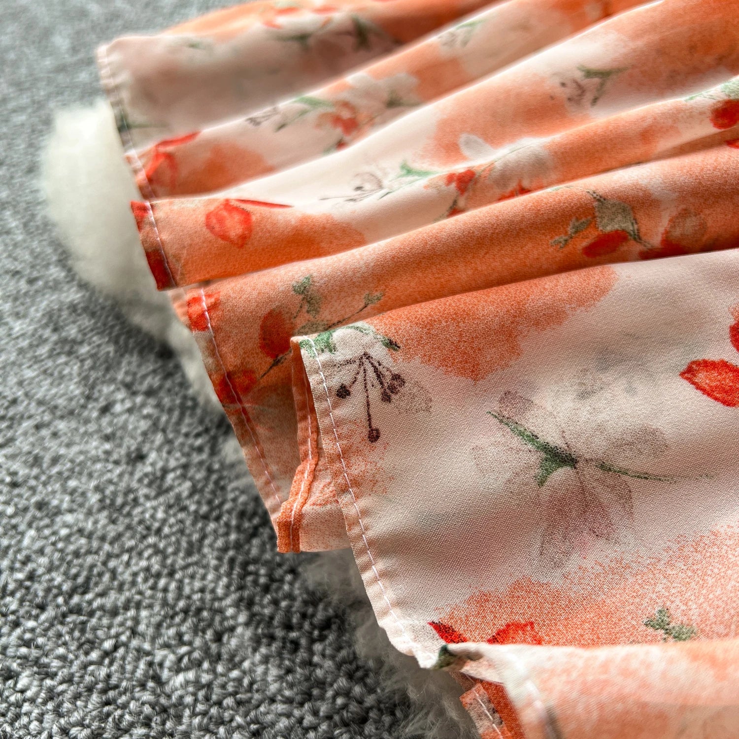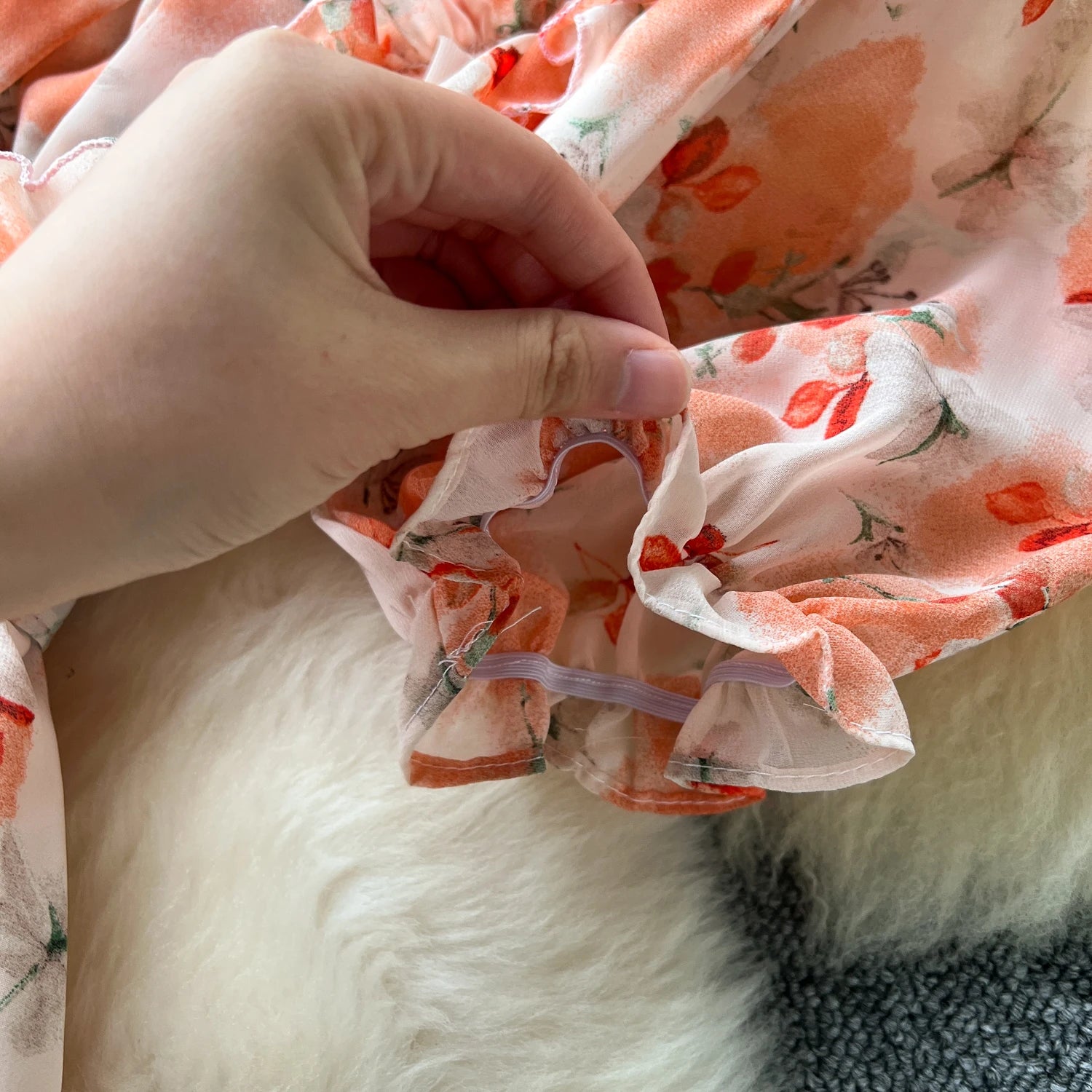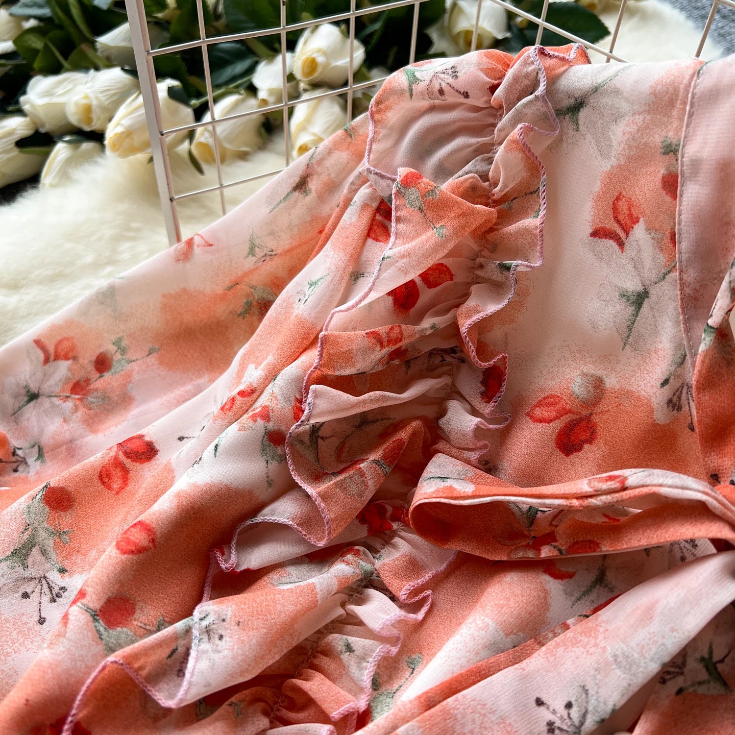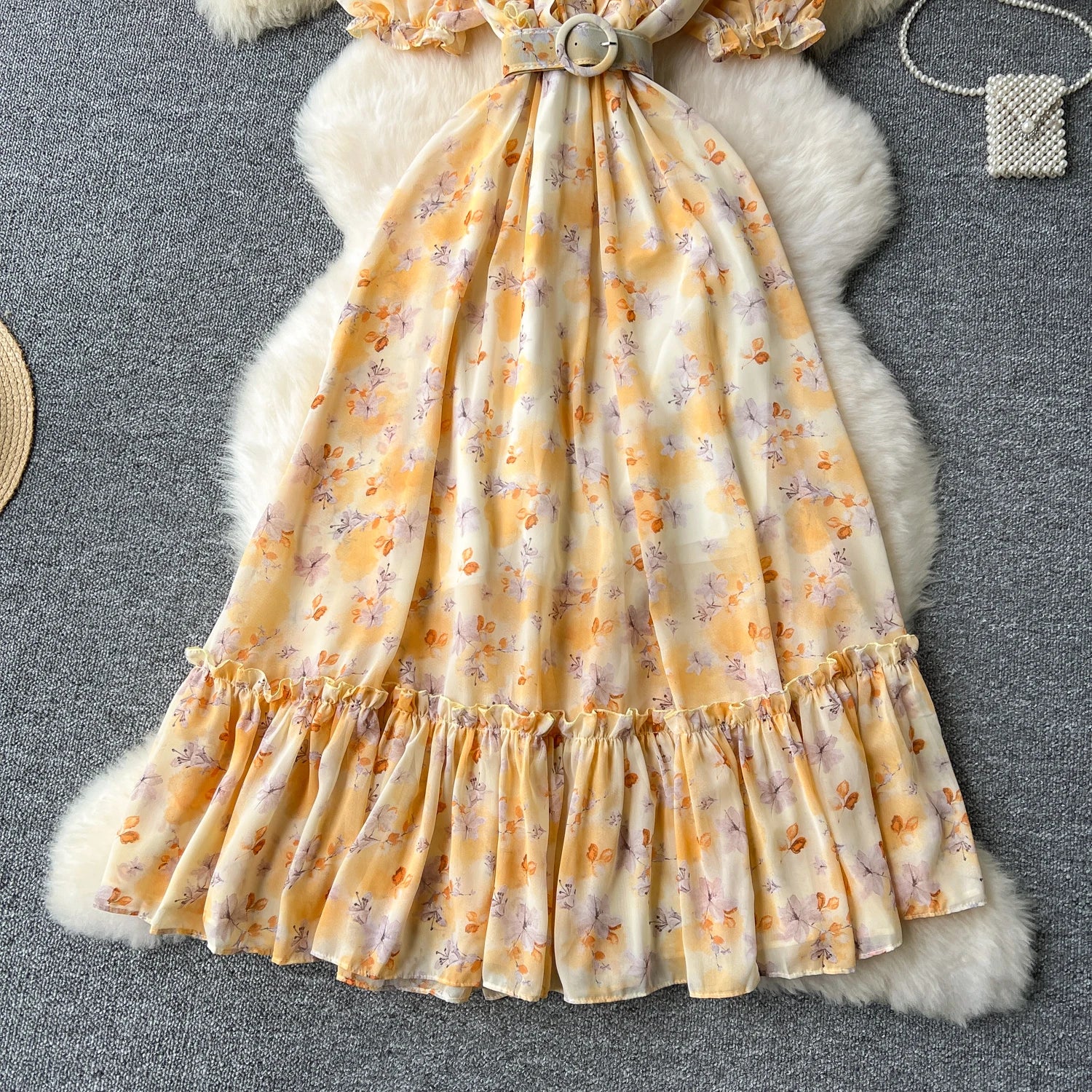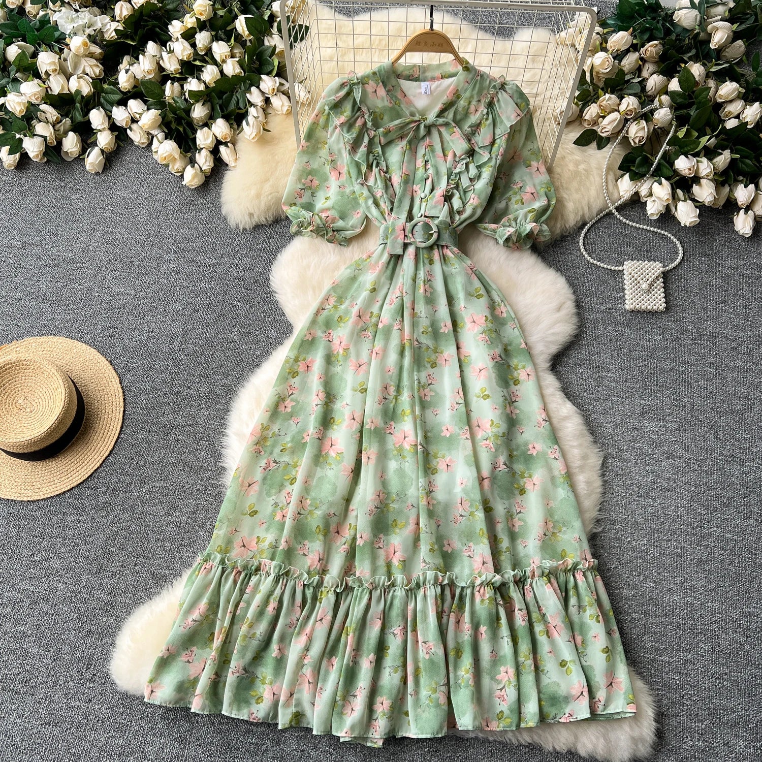 French Vintage Ruffle print chiffon Bandage Bow Puff Sleeves short Sleeves Dress Casual Women Fashion summer dresses