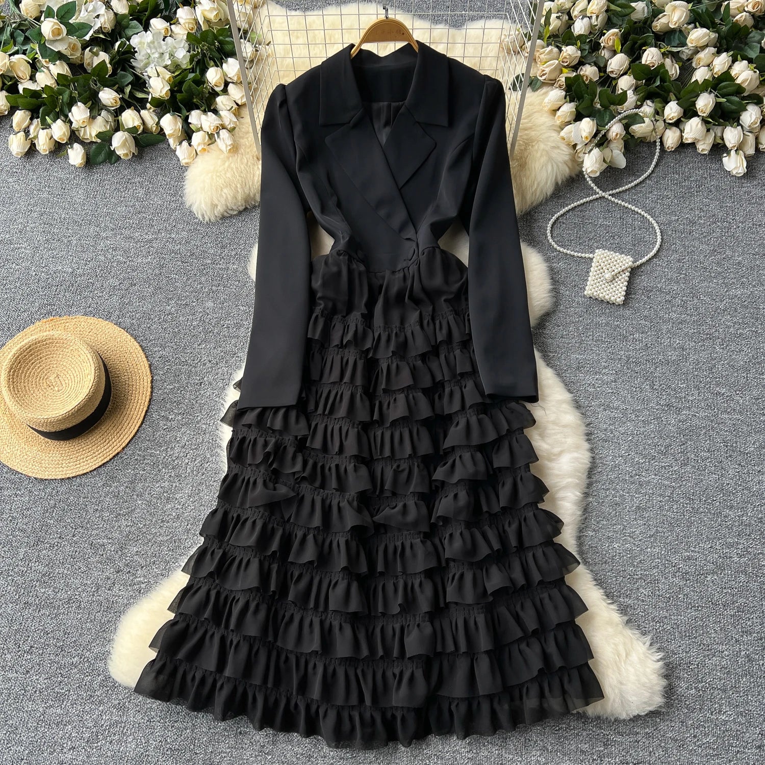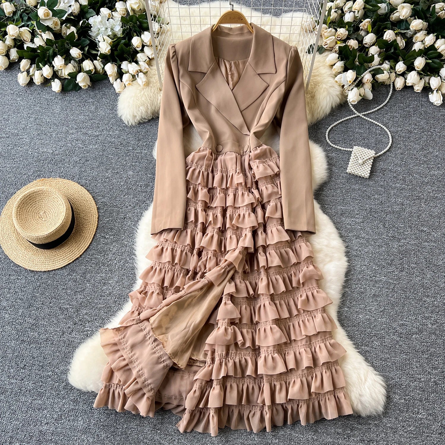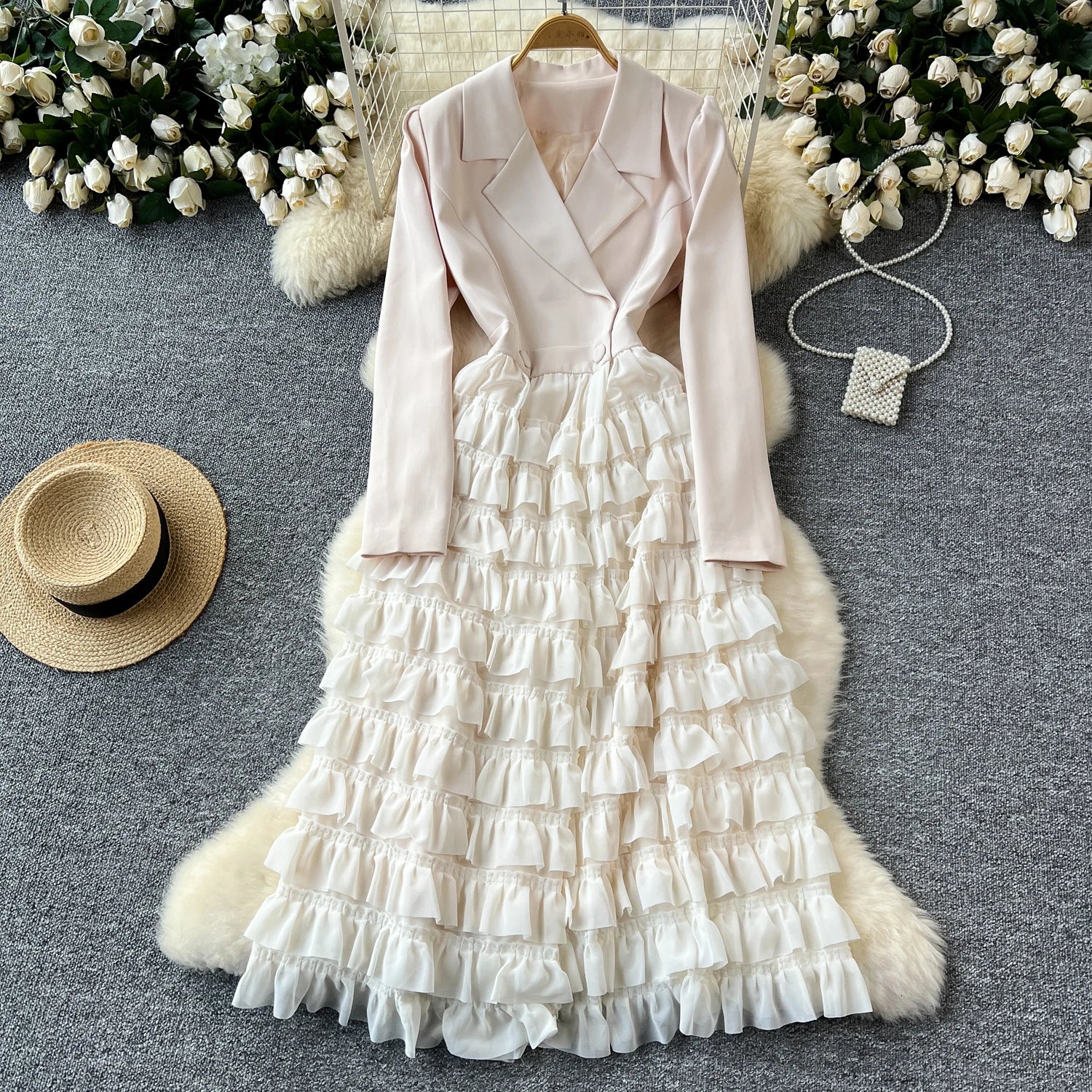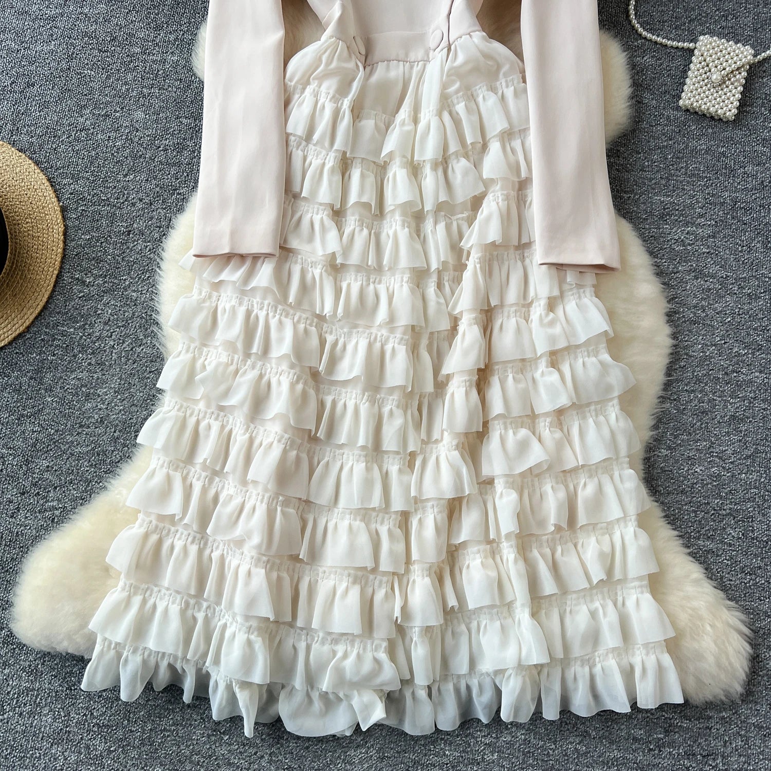 French Vintage Two Pieces Sets Notched lool sleeve mesh sweet A-line Chic PATCHWORK Women Summer dresses