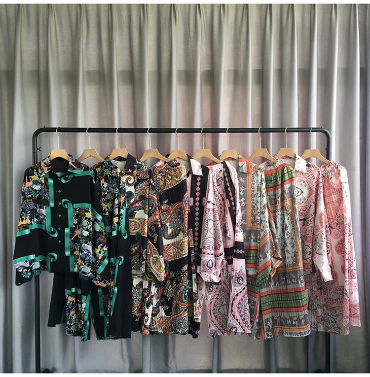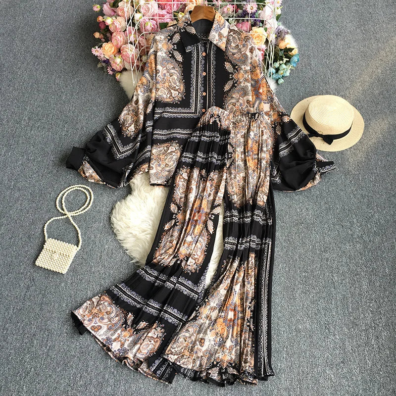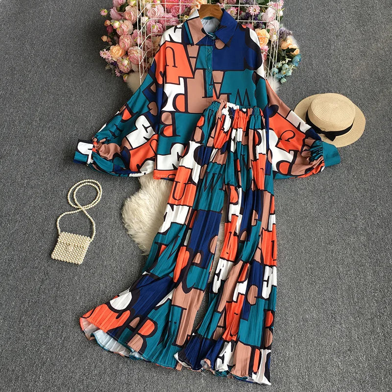 Geometric Pleated Women Pajamas Two Piece Set Batwing Sleeve Shirt Tops Elastic Waist Loose Wide-leg Pants Loungewear Streetwear