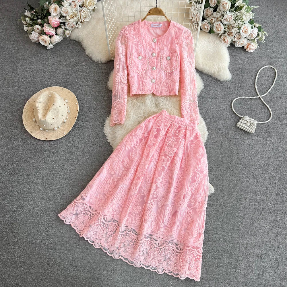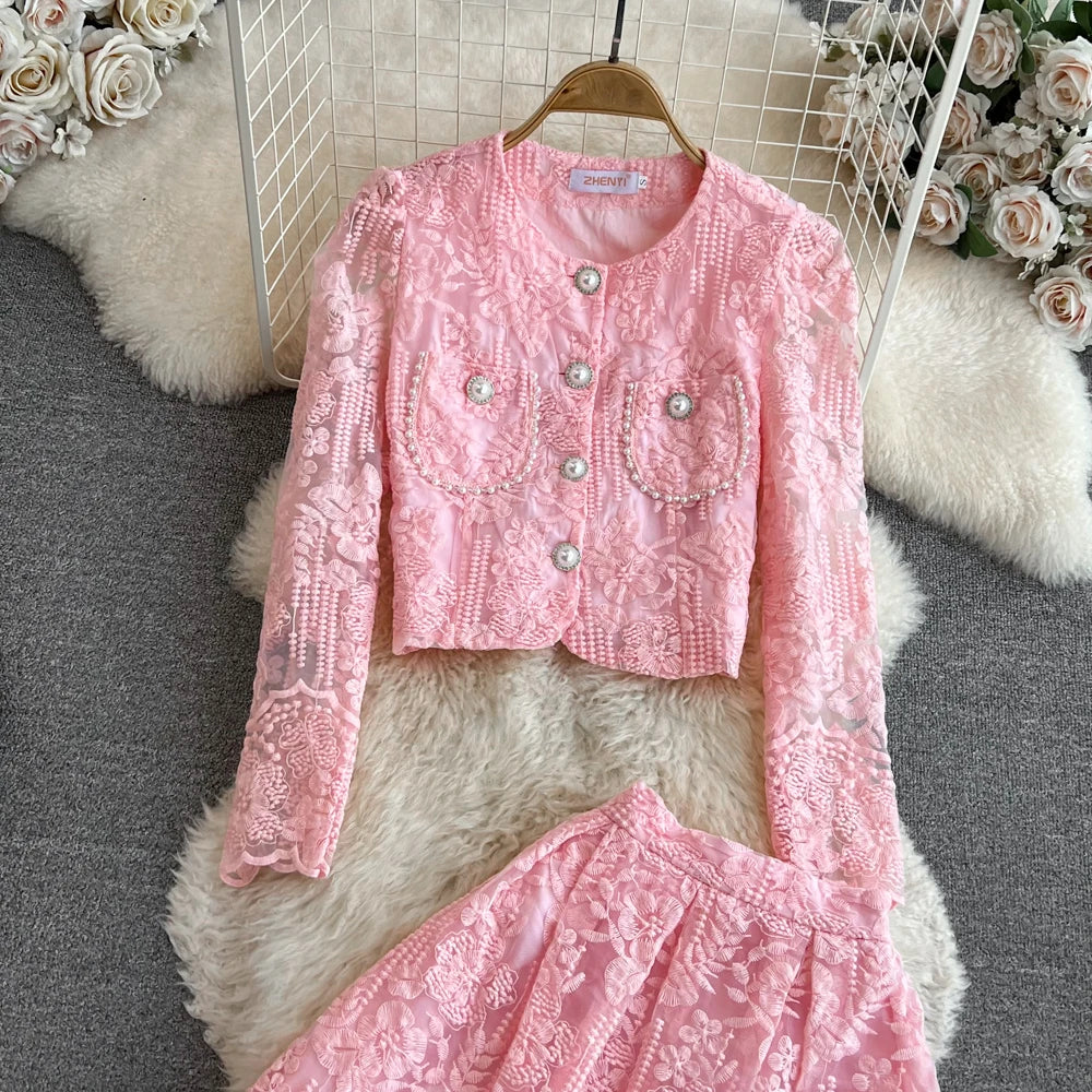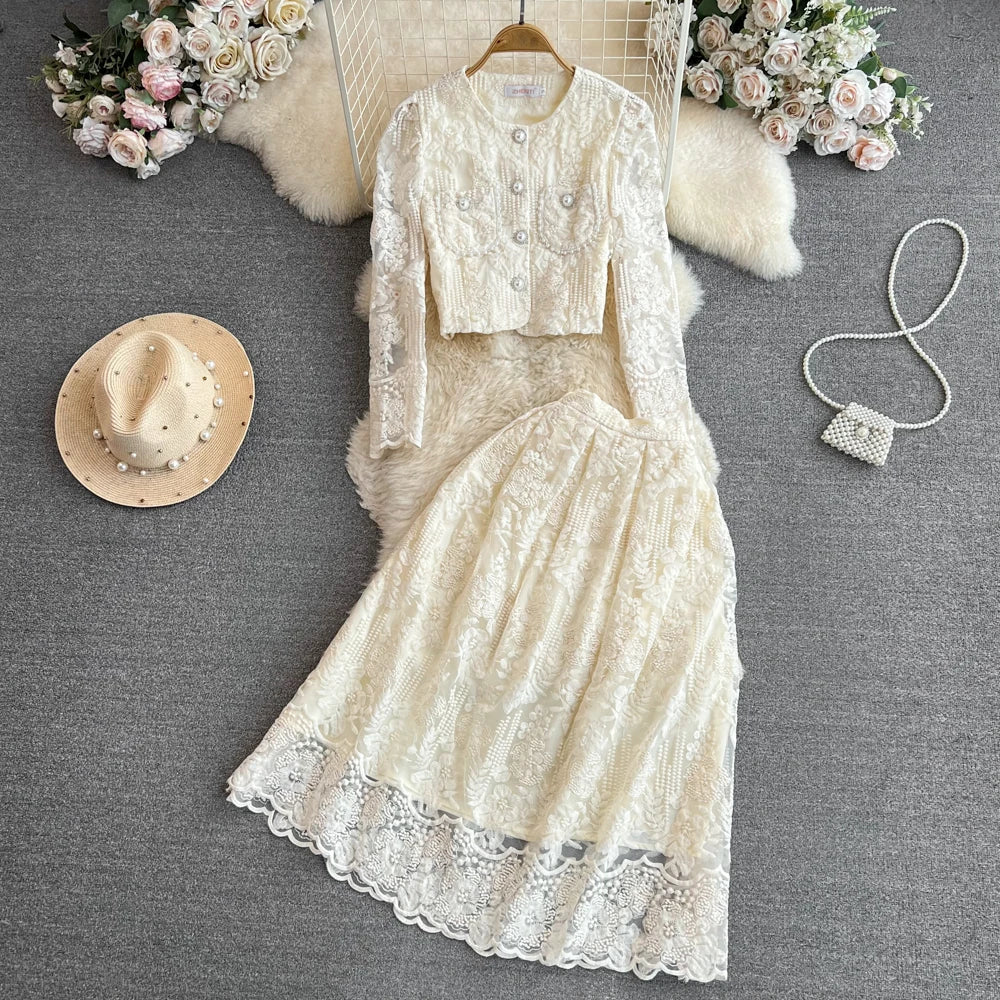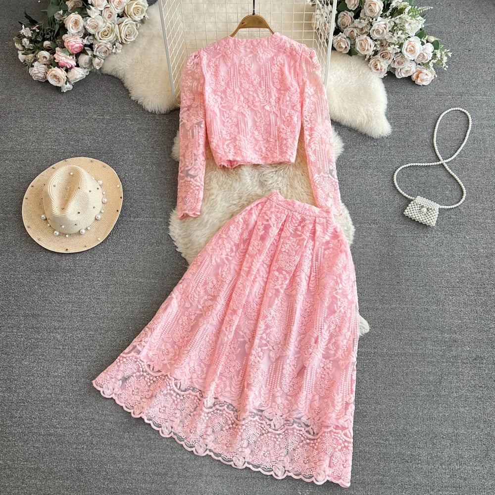 High Quality Floral Embroidery Two Piece Sets Women Suits Elegant OL Long Sleeve Shirt Mid Skirts 2 Piece Outfits Female