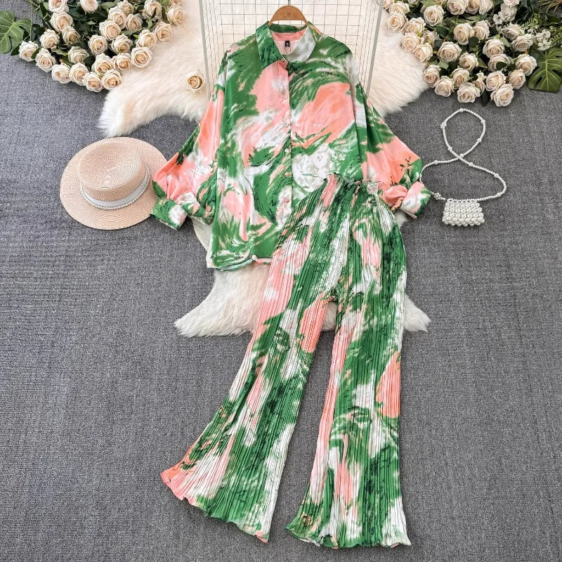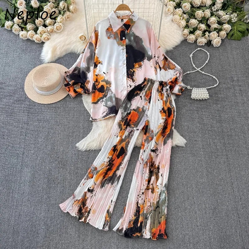 Neploe Fashion Lantern Sleeve Vintage Print Shirts Women+ High Waist Ruched Loose Wide Leg Pants 2024 Summer New Two Piece Sets