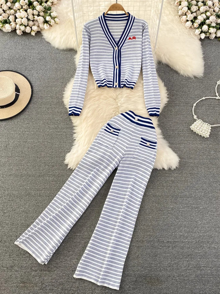 New Autumn Womens Fashion Striped Knitted Sets V-Neck Cardigan Sweater + Casual Stretch-knit Wide-leg Pants Suits Two Piece Sets