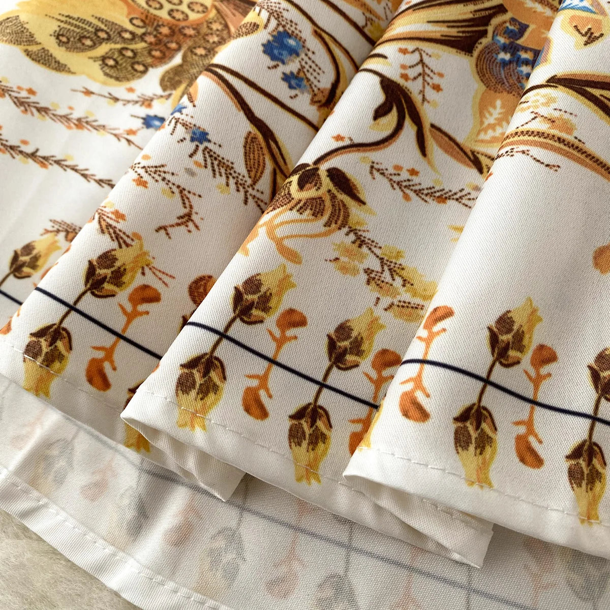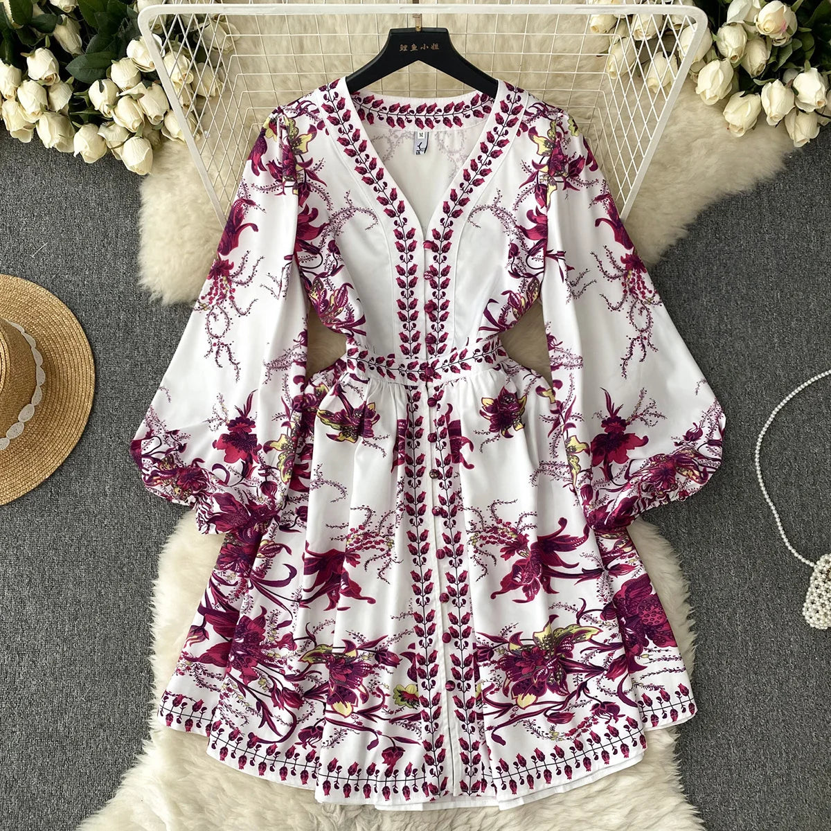 New In Dresses 2023 Fashion Women Clothing Party Elegant Vintage Print Dress Front Button Up V Neck Long Puff Sleeve Mini Dress