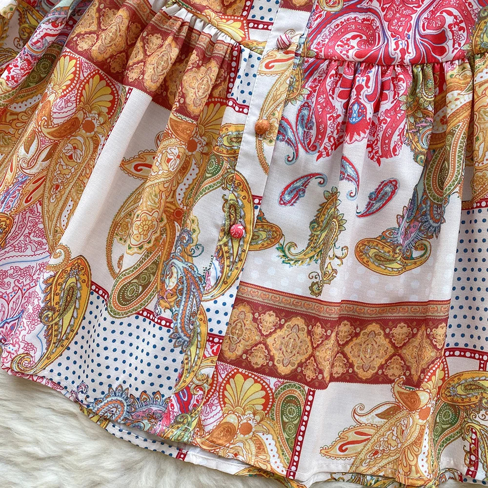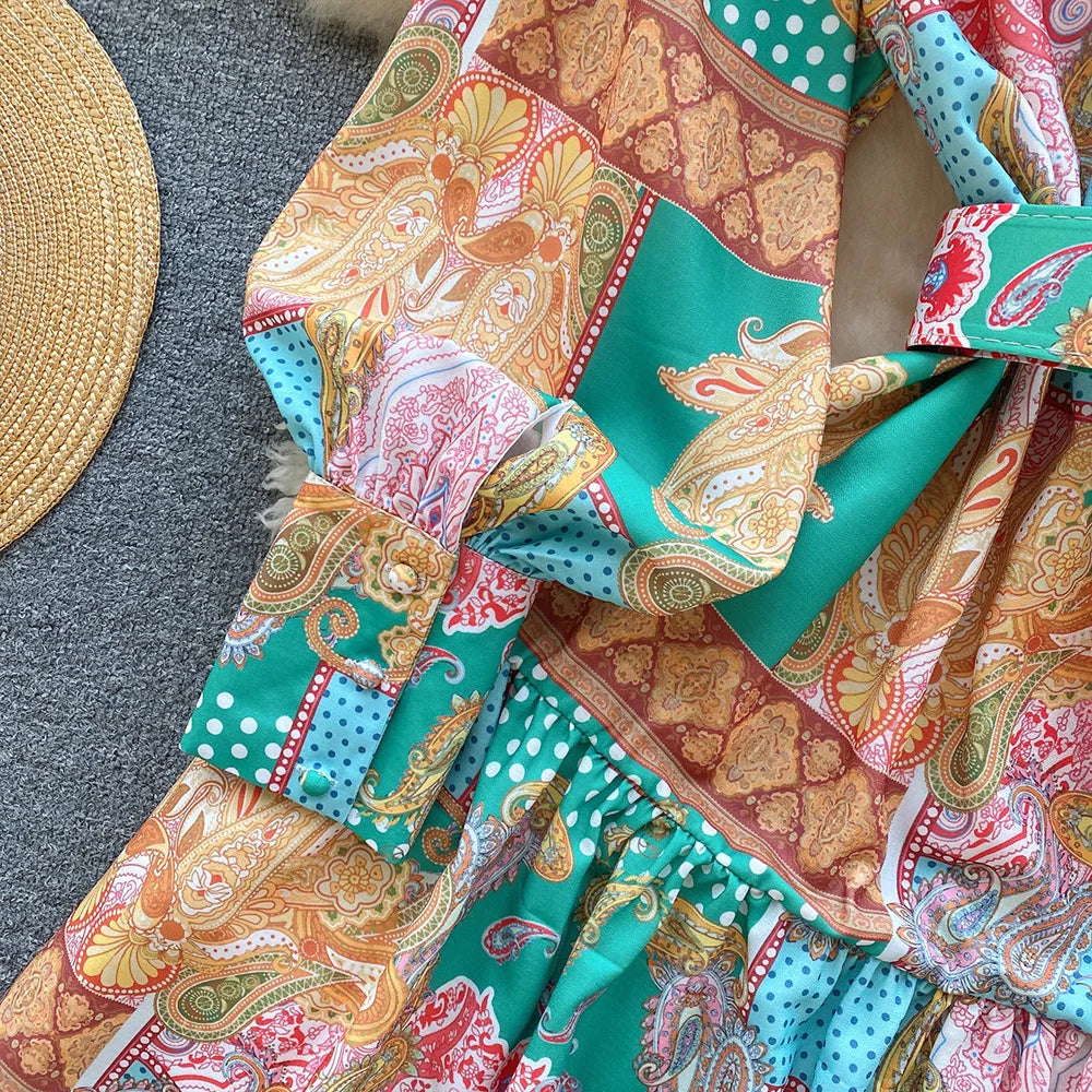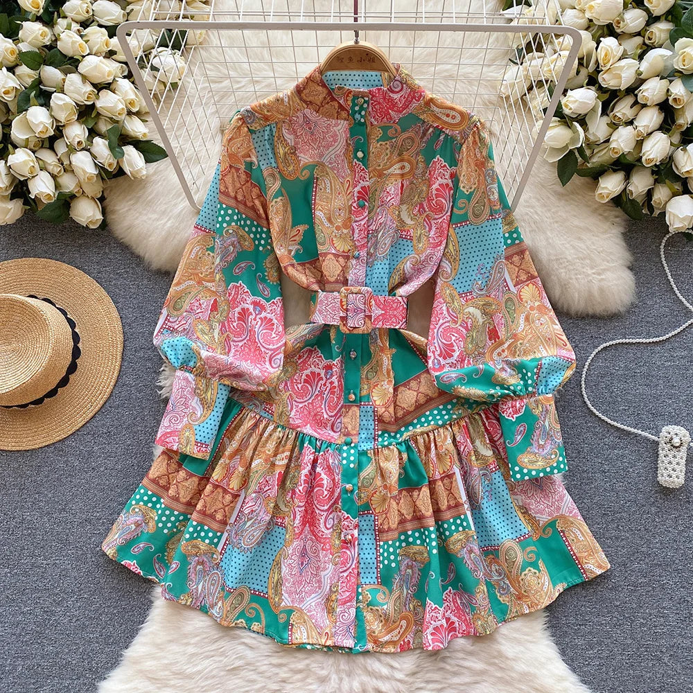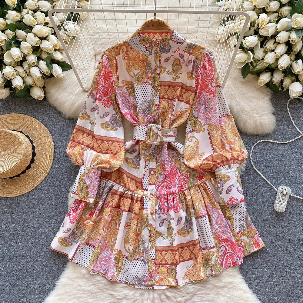New In Dresses 2024 Spring Vintage Paisley Print Vacation Bohemian Dress Women Stand Collar Long Sleeve Mini Dress With Belt