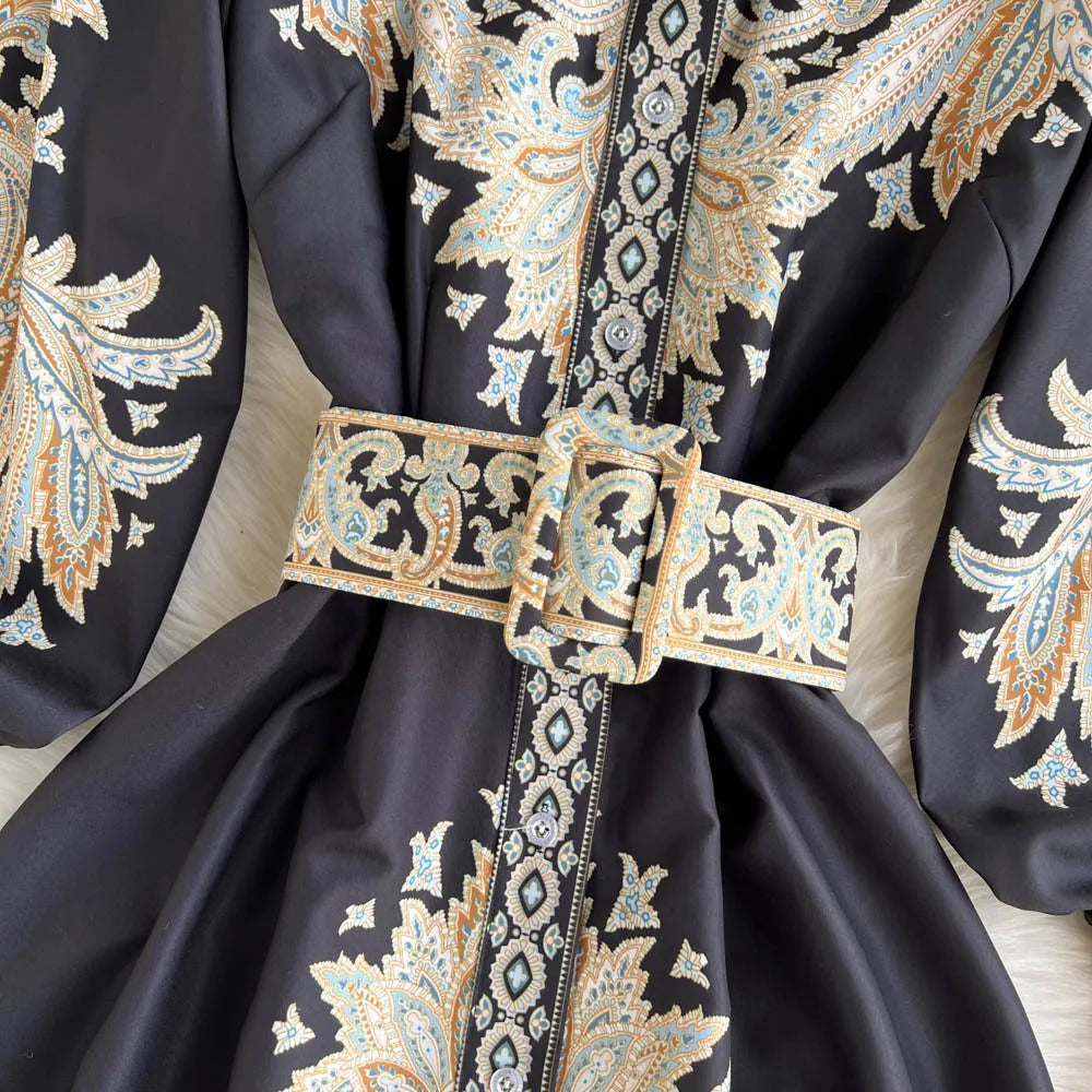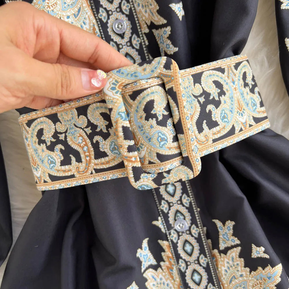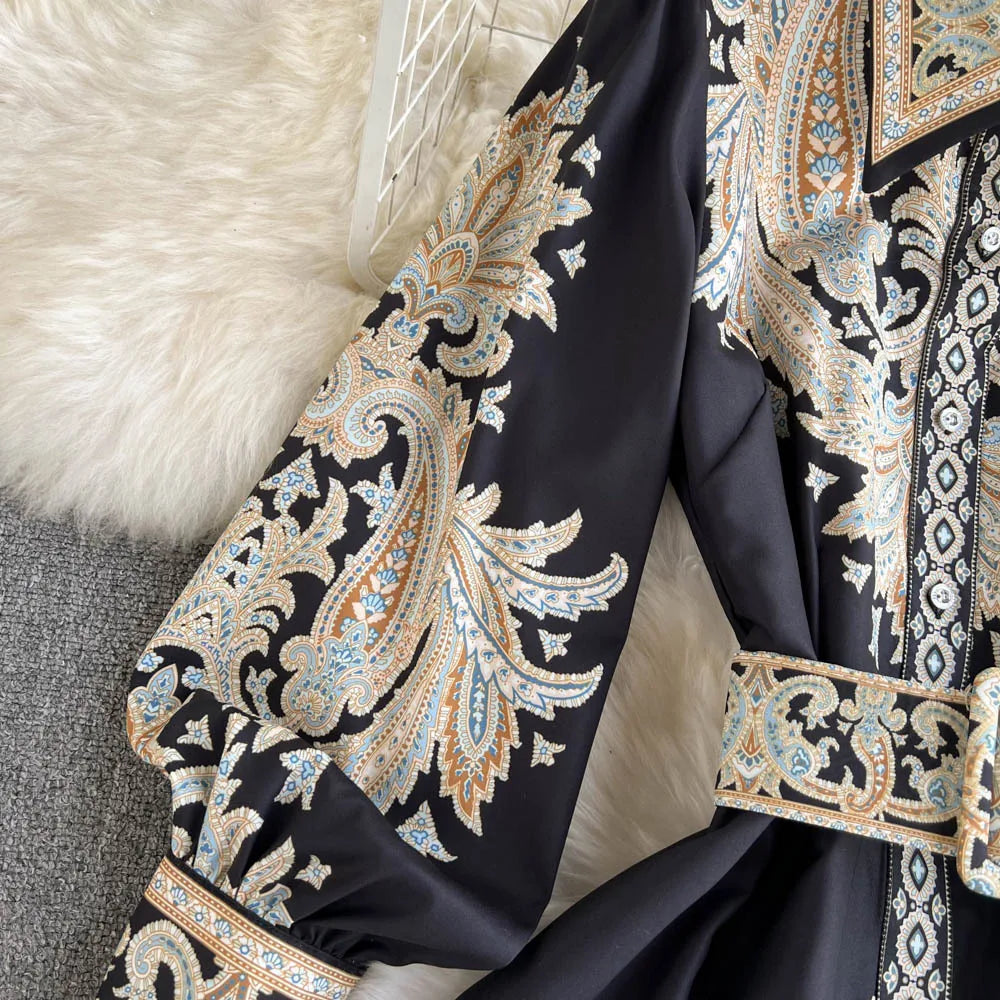 Retro Printed Party Dress Women Polo Collar Long Sleeve Elegant Long Dresses Spring Autumn French Single Breasted Shirt Dress