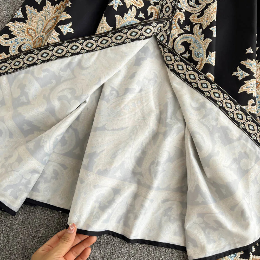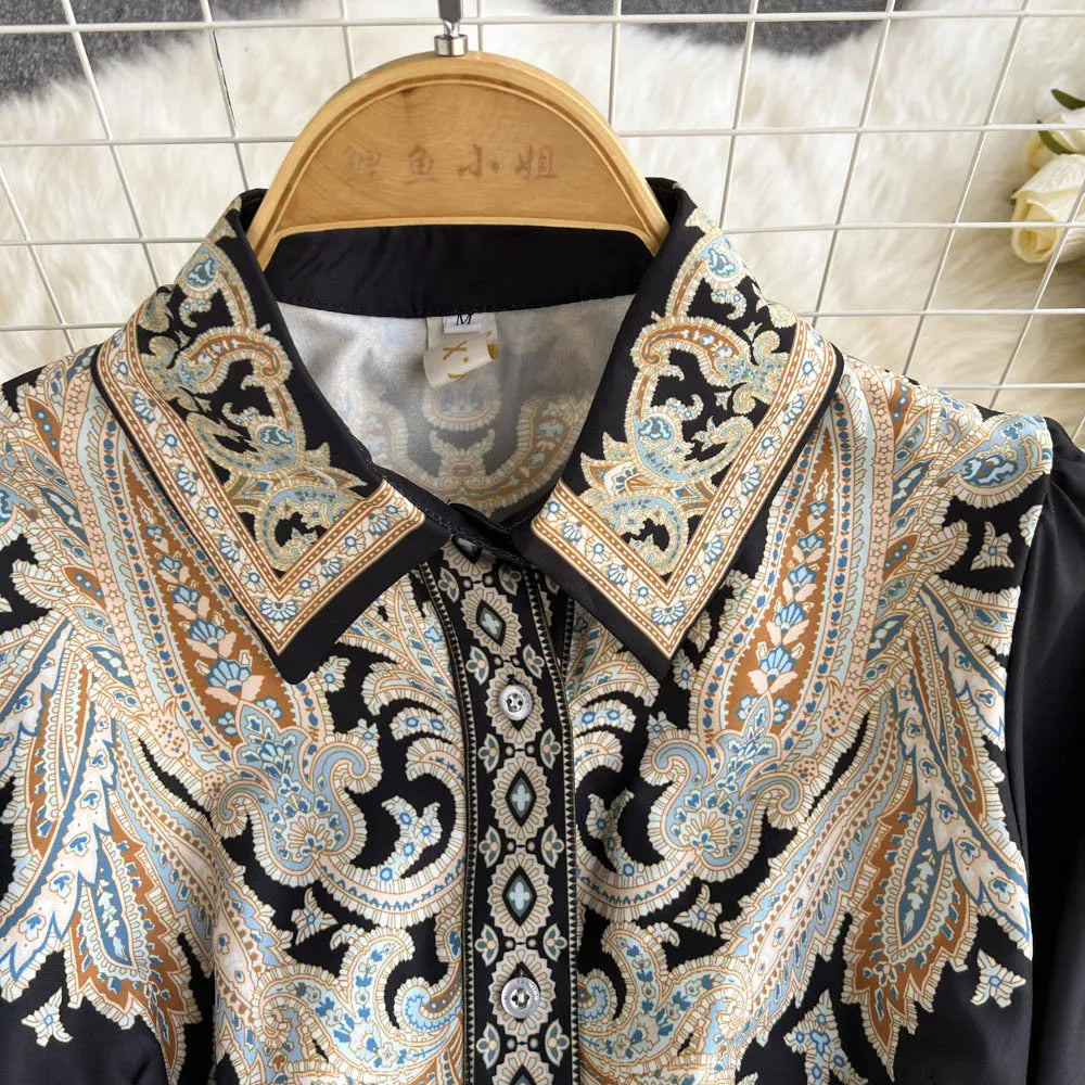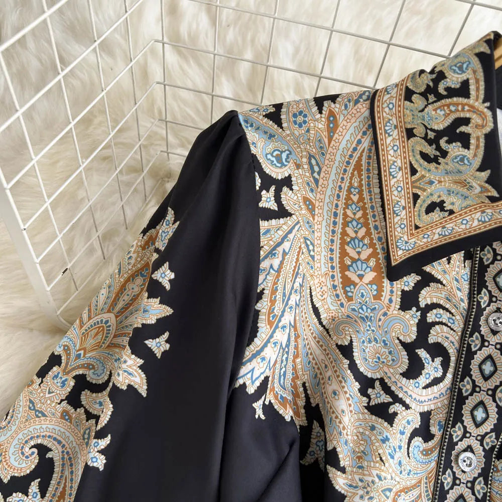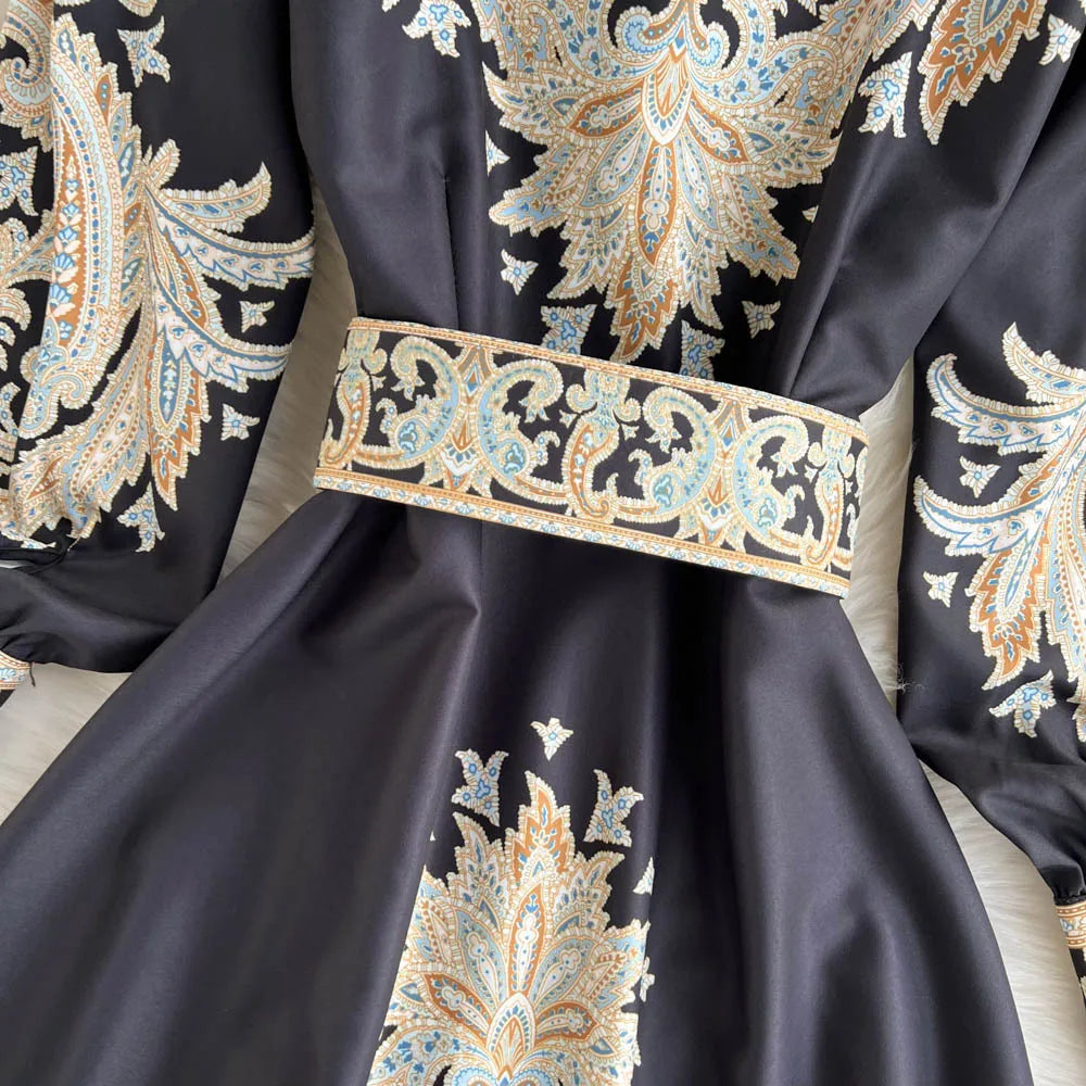 Retro Printed Party Dress Women Polo Collar Long Sleeve Elegant Long Dresses Spring Autumn French Single Breasted Shirt Dress