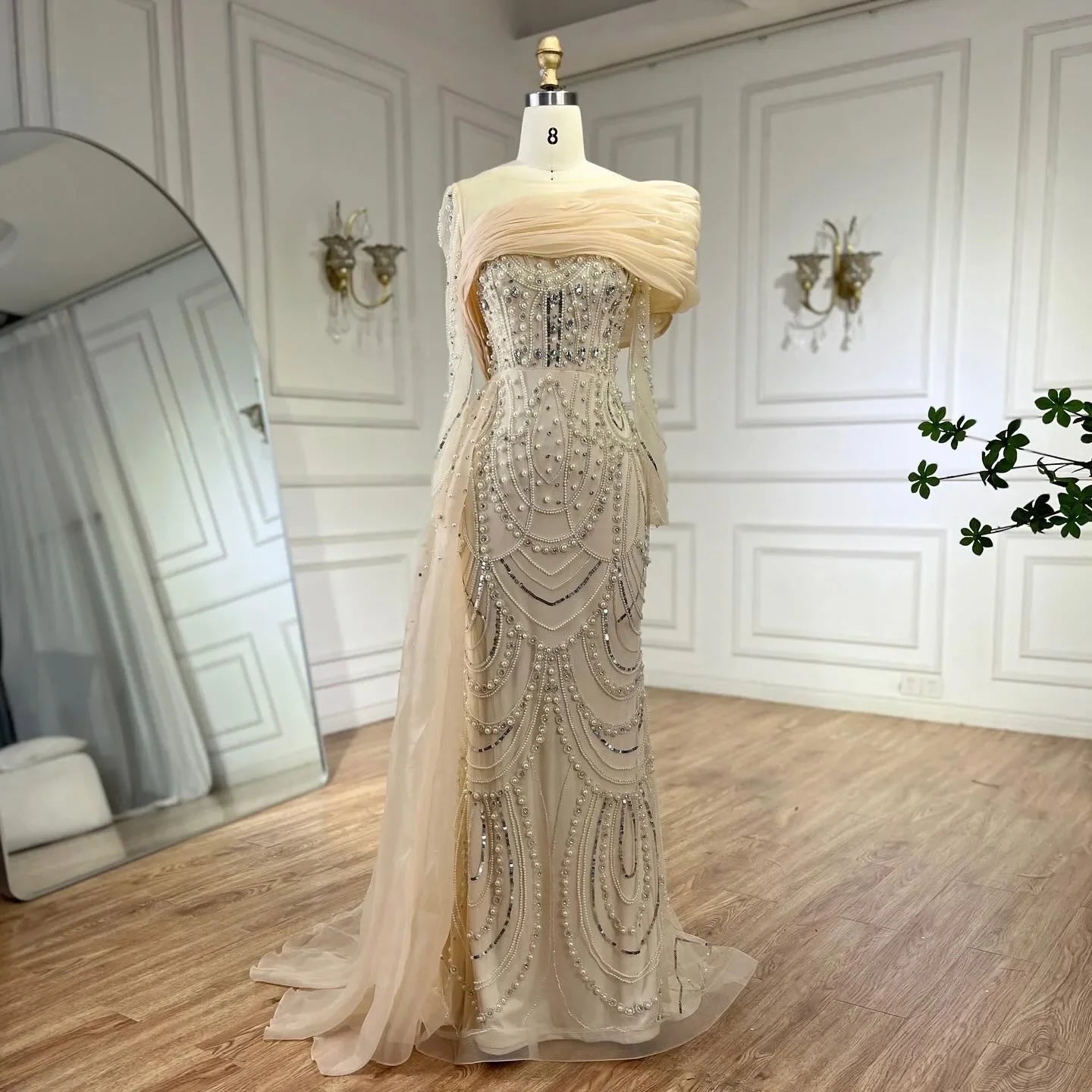 SERENE HILL 2024 Nude Mermaid Luxury Pearls Beaded Evening Dresses Elegant Gowns With Sideskirt Women Wedding Party GLA72348